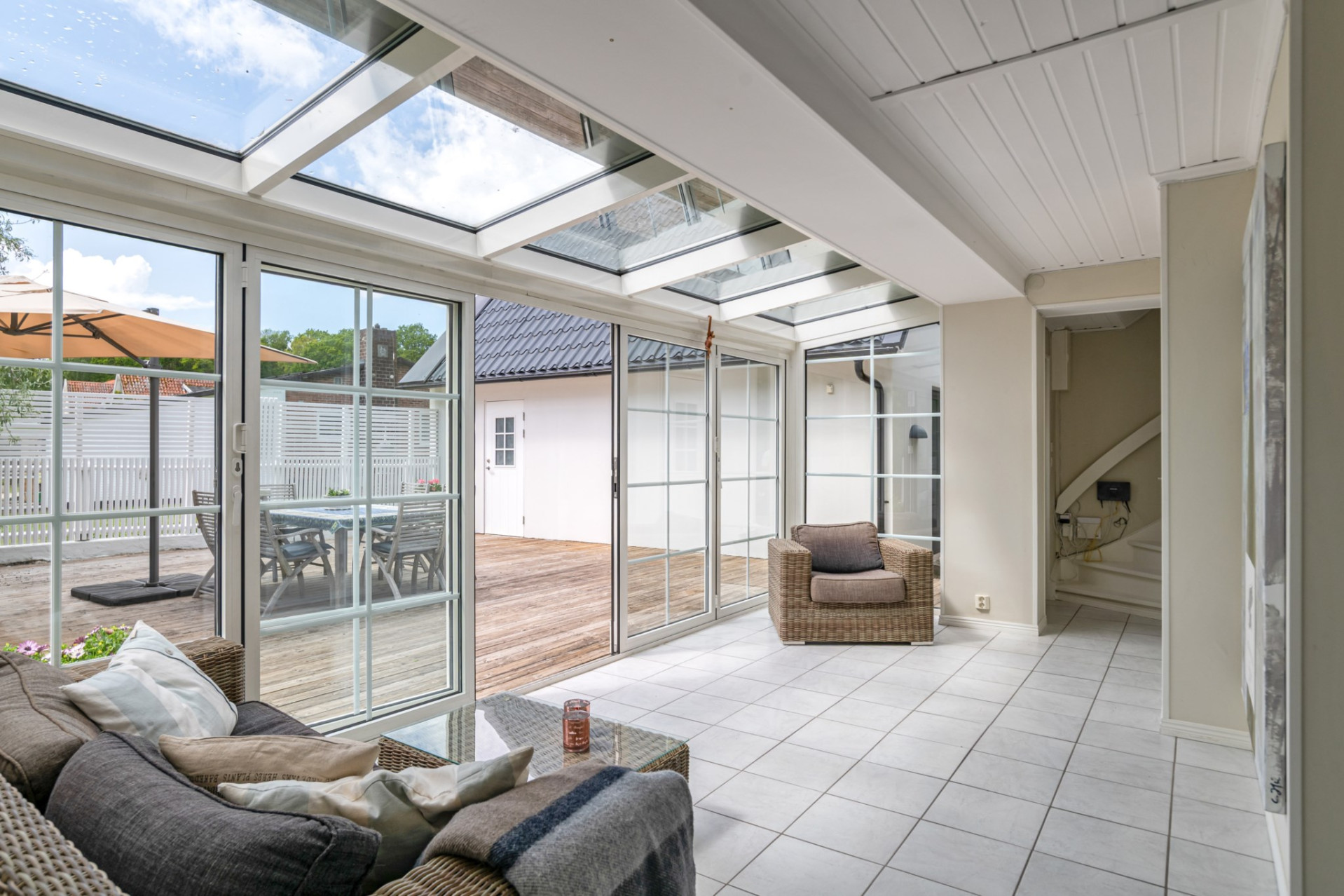 Vidare når ni vinterträdgården som ligger en halv trappa ner från köket. Ljuset flödar fint in genom de stor fönsterpartierna som man under sommarhalvåret gärna öppnar upp ut mot trädäcket. Under vinterhalvåret kan man istället sitta där i en skön fåtölj med en mysig bok och titta ut när snön faller och va ett med naturen.