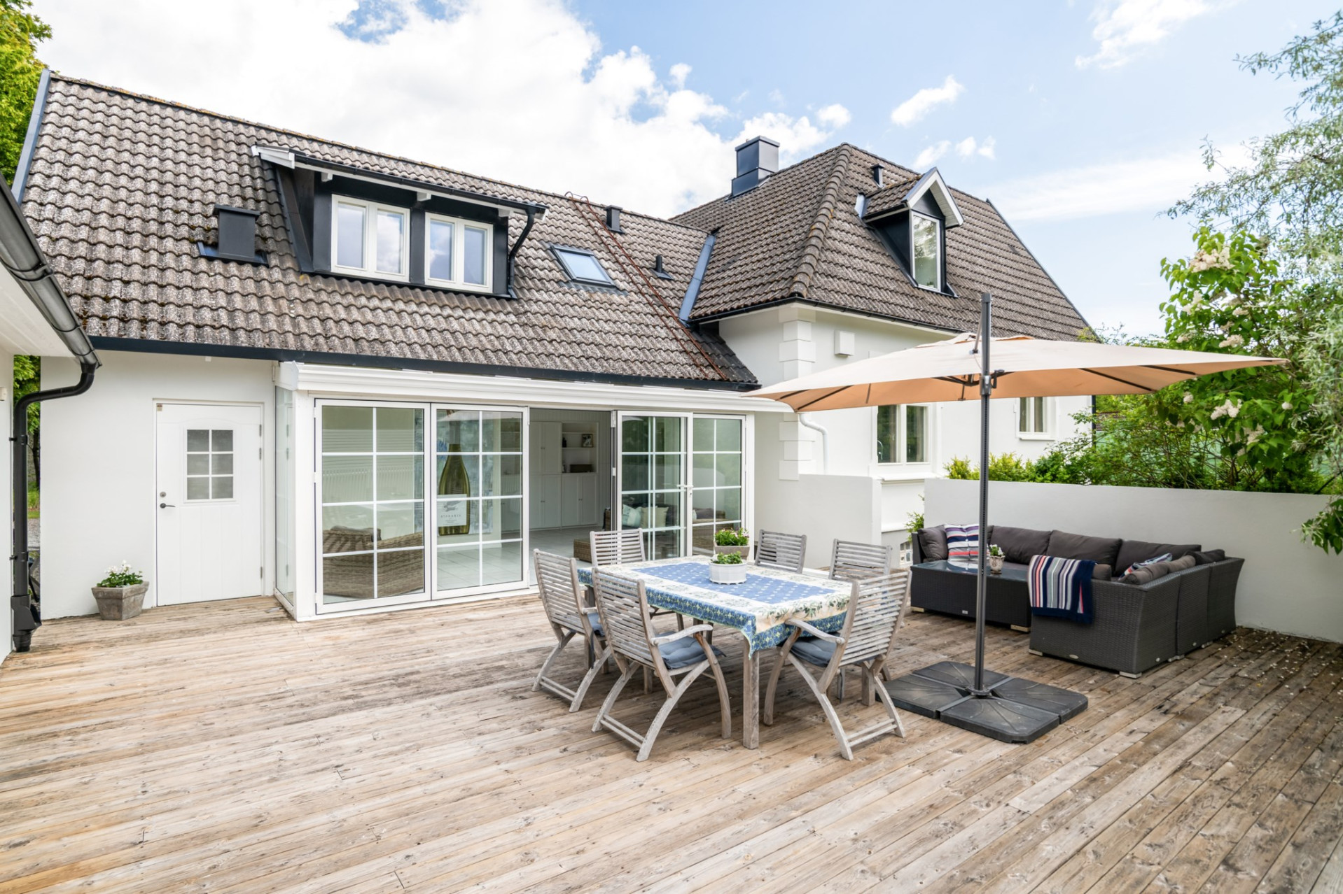 Trädgården ger plats till många härliga uteplatser. En terrass ovanför carporten. Ett stort träddäck som sträcker sig från vinterträdgården till staketet - med en doft från vita syrener i en privat atmosfär kan ni både koppla av och slå till med många och långa middagar för vänner och familj! Det finns även fruktträd såsom körsbärsträd och plommonträd, grillplats under trädet mot skogen och en enormt stor härliga gräsmattan - perfekt att leka på!