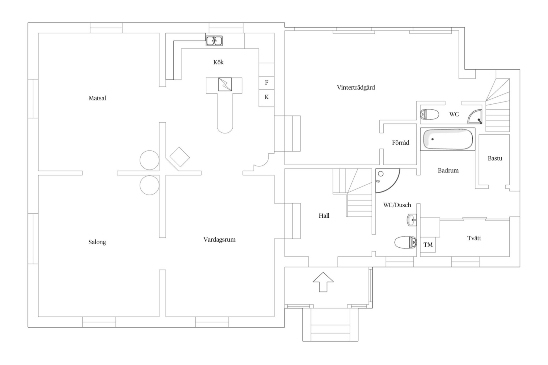 I ena änden av vinterträdgården finns ytterligare en ytterdörr. Detta gör det praktiskt för den som har eget företag. Det finns även en gästtoalett i anslutning till hallen. Hallen leder sedan vidare mot en trappa upp mot en del av ovanvåningen. Perfekt för ett stort kontor, ateljé eller varför inte som ett tonårsrum. En egen ingång, ett stort allrum och ett sovrum, vad mer kan en tonåring önska?
