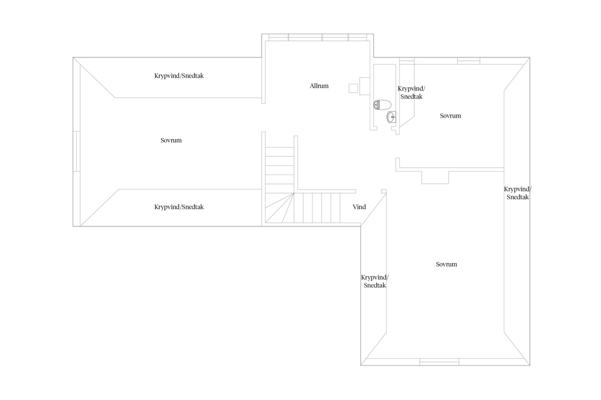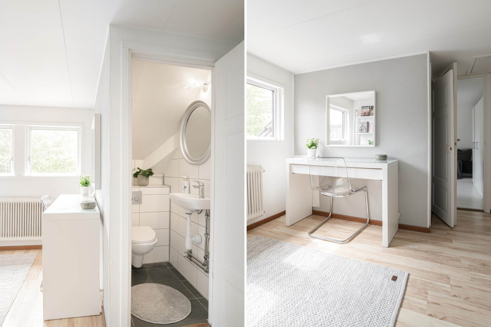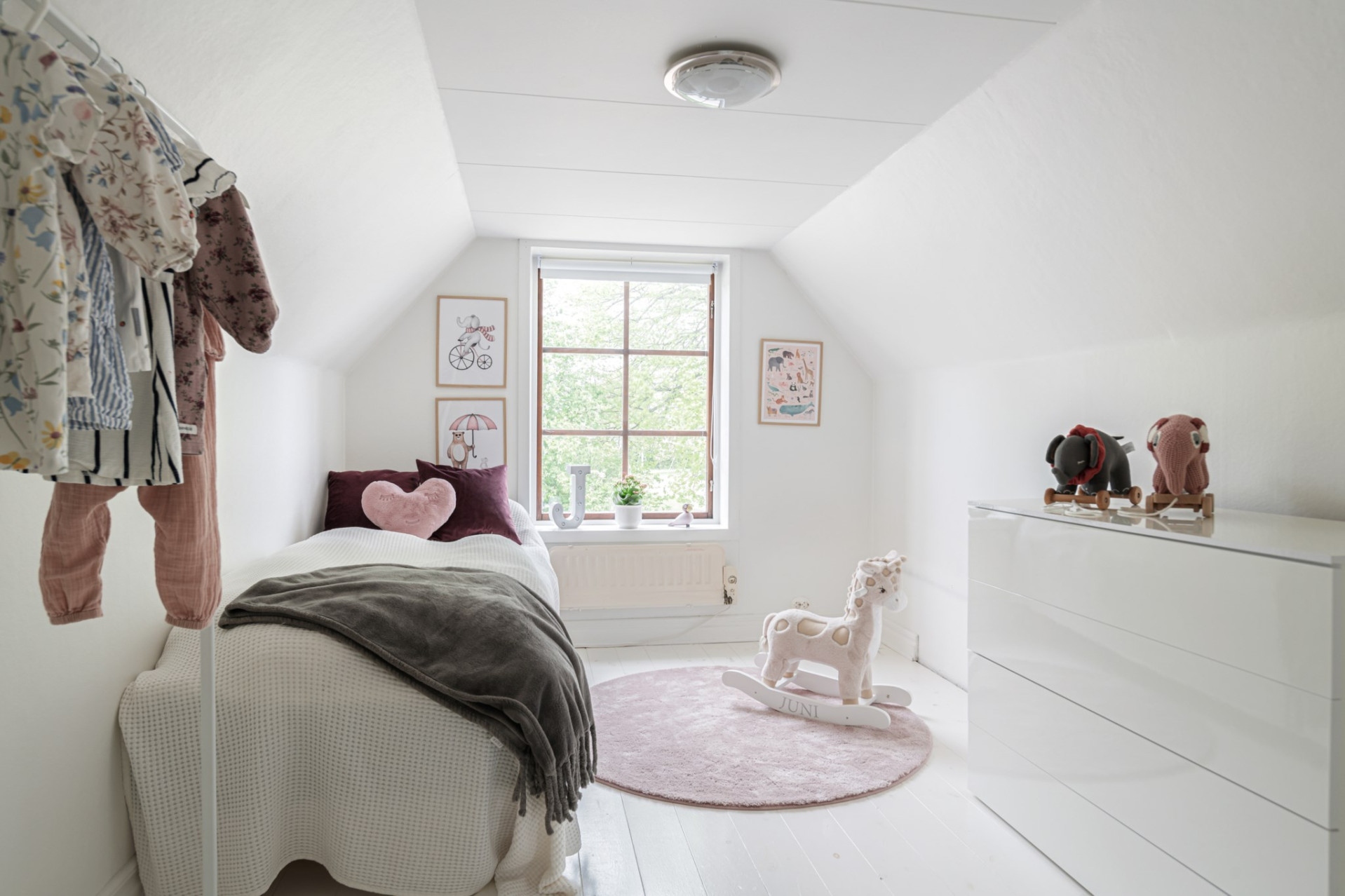 En våning upp finner ni den mer privata delen med ett litet allrum/hall som är öppet ut mot trappan. Målade vita väggar och ljust plankgolv som är genomgående för ovanvåningen.