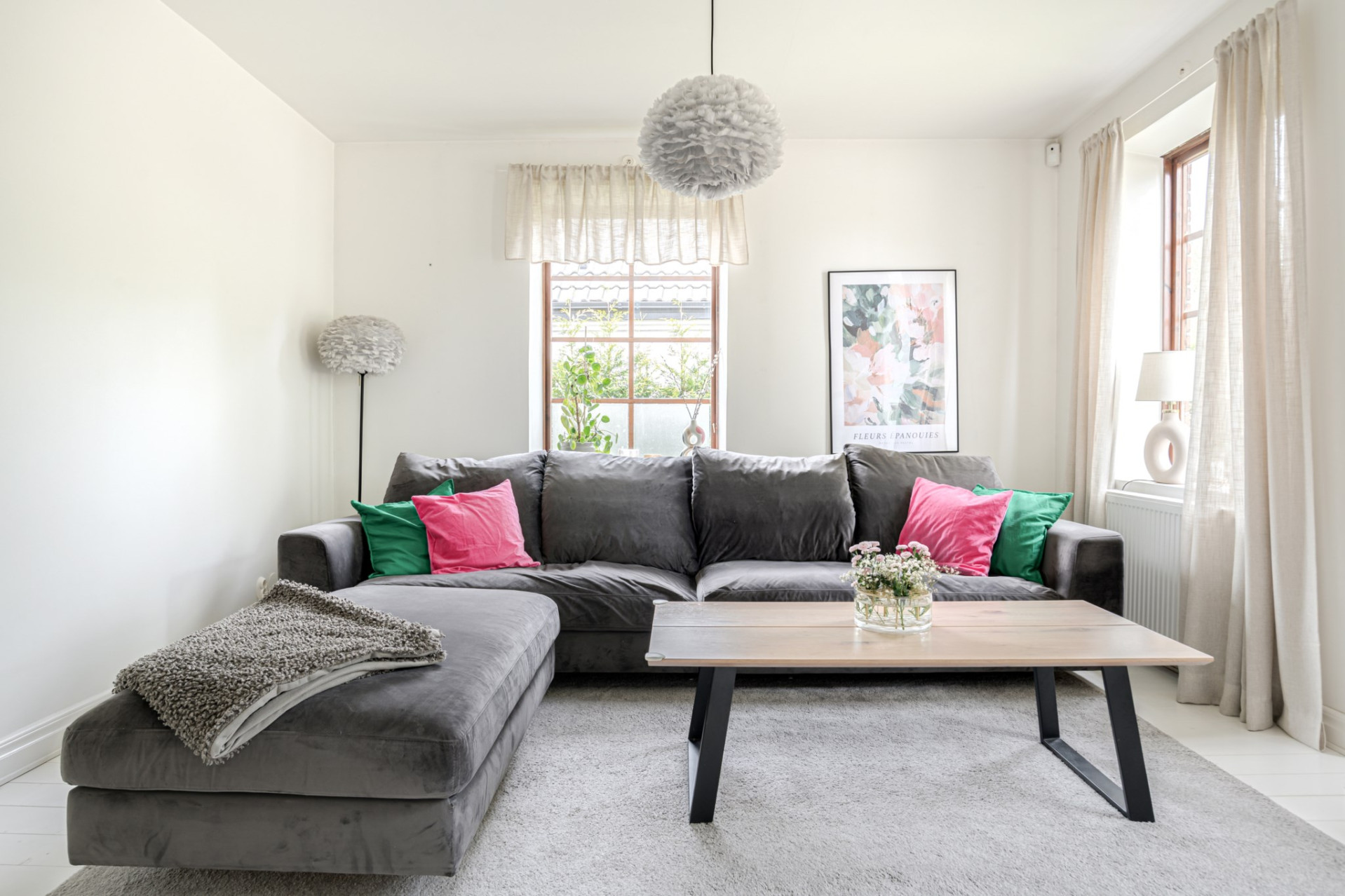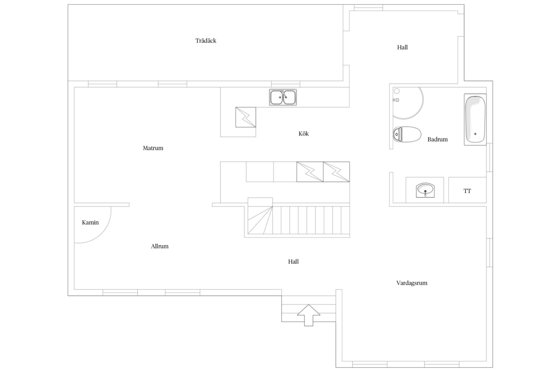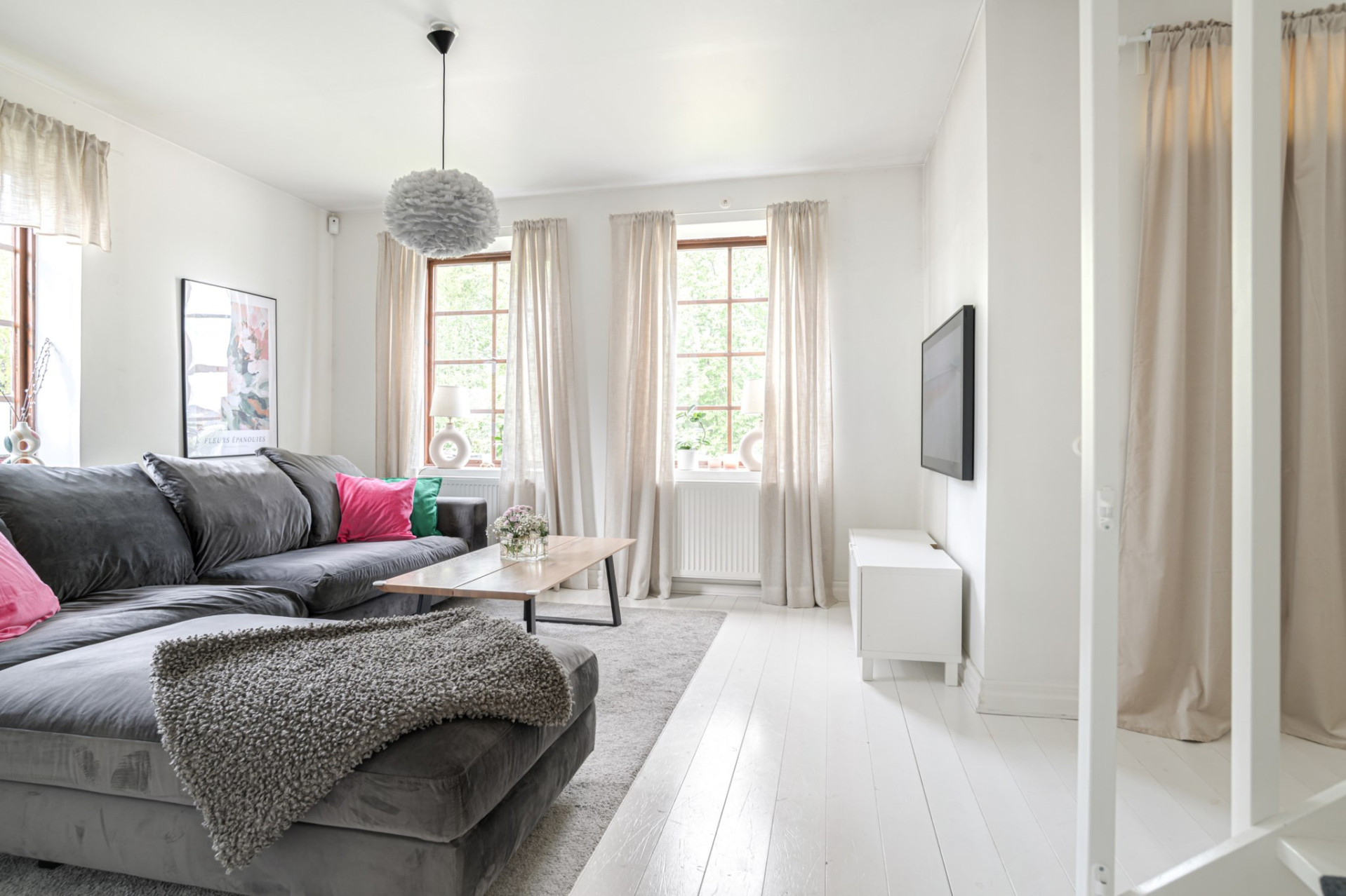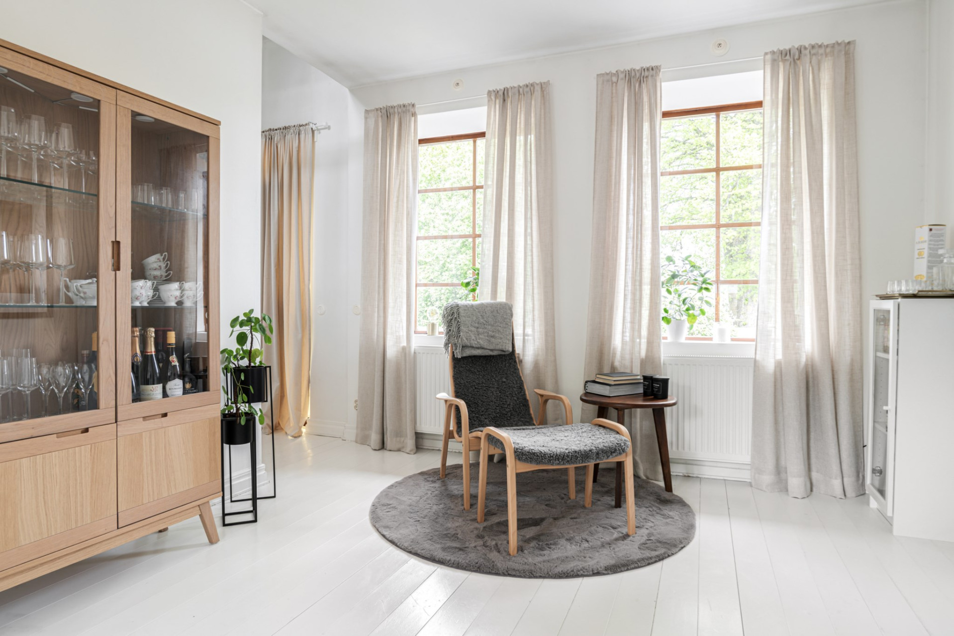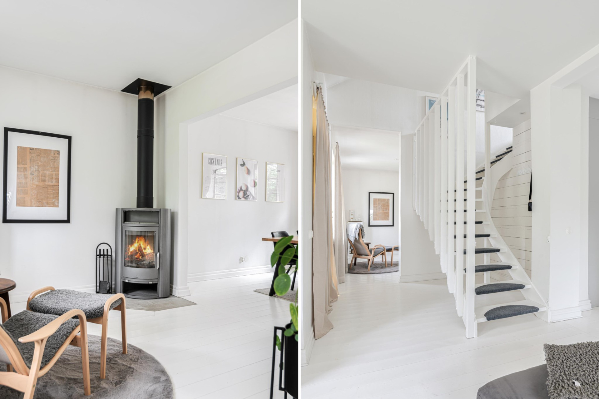Intill köket öppnar sig ett härligt allrum med kamin som skapar en varm och en inbjudande atmosfär. Vidare förbi trappan har du vardagsrummet som ger gott om plats för både stor soffgrupp och tillhörande möbler. Vitmålade väggar och ljust plankgolv. Den påtagliga takhöjden och de stora fönsterna med en äldre karaktär med spröjs bidrar till hela nedan våningens magiska känsla!