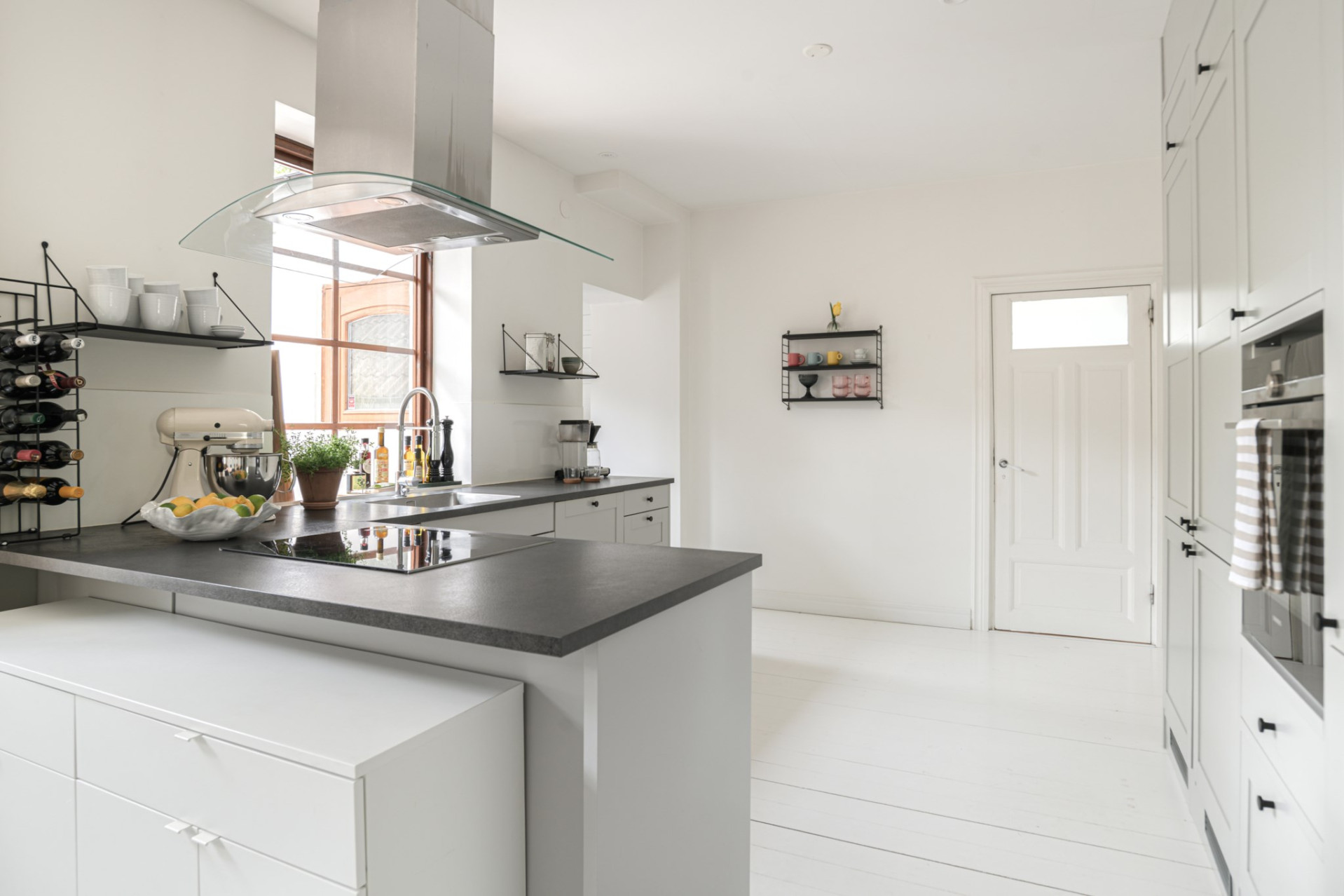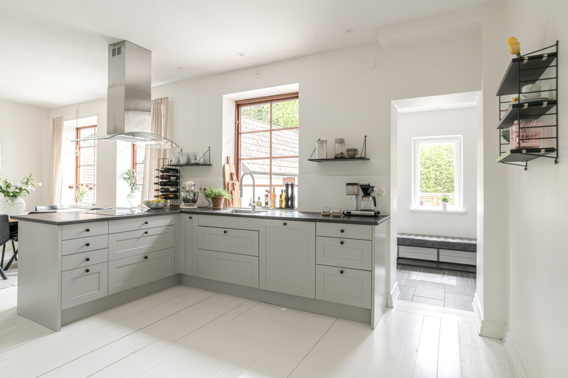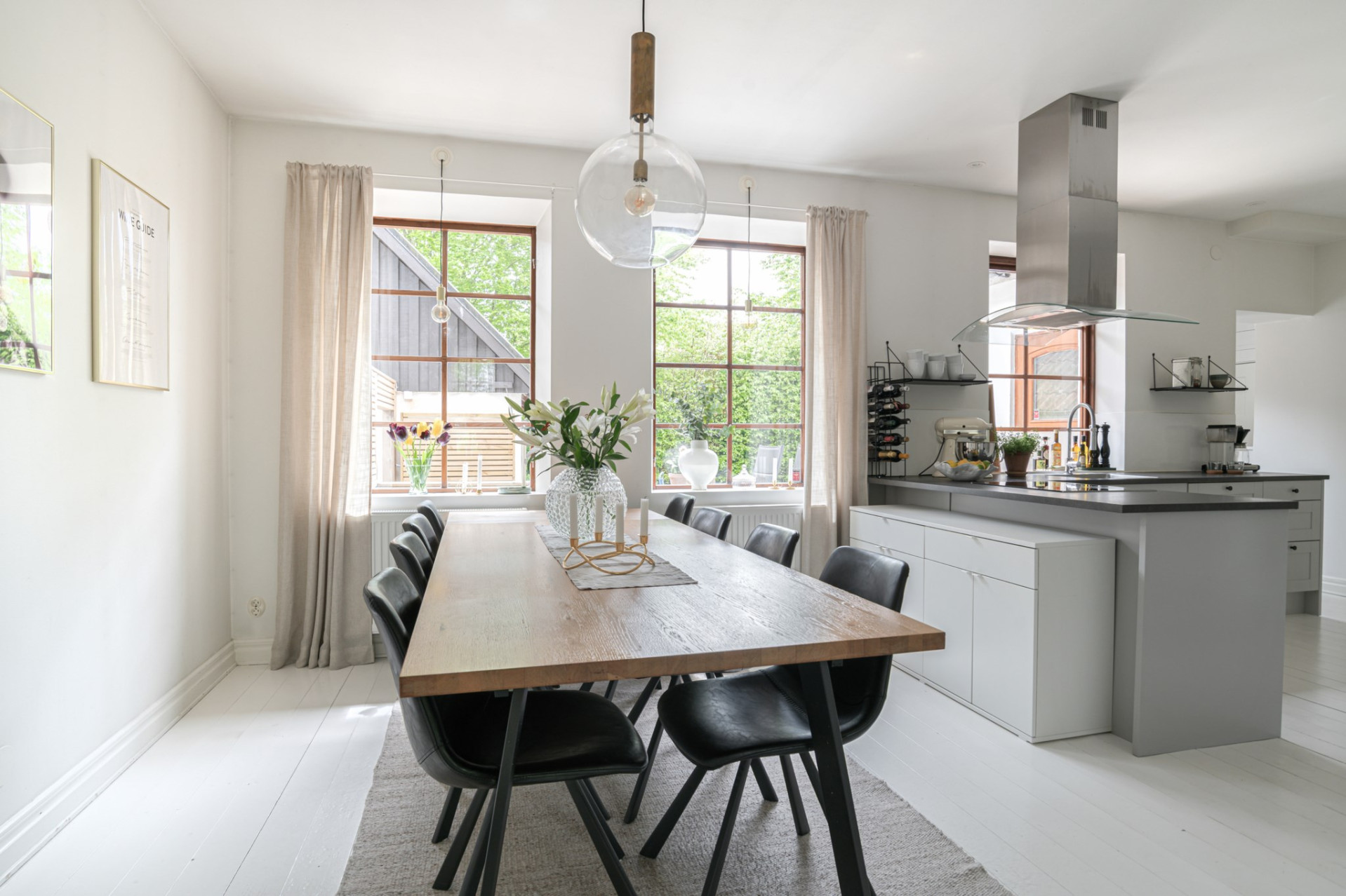 Vidare når ni det inbjudande köket som flödar av ljus och rymd med en generös takhöjd. Köket är stort och besmyckat med stilrena luckor i grått och bänkskiva i laminat och erbjuder god förvaring och stora arbetsytor. Maskinparken består av inbyggd diskmaskin, mikro, fläkt, induktionshäll, varmluftsugn, dubbla integrerade kyl och frys - lyx! Målade vita väggar och ljusa plankgolv är genomgående för resten av huset. Matplatsen ligger i öppen anslutning vilket bjuder in till en social och lättsam stämning!