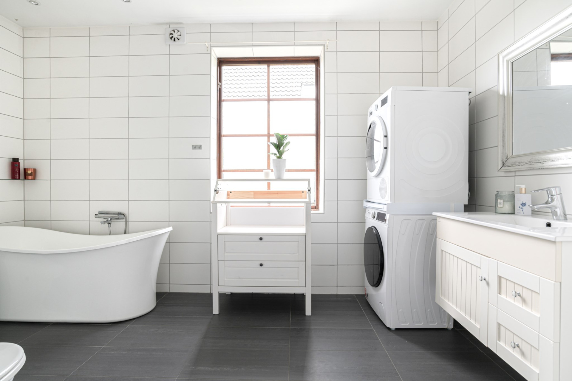 Badrummet är otroligt stort och smakfullt! Helkaklat i vitt och mörkt klinkergolv. Här finns både dusch och ett härligt modernt badkar, handfat med kommod och toalett. Det finns också gott om plats för förvaring om så önskas. Utrustat med praktisk tvättmaskin (2024) och torktumlare.