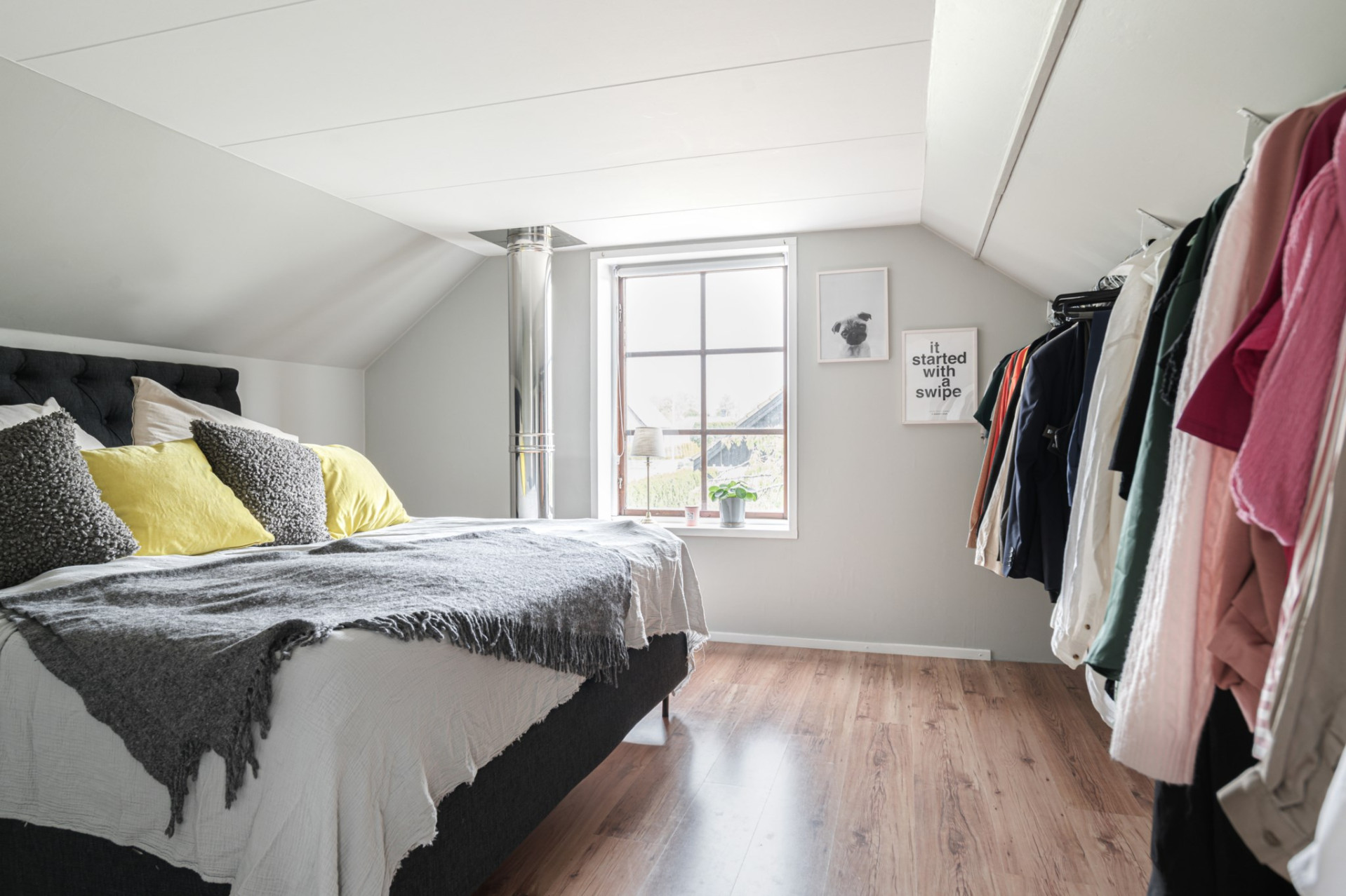 Sovrum 1 - Stort sovrum med gott om plats för dubbelsäng med tillhörande sängmöbler. Öppen klädstång för förvaringsmöjligheter.