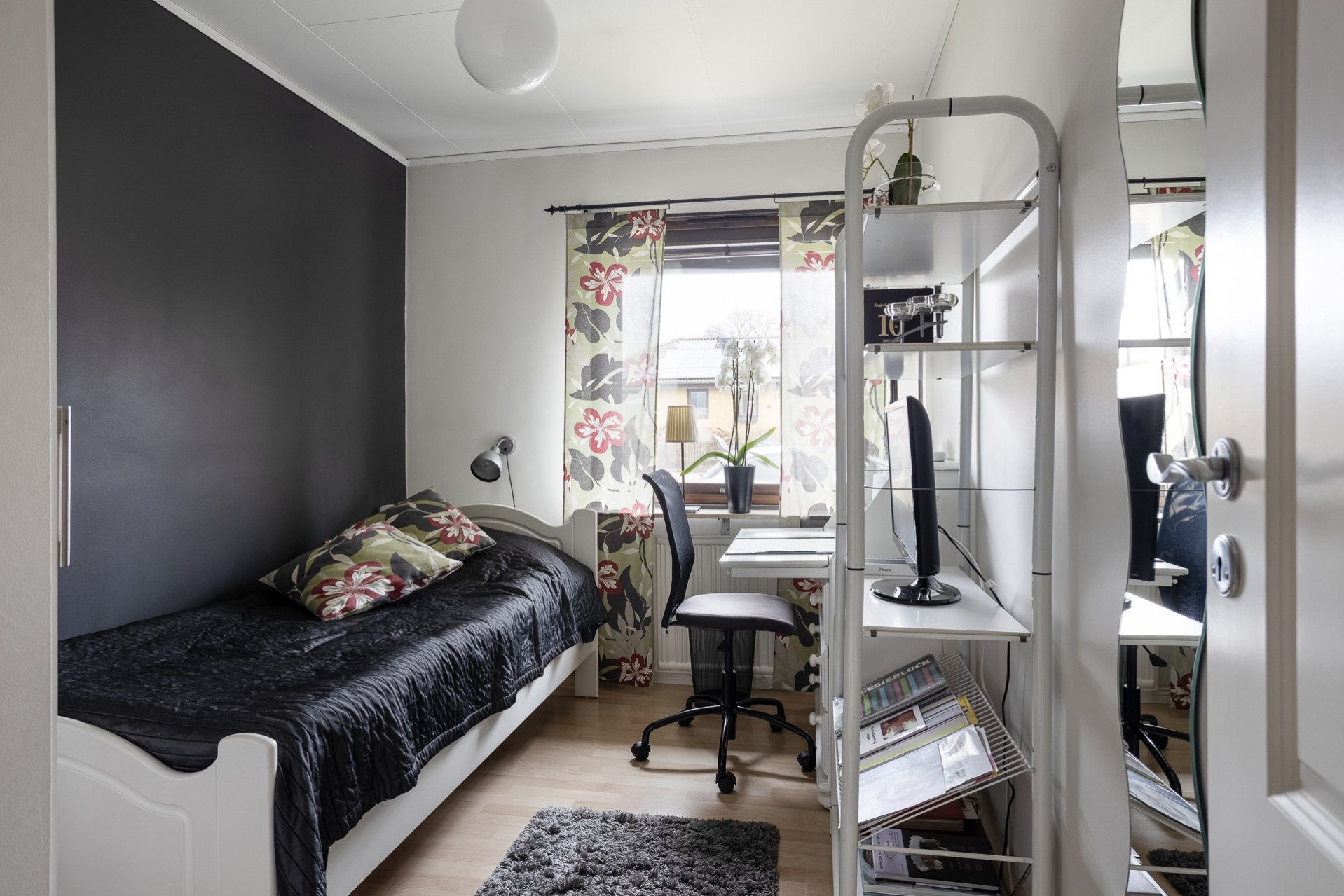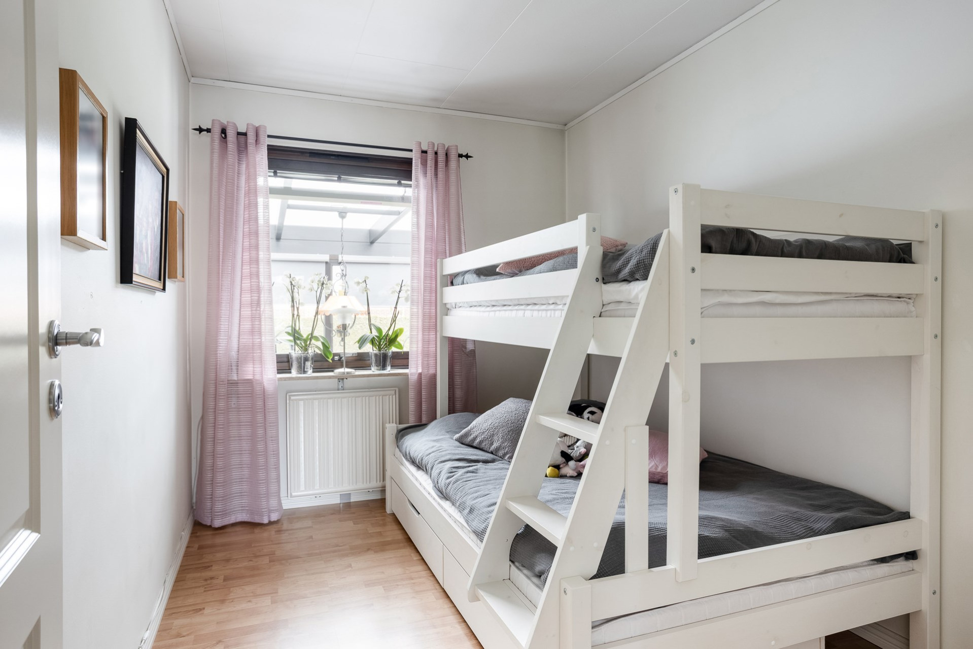 Via innerhallen når man den mer privata delen av huset med fyra sovrum – optimalt för den växande familjen. Samtliga sovrum har laminatgolv och ett av rummen har dessutom egen klädkammare. I anslutning finns två fräscha, helkaklade badrum som renoverades 2007. Det större badrummet har badkar och fönster, medan det andra erbjuder dusch – en perfekt lösning för familjens morgonstress och lugna kvällsrutiner.