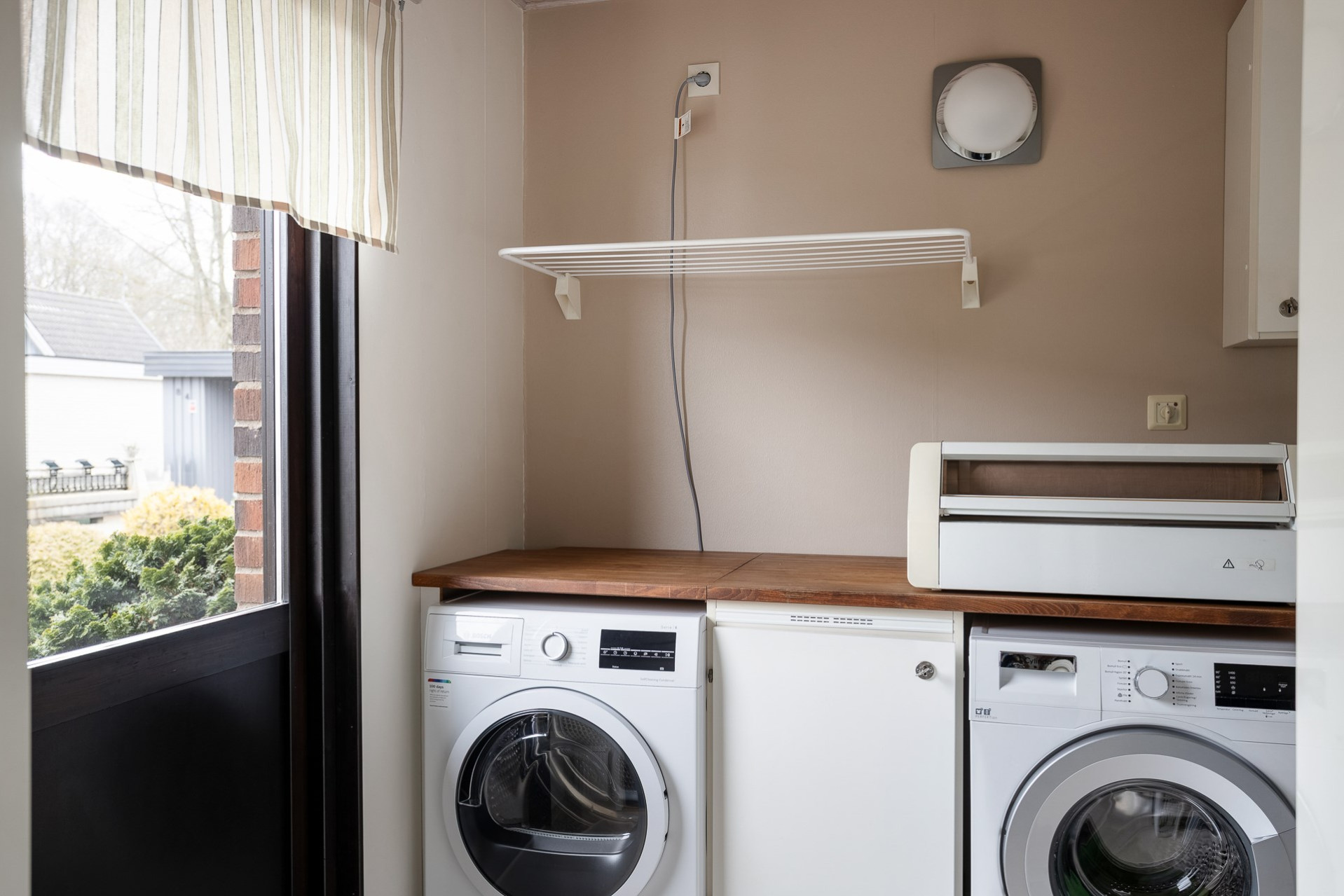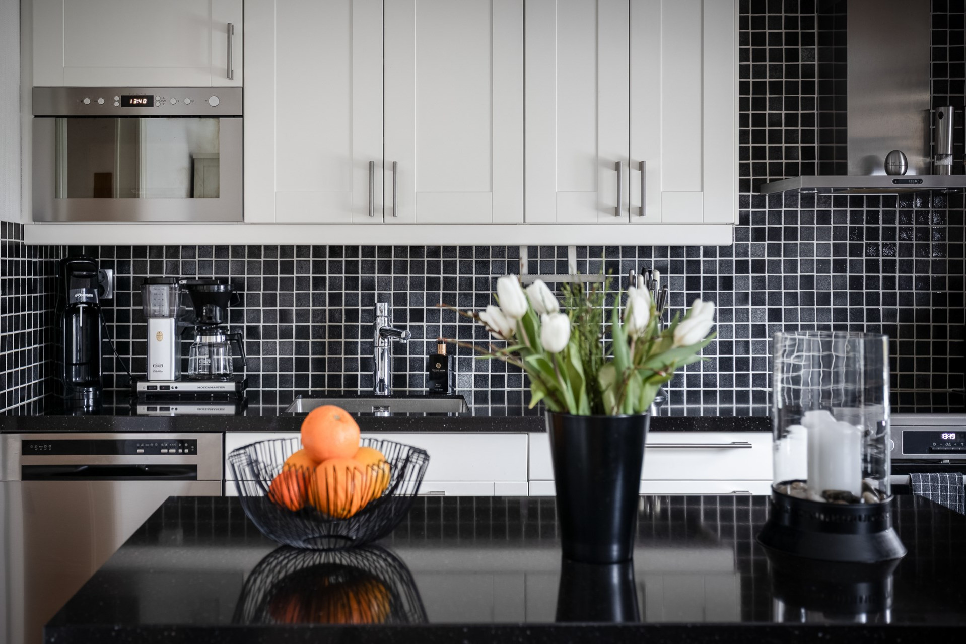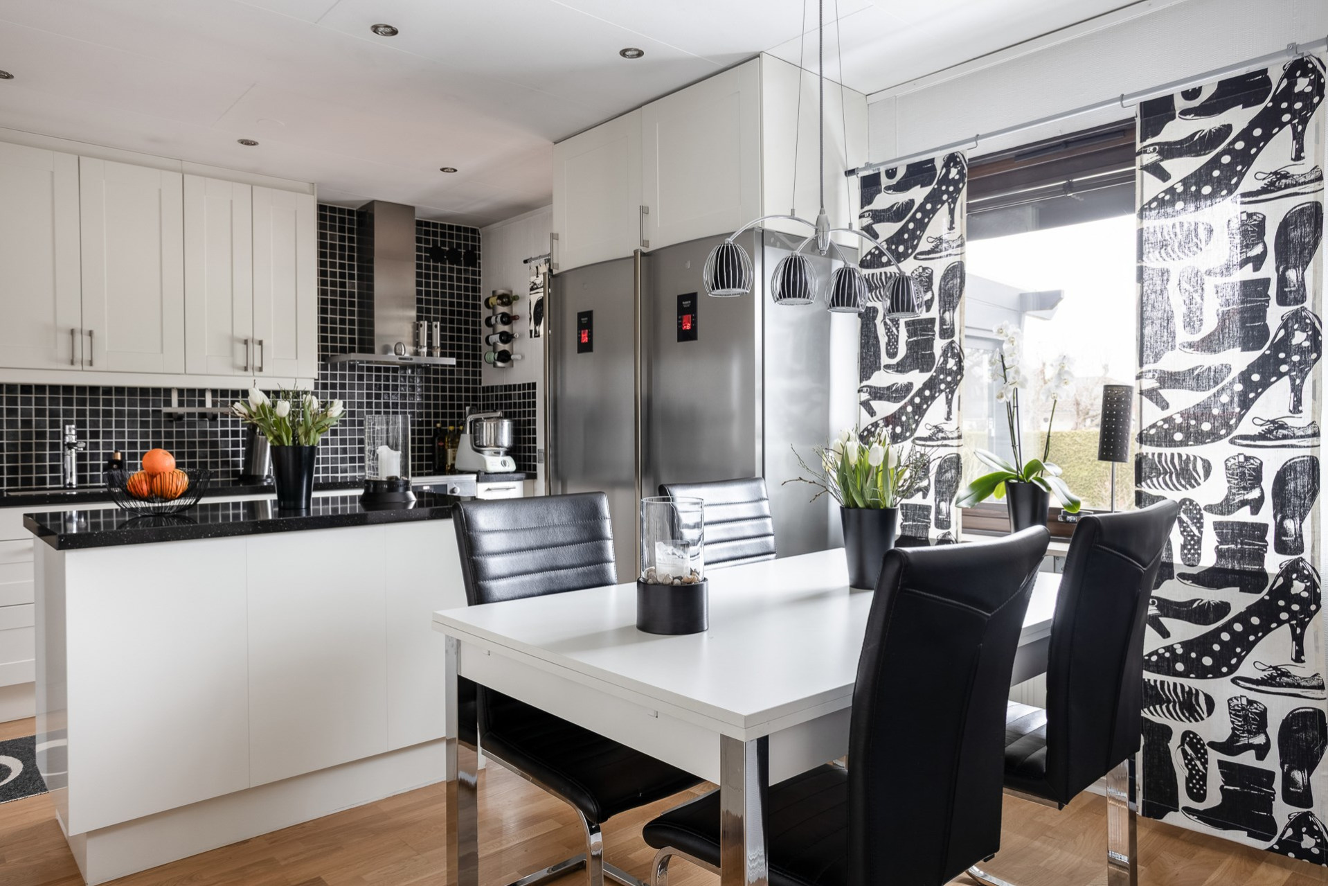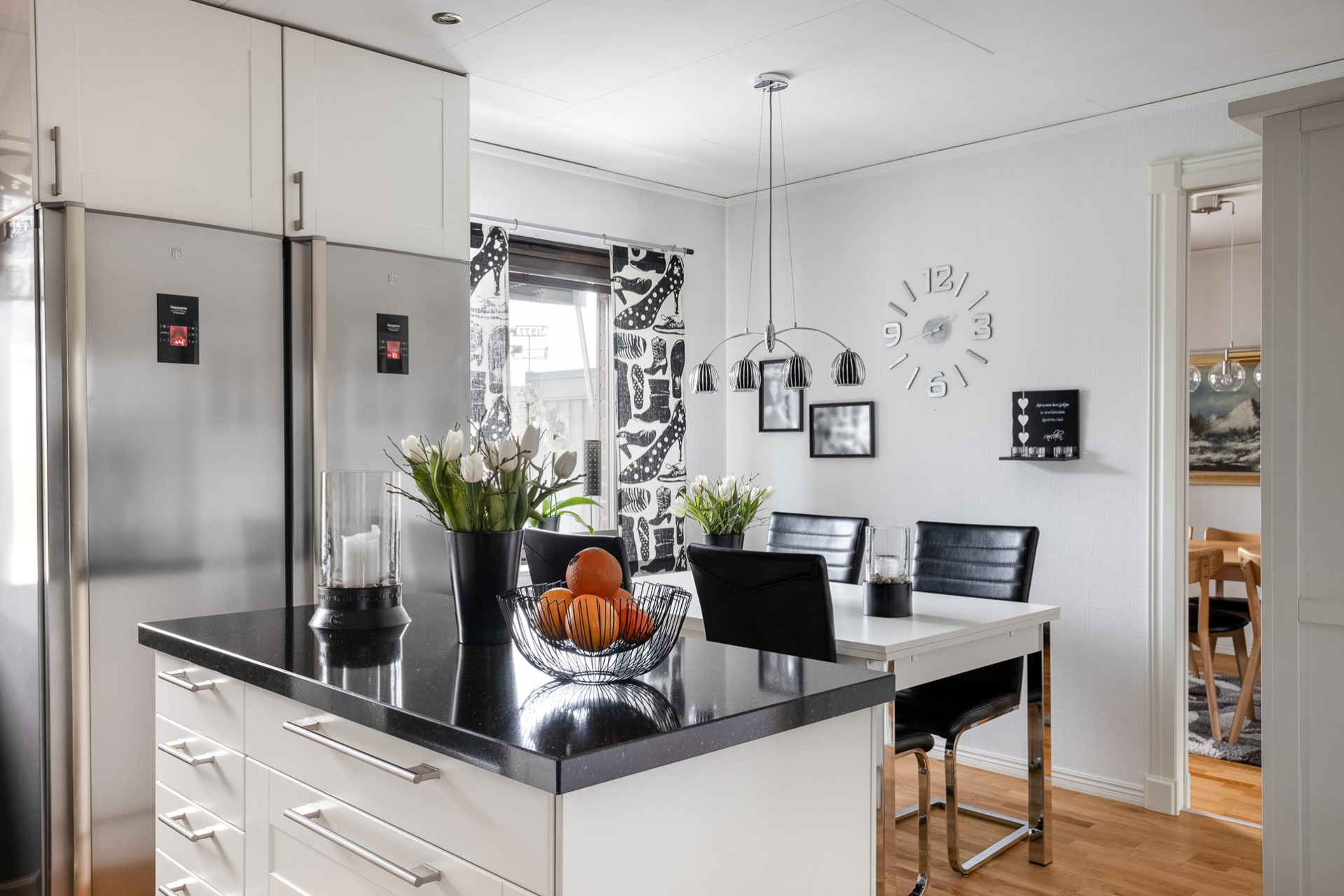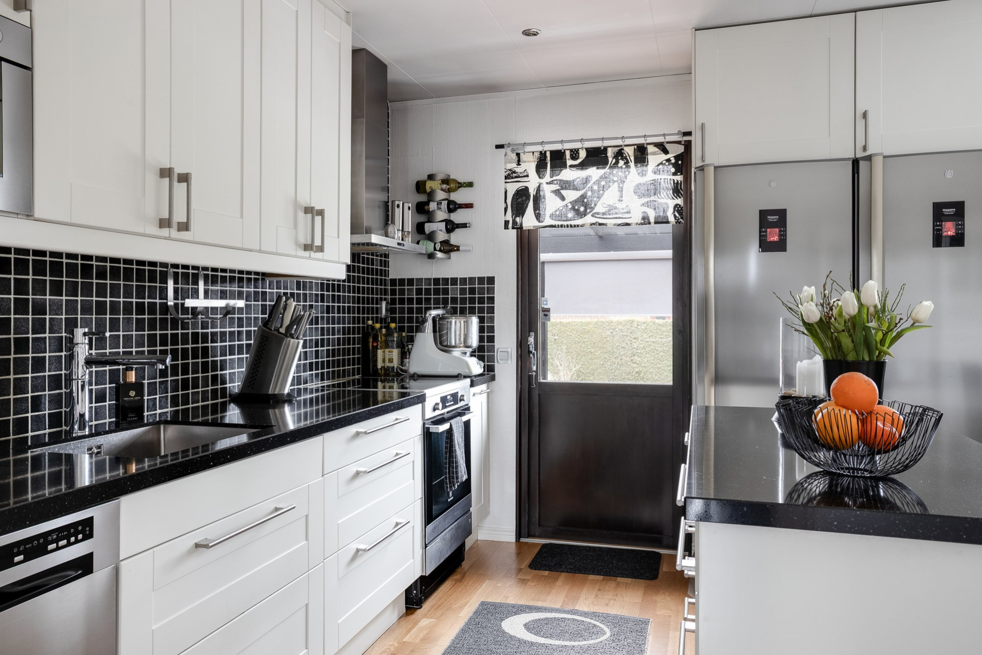 Direkt till vänster ligger grovköket – en dröm för barnfamiljen – utrustat med tvättmaskin från 2015 och torktumlare från 2022, perfekt för vardagens alla aktiviteter och snabba tvättbehov. Rakt fram öppnar sig det stilrena vita köket från 2013 med svart stenskiva och rostfria vitvaror från samma år. Här möts design och funktion i en smart planerad köksö som ger extra arbetsyta, förvaring och en naturlig samlingsplats för familjen under matlagning och läxläsning.