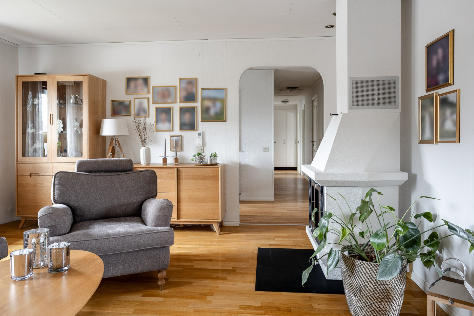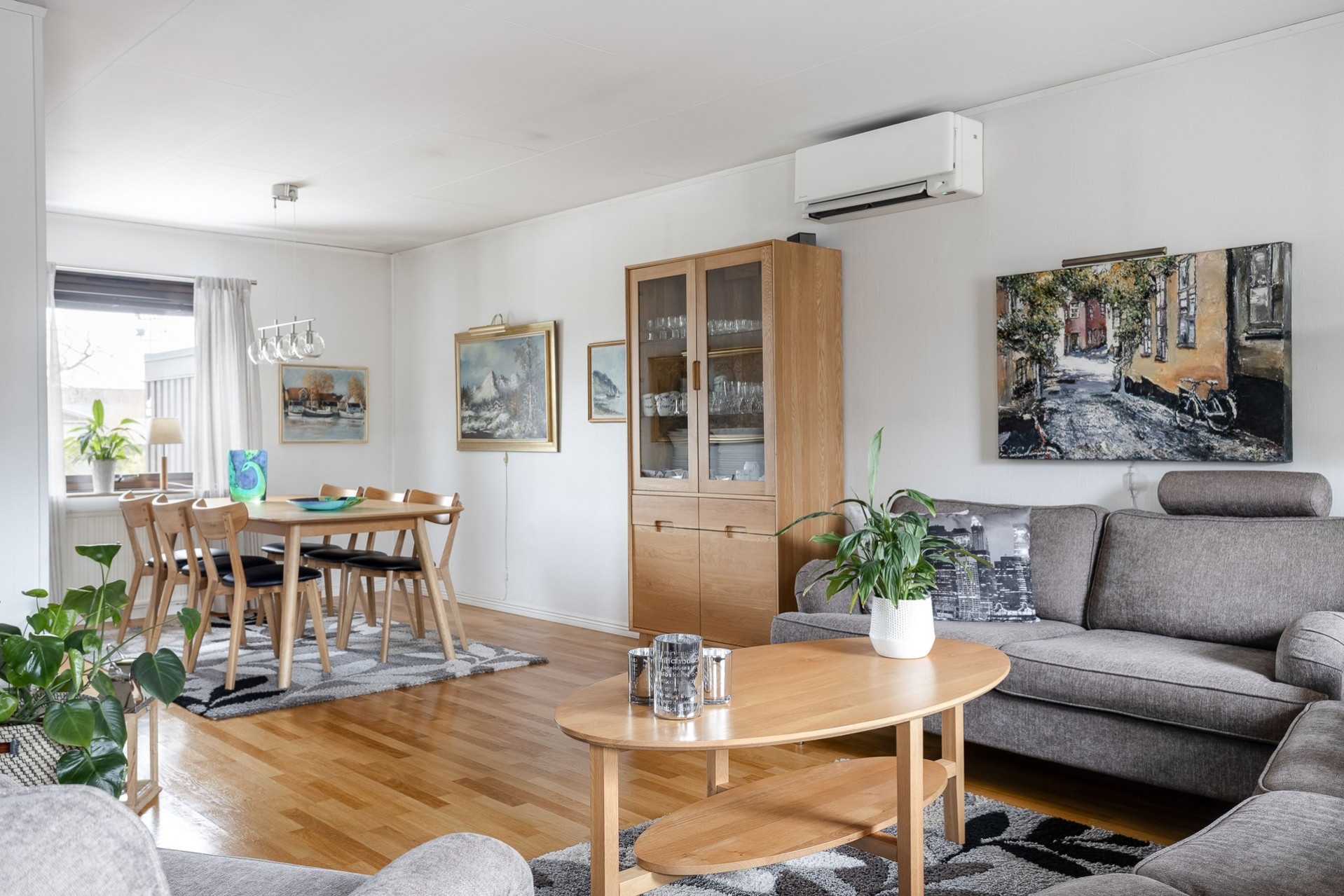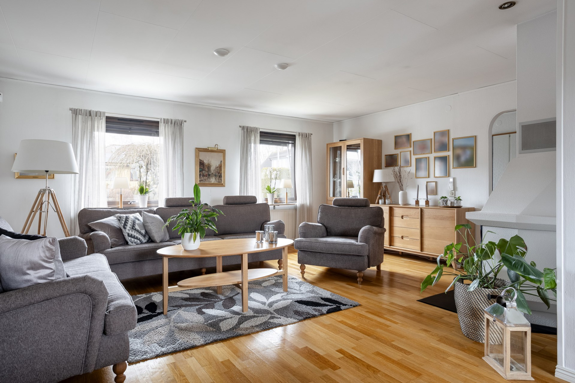 I köket finns en trevlig matplats för vardagens måltider, medan den angränsande matsalen passar perfekt för större middagar och högtider. Ekparkett löper genom kök, allrum och hall och skapar ett harmoniskt och enhetligt intryck. Matsalen ligger i öppen planlösning mot det rymliga allrummet där hela familjen får plats i soffan och där kaminen skapar en extra mysig stämning under årets kallare månader.