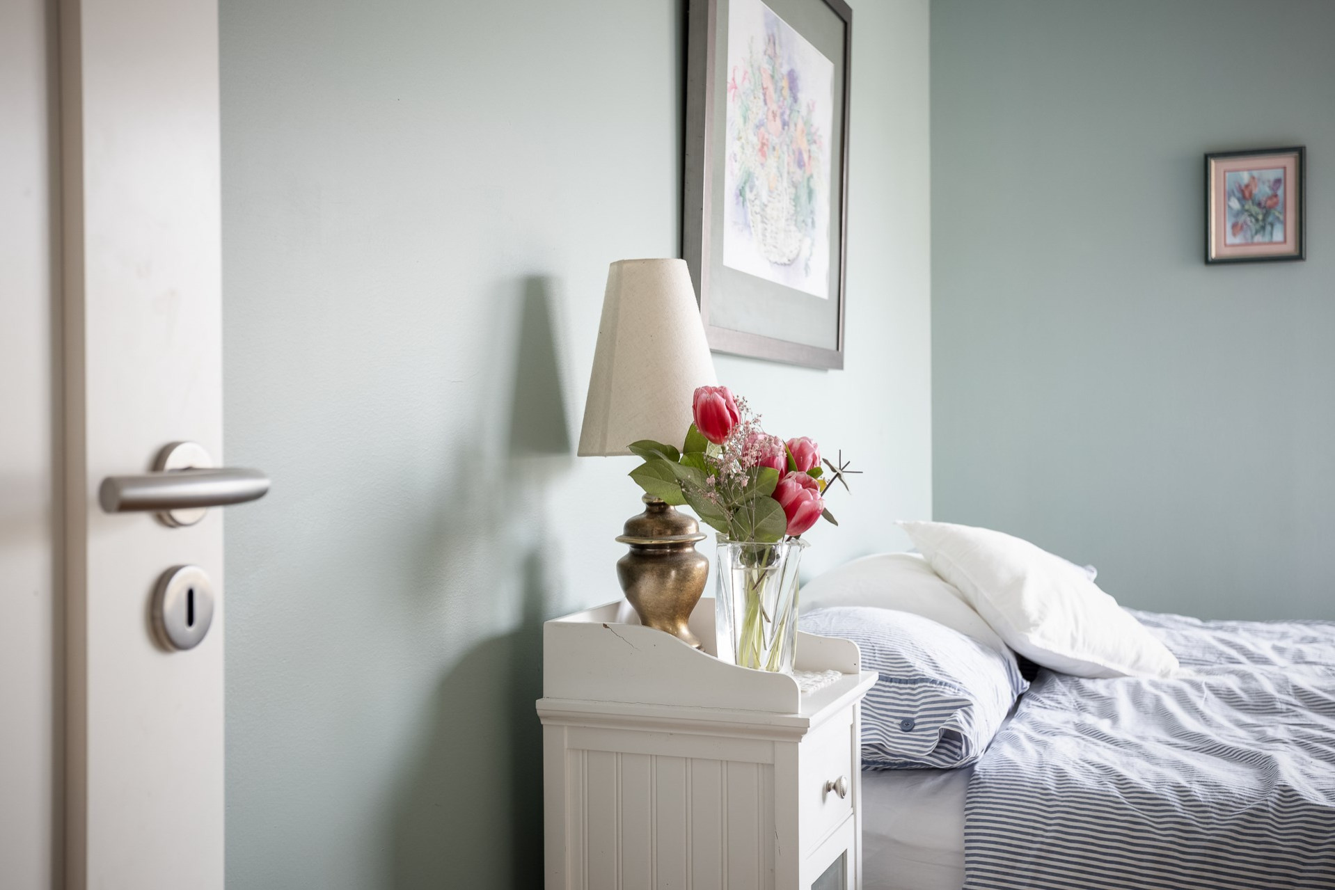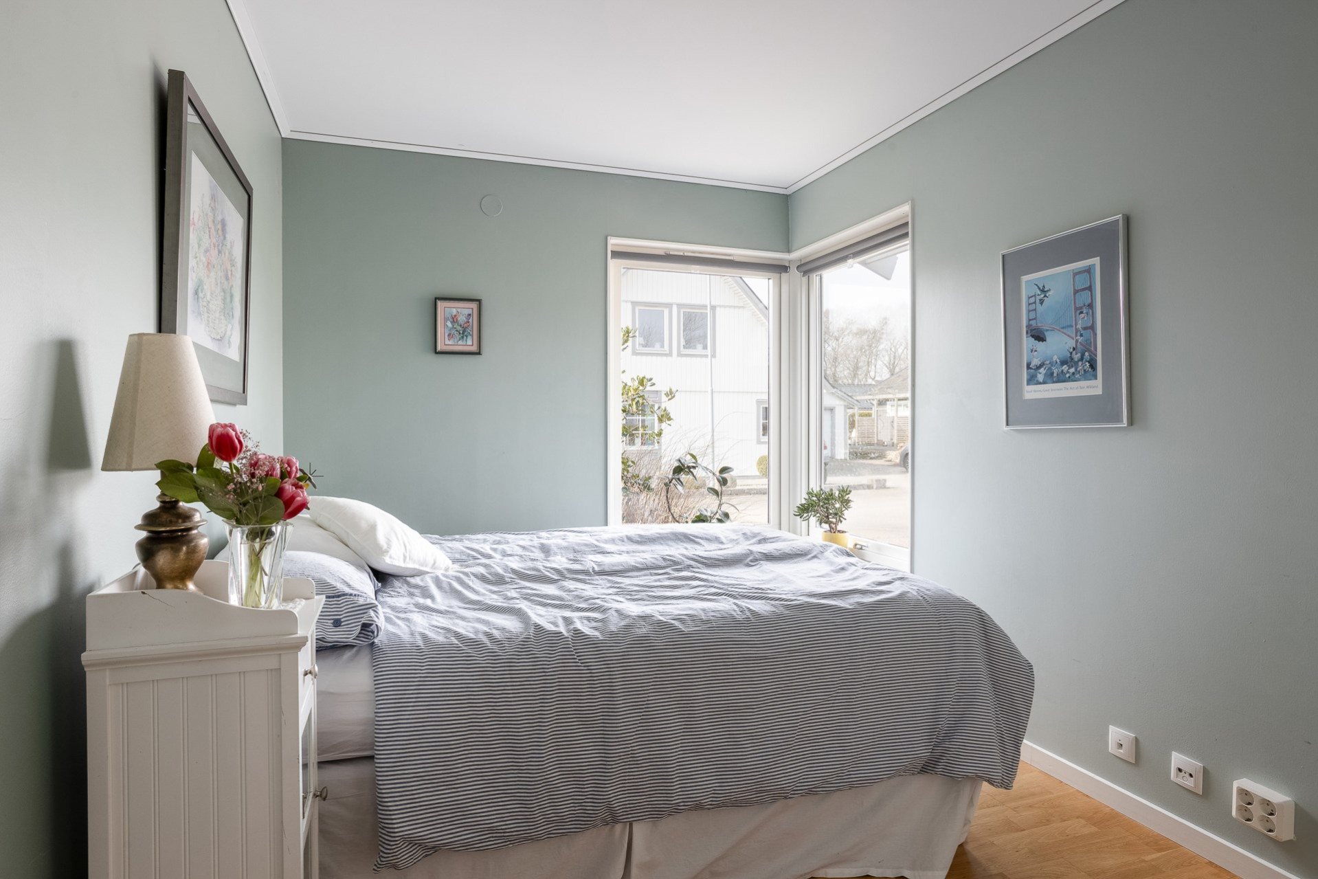 Sovrum med plats för säng och annat önskat möblemang. Garderober som ger plats åt kläder. Mintgröna väggar och parkettgolv.