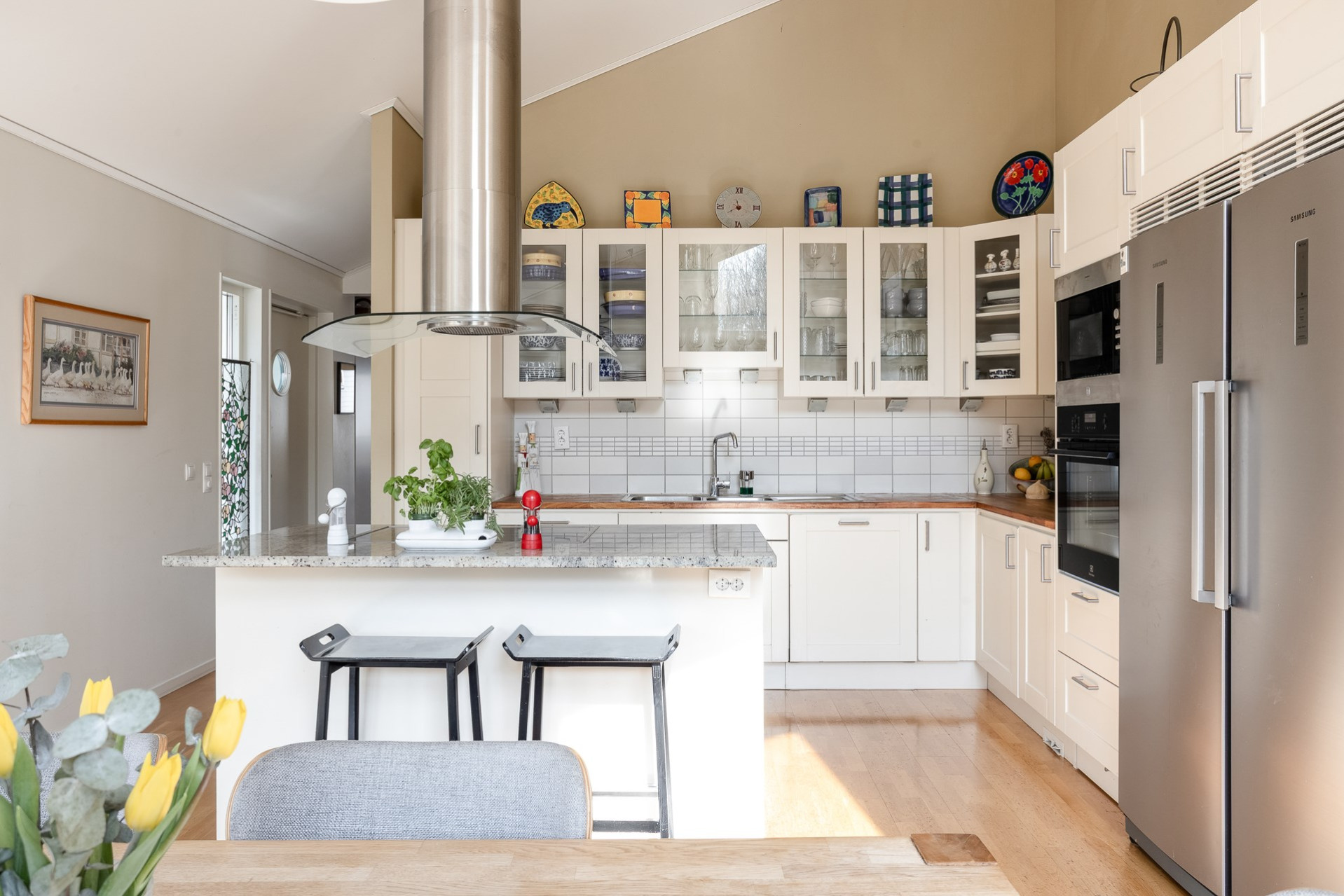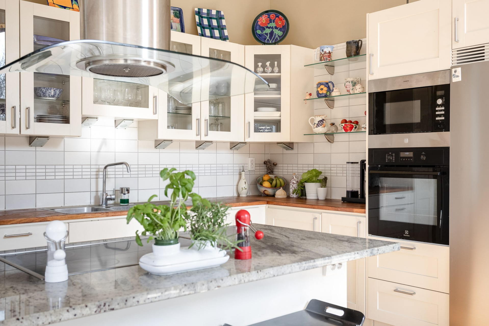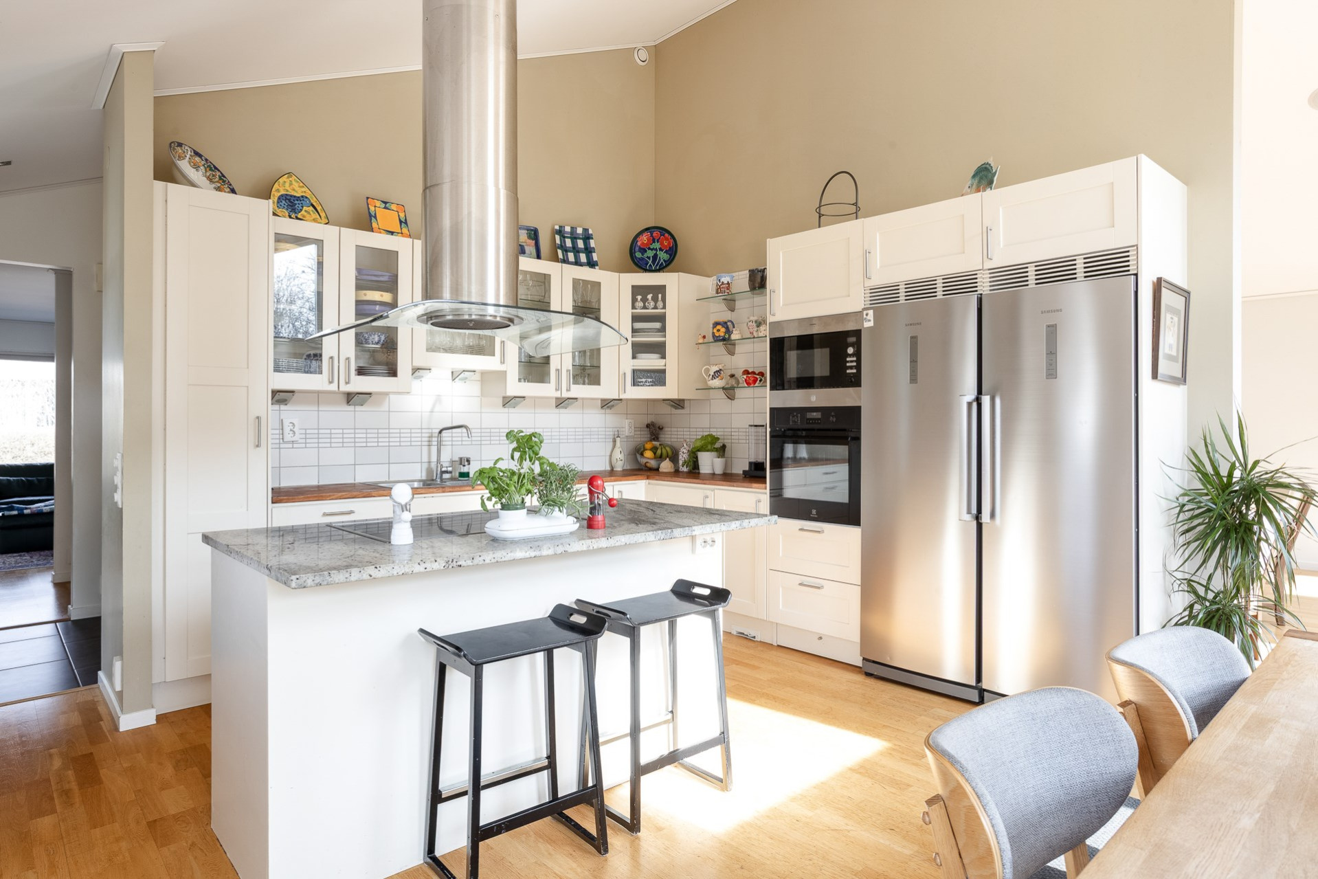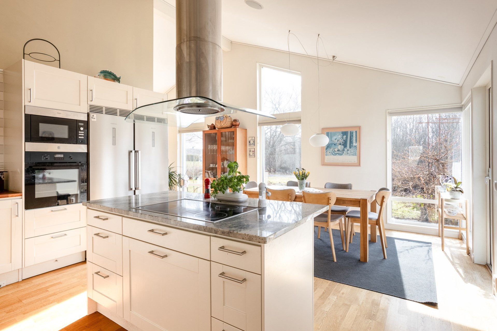 Ett stilrent kök från Vedum som är utrustat med kyl & frys (-16), inbyggd ugn (-25) och mikrovågsugn, integrerad diskmaskin (-ca 24), induktionshäll och spisfläkt. Köket erbjuder gott om förvaring i de vita skåpen som varvas med glasfronter och i lådorna. Den uppskattade köksön erbjuder både matplats, mer arbetsyta samt förvaring. Bänkskiva i trä kompletteras av exklusiv granitskiva på köksön. Ljust kakel som stänkskydd. På golvet ligger parkett och väggarna är släta och målade i en fin beige färg. Köket erbjuder även en generös matplats för 6-8 personer. Härifrån har ni även utgång till trädgården. Högtalare i taket samt spotlights.