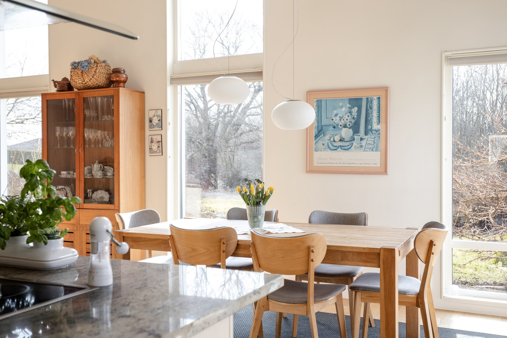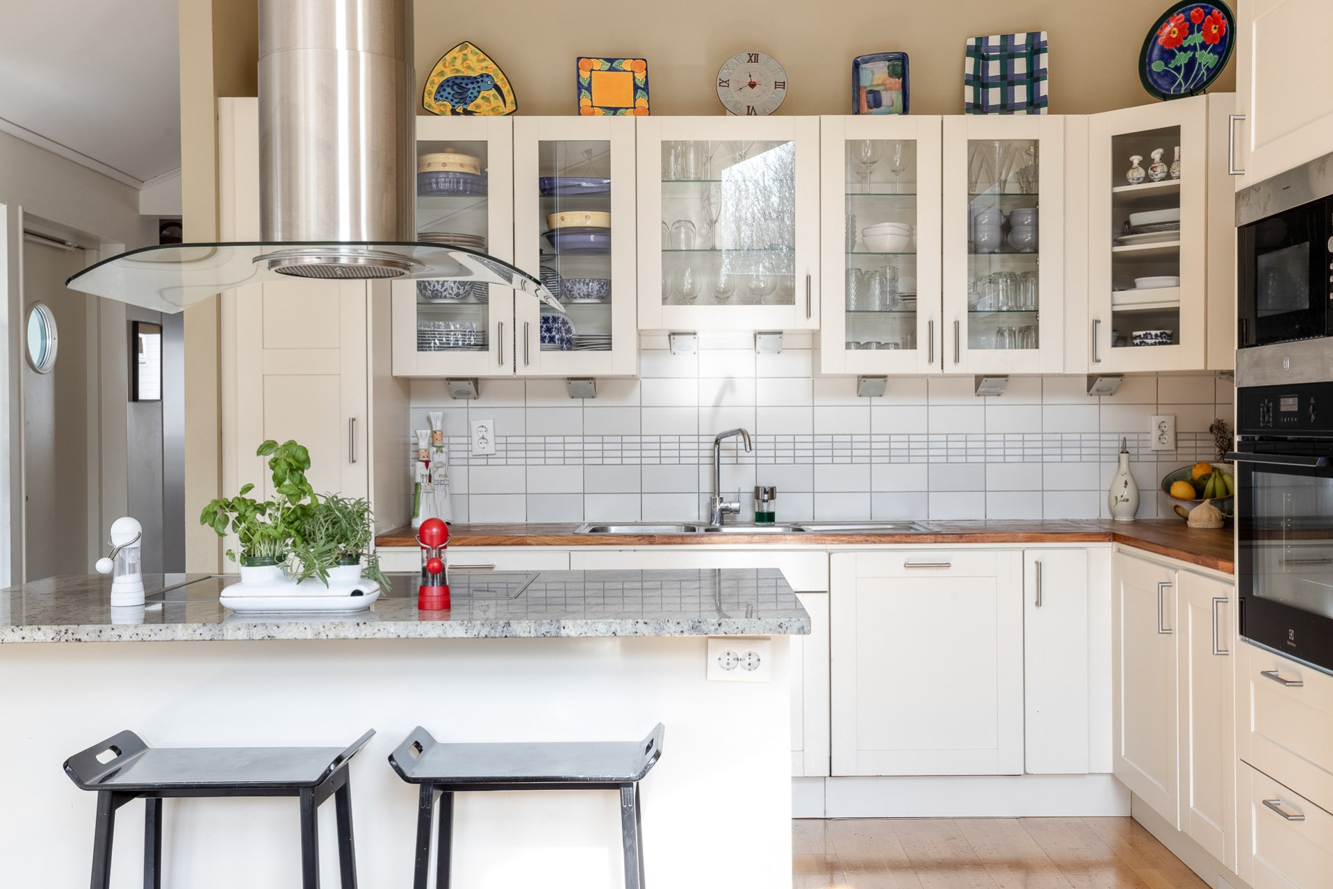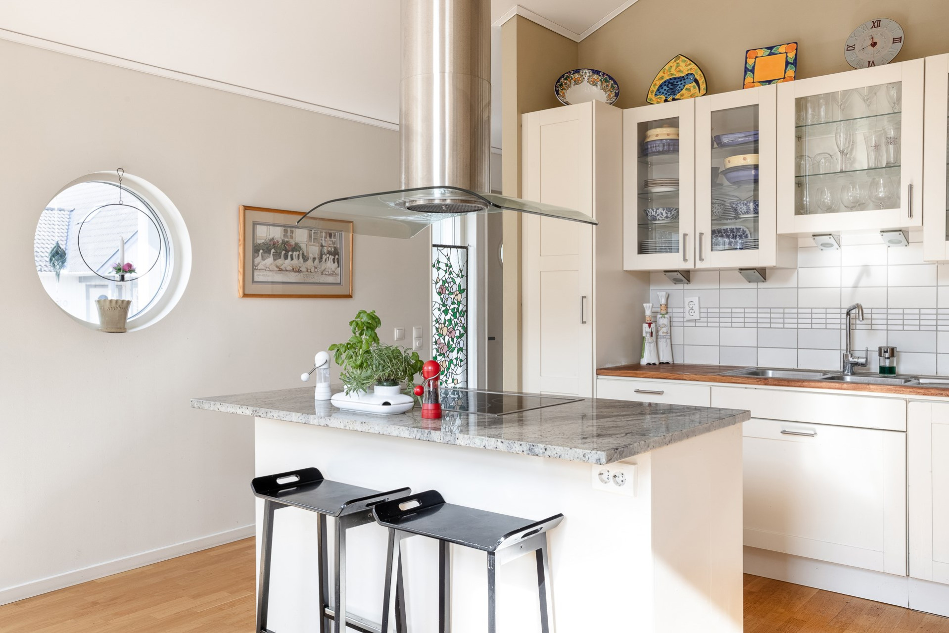 Ett stilrent kök från Vedum som är utrustat med kyl & frys (-16), inbyggd ugn (-25) och mikrovågsugn, integrerad diskmaskin (-ca 24), induktionshäll och spisfläkt. Köket erbjuder gott om förvaring i de vita skåpen som varvas med glasfronter och i lådorna. Den uppskattade köksön erbjuder både matplats, mer arbetsyta samt förvaring. Bänkskiva i trä kompletteras av exklusiv granitskiva på köksön. Ljust kakel som stänkskydd. På golvet ligger parkett och väggarna är släta och målade i en fin beige färg. Köket erbjuder även en generös matplats för 6-8 personer. Härifrån har ni även utgång till trädgården. Högtalare i taket samt spotlights.