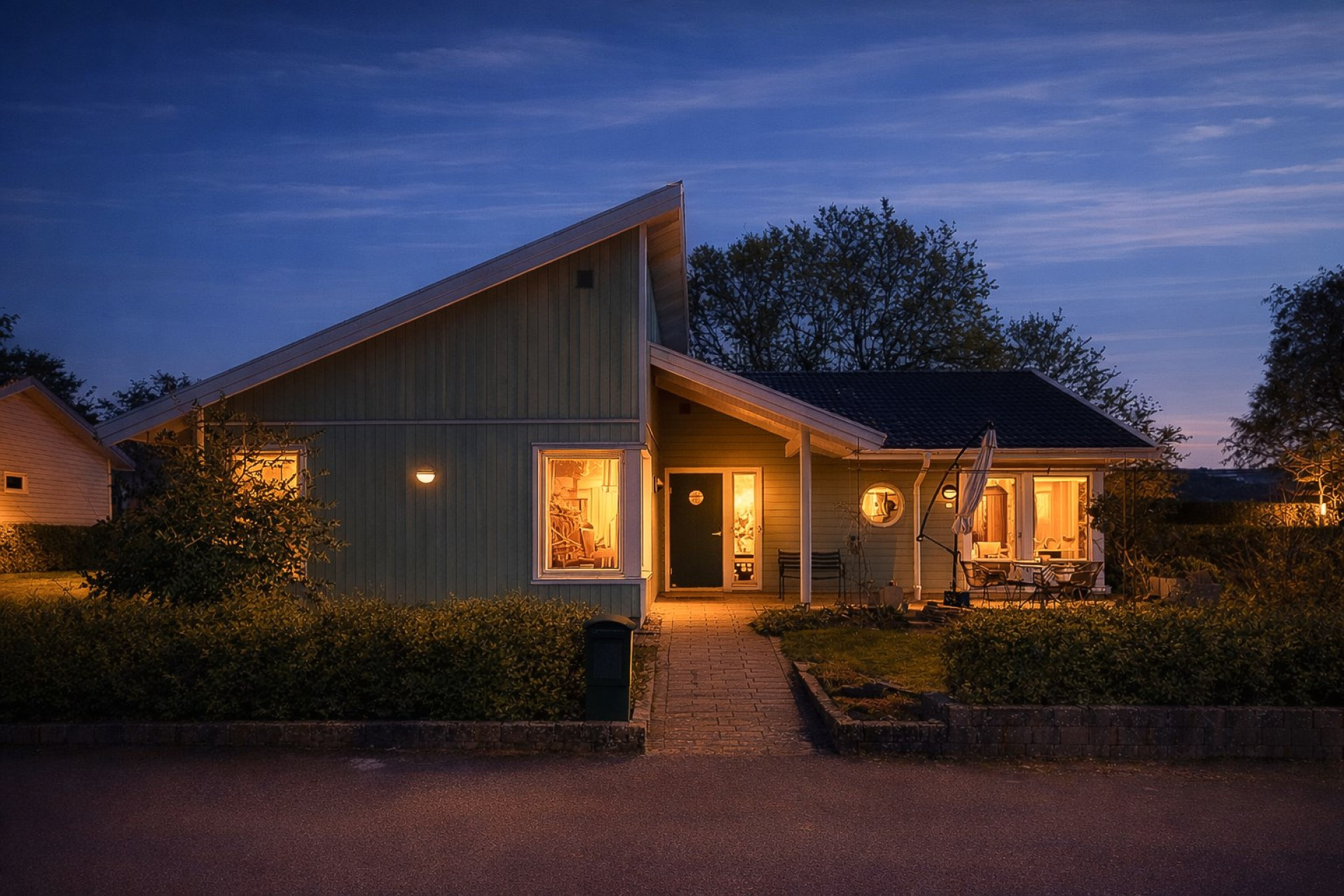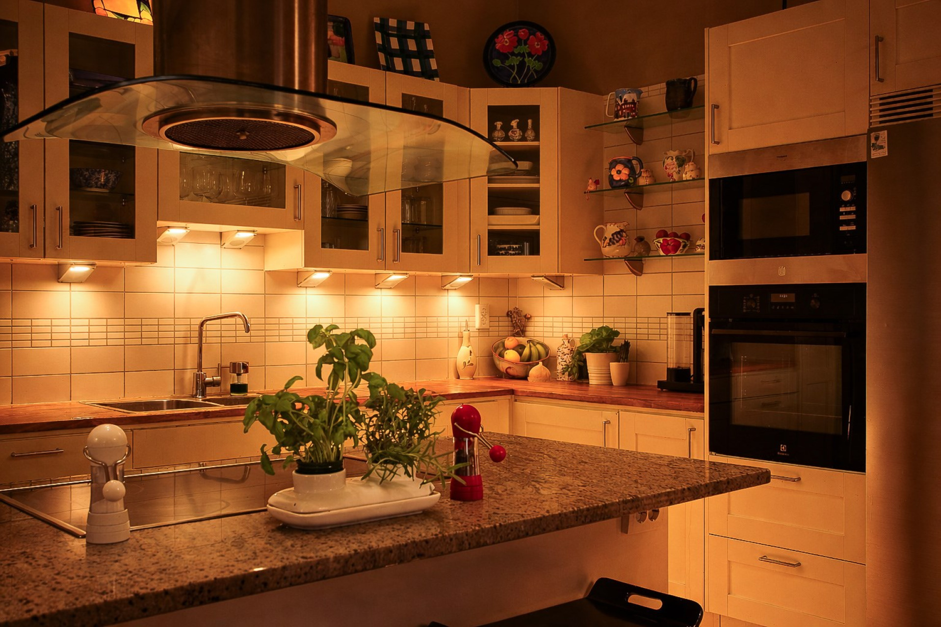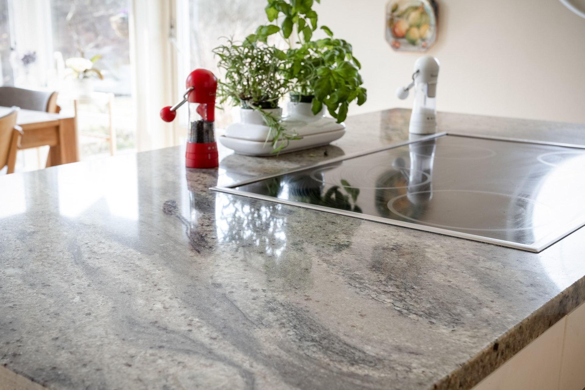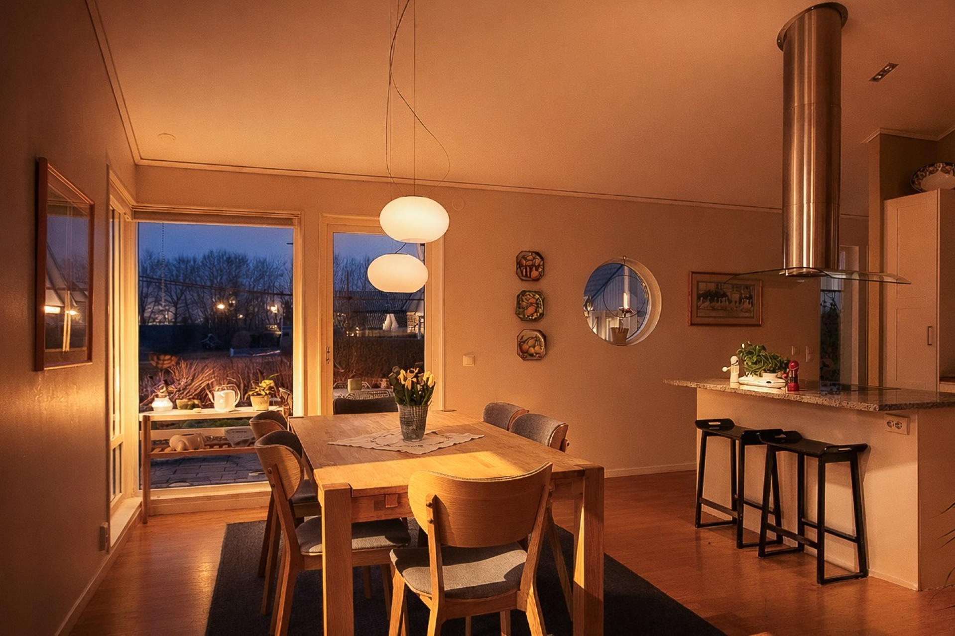 Ett stilrent kök från Vedum som är utrustat med kyl & frys (-16), inbyggd ugn (-25) och mikrovågsugn, integrerad diskmaskin (-ca 24), induktionshäll och spisfläkt. Köket erbjuder gott om förvaring i de vita skåpen som varvas med glasfronter och i lådorna. Den uppskattade köksön erbjuder både matplats, mer arbetsyta samt förvaring. Bänkskiva i trä kompletteras av exklusiv granitskiva på köksön. Ljust kakel som stänkskydd. På golvet ligger parkett och väggarna är släta och målade i en fin beige färg. Köket erbjuder även en generös matplats för 6-8 personer. Härifrån har ni även utgång till trädgården. Högtalare i taket samt spotlights.