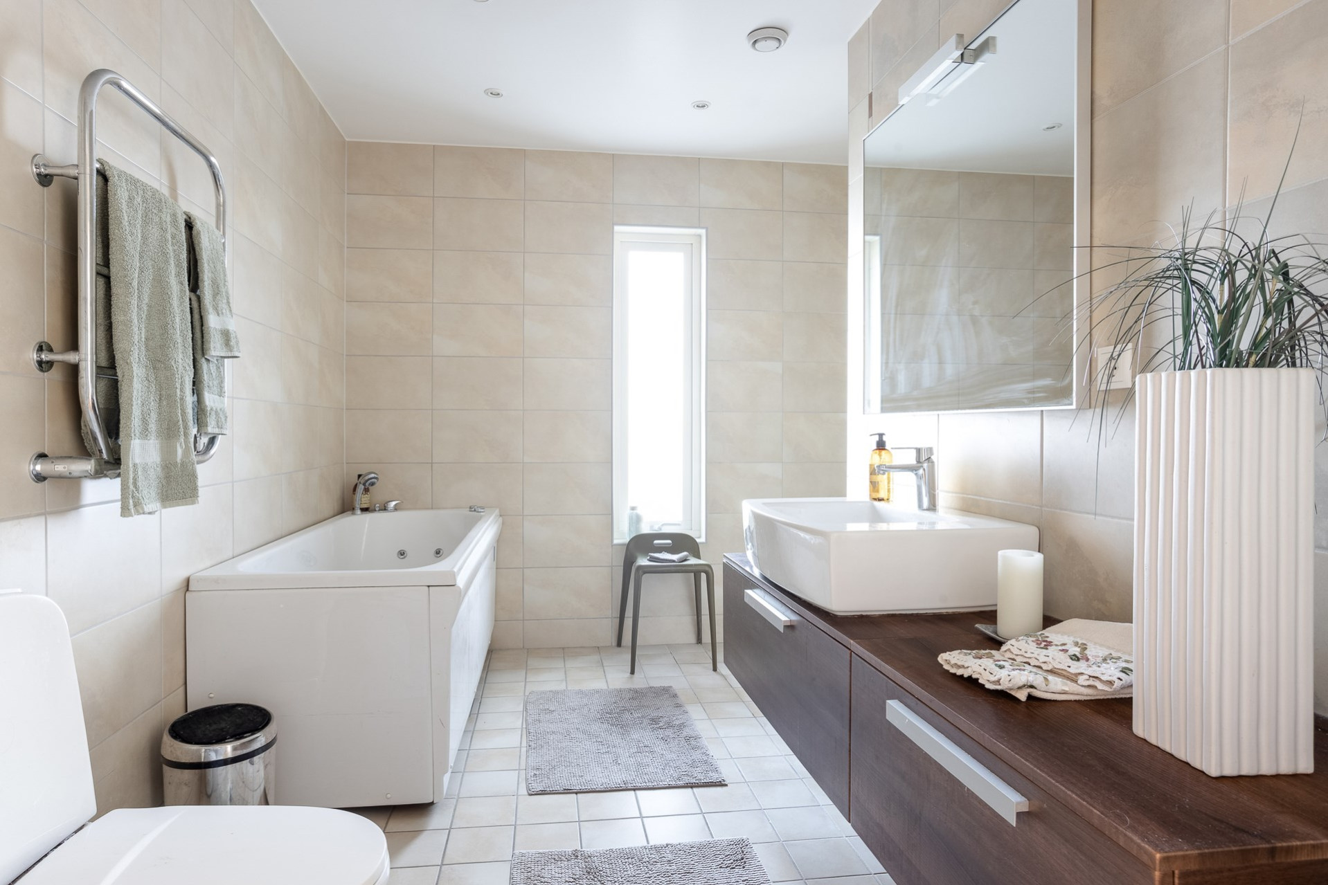 Stort helkaklat badrum i ljusa färger som är utrustat med både dusch och badkar, wc, vask med kommod undertill som erbjuder plats för hygienartiklar, stor spegel med belysning samt uppvärmd handdukstork. Spotlights i taket. Behaglig golvvärme (vattenburen)