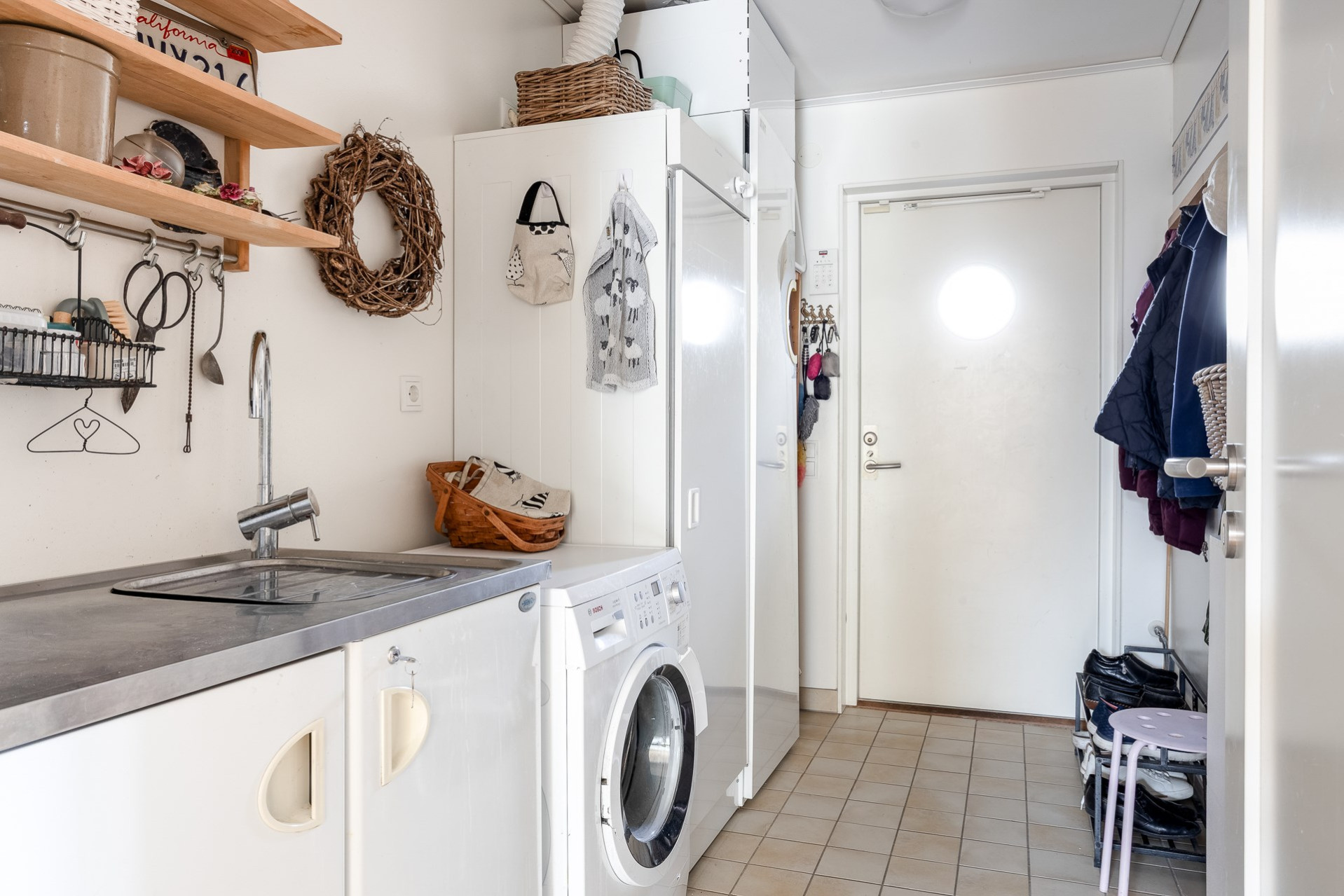 En groventré som verkligen gör skillnad i vardagen – särskilt för barnfamiljen. Groventrén är utrustad med tvättmaskin och torkskåp samt vask med arbetsbänk och skåp undertill. Här står även husets frånluftsvärmepump (IVT). Ljust klinker på golvet med behaglig golvvärme undertill (vattenburen) samt vita väggar.