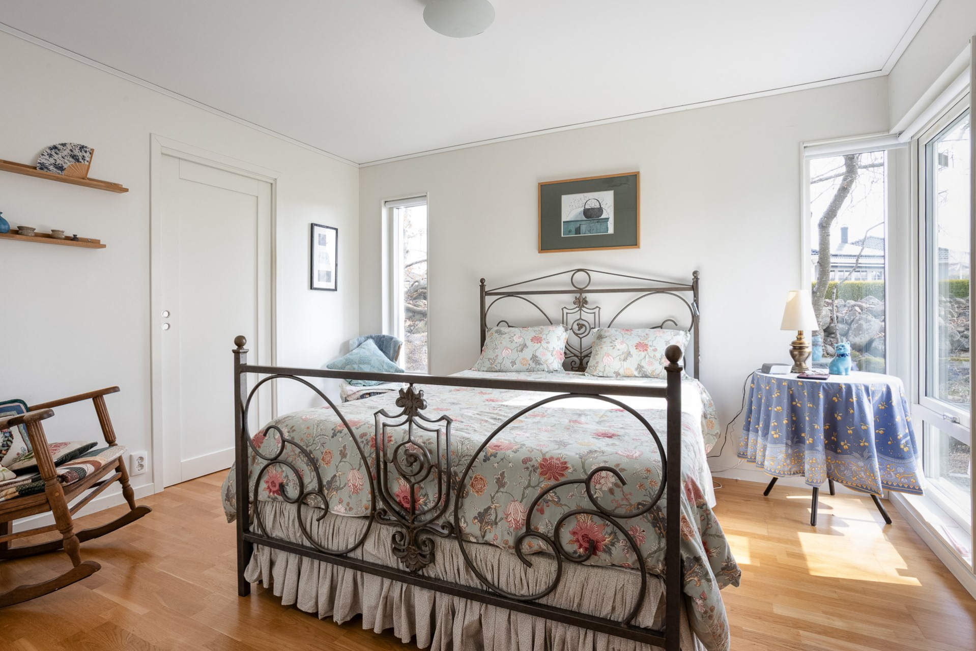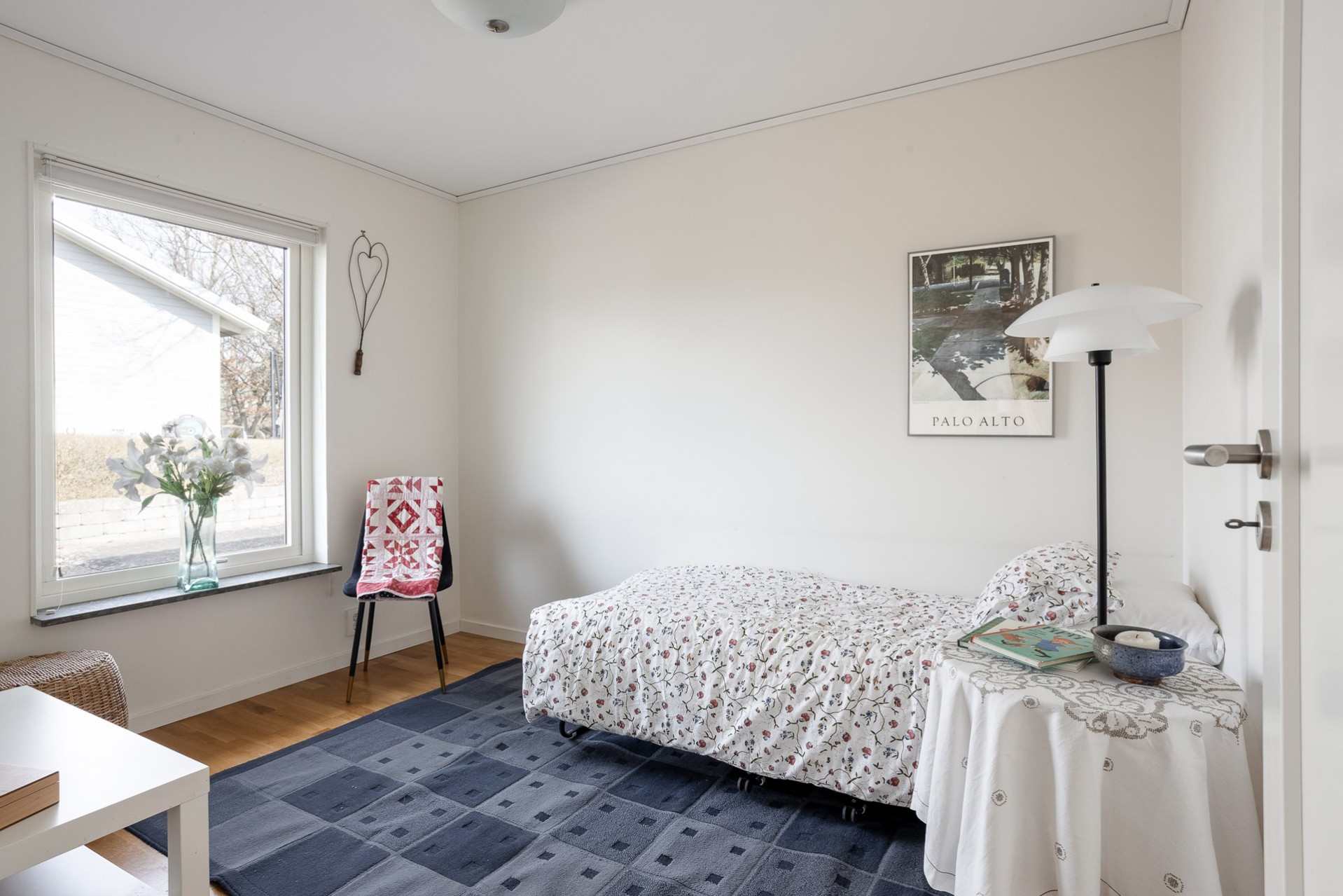 Sovrum med plats för säng och annat önskat möblemang. Vita väggar och parkettgolv.