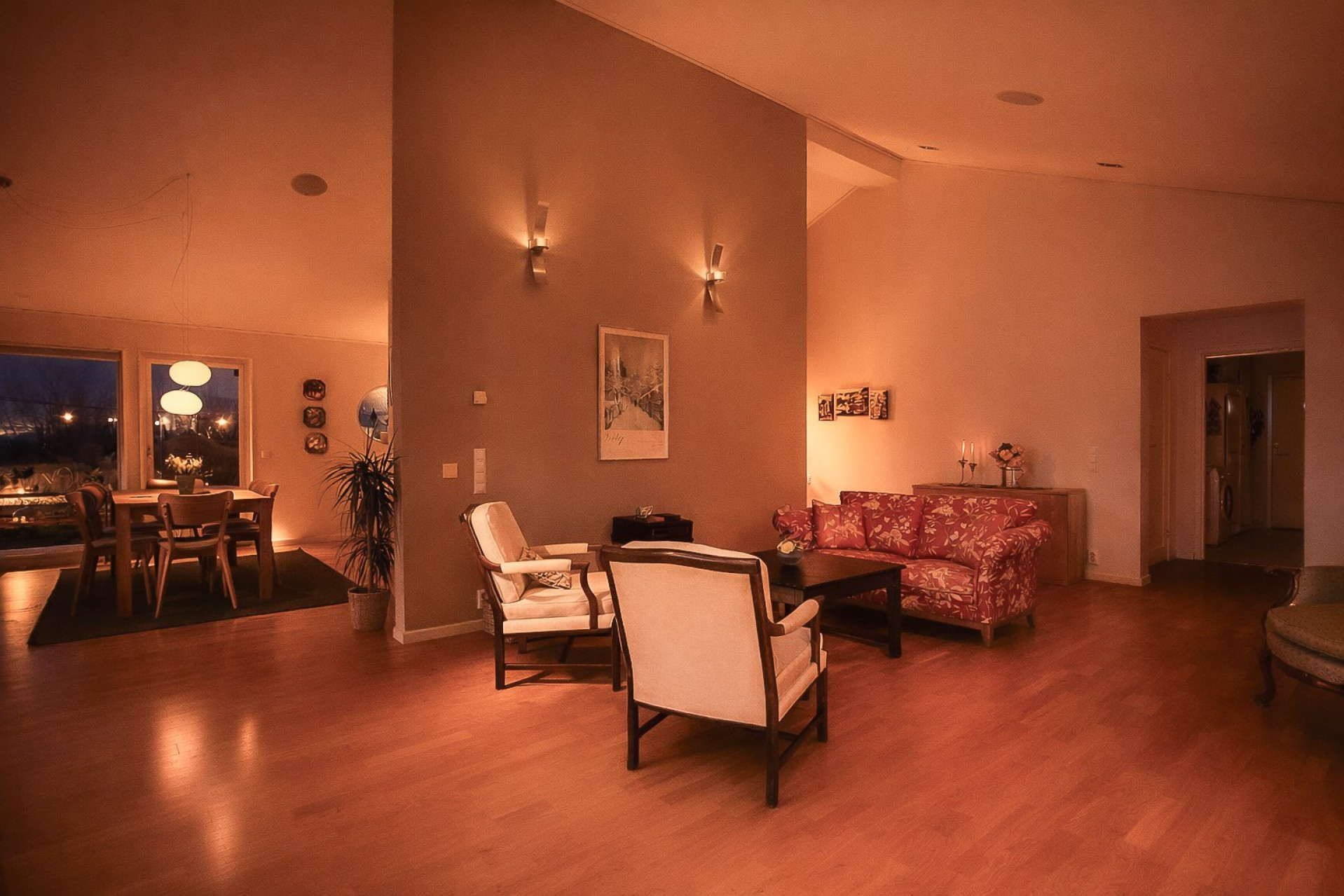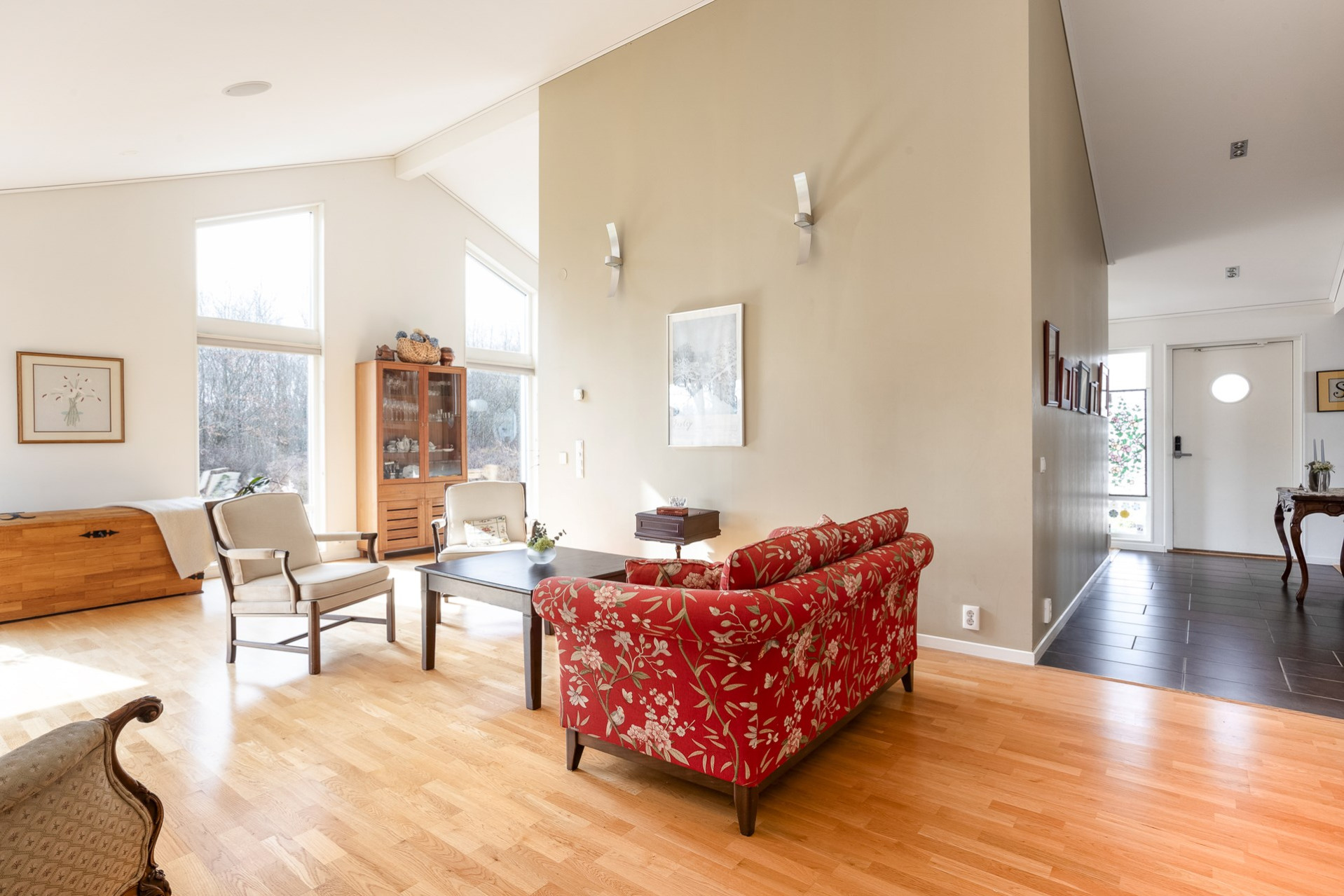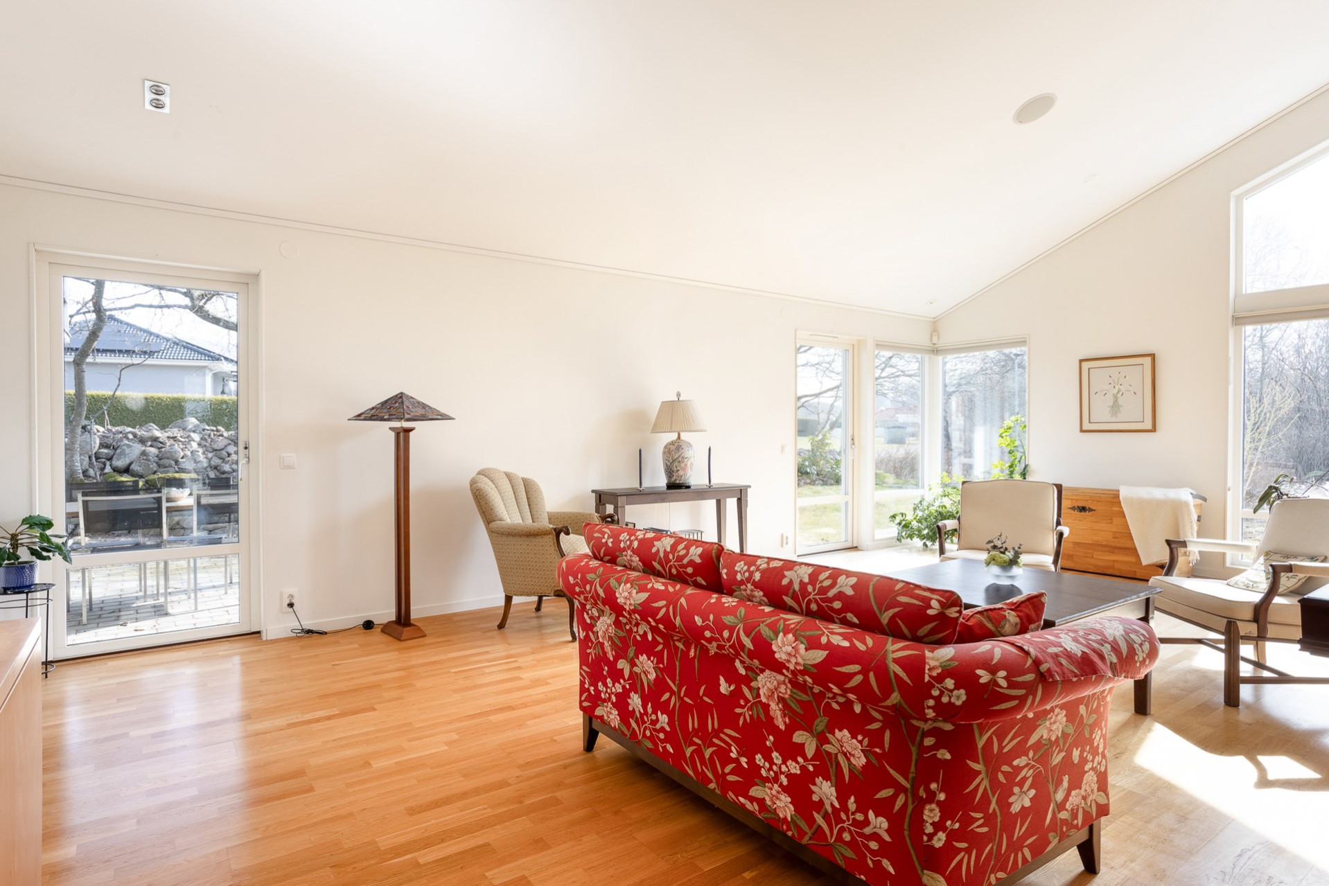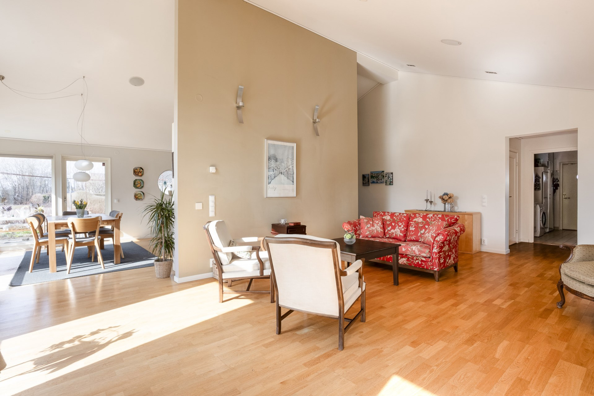 Stort och luftigt vardagsrum med generös takhöjd och stora fönsterpartier som släpper in rikligt med ljus. Här får ni plats med en soffgrupp och annat önskat möblemang. Vardagsrummet är semi-öppet mot köket och matplatsen, vilket skapar en härlig och social yta mellan rummen. I vardagsrummet är det även förberett för att sätta in en kamin som höjer mysfaktorn och blir en extra värmekälla under vintern. I vardagsrummet finns två utgångar till trädgården, varav en av dem tar er direkt till den stenlagda uteplatsen. Spotlights samt högtalare i taket. På golvet ligger ett fint parkett och väggarna är vita samt en beige fondvägg.