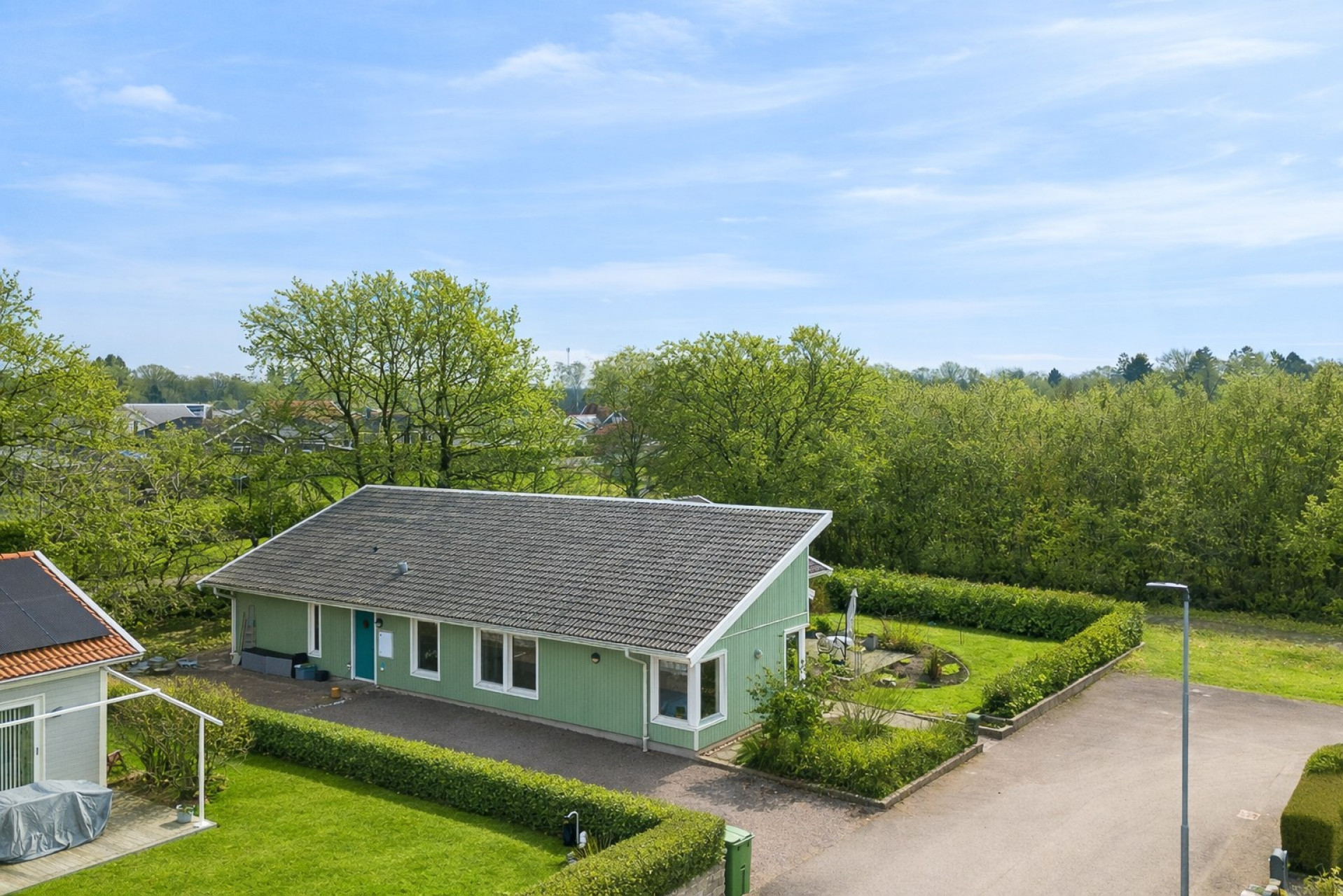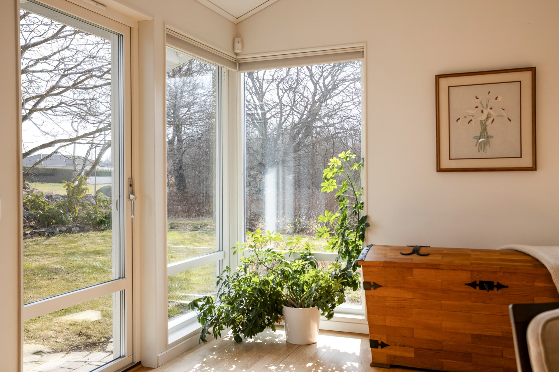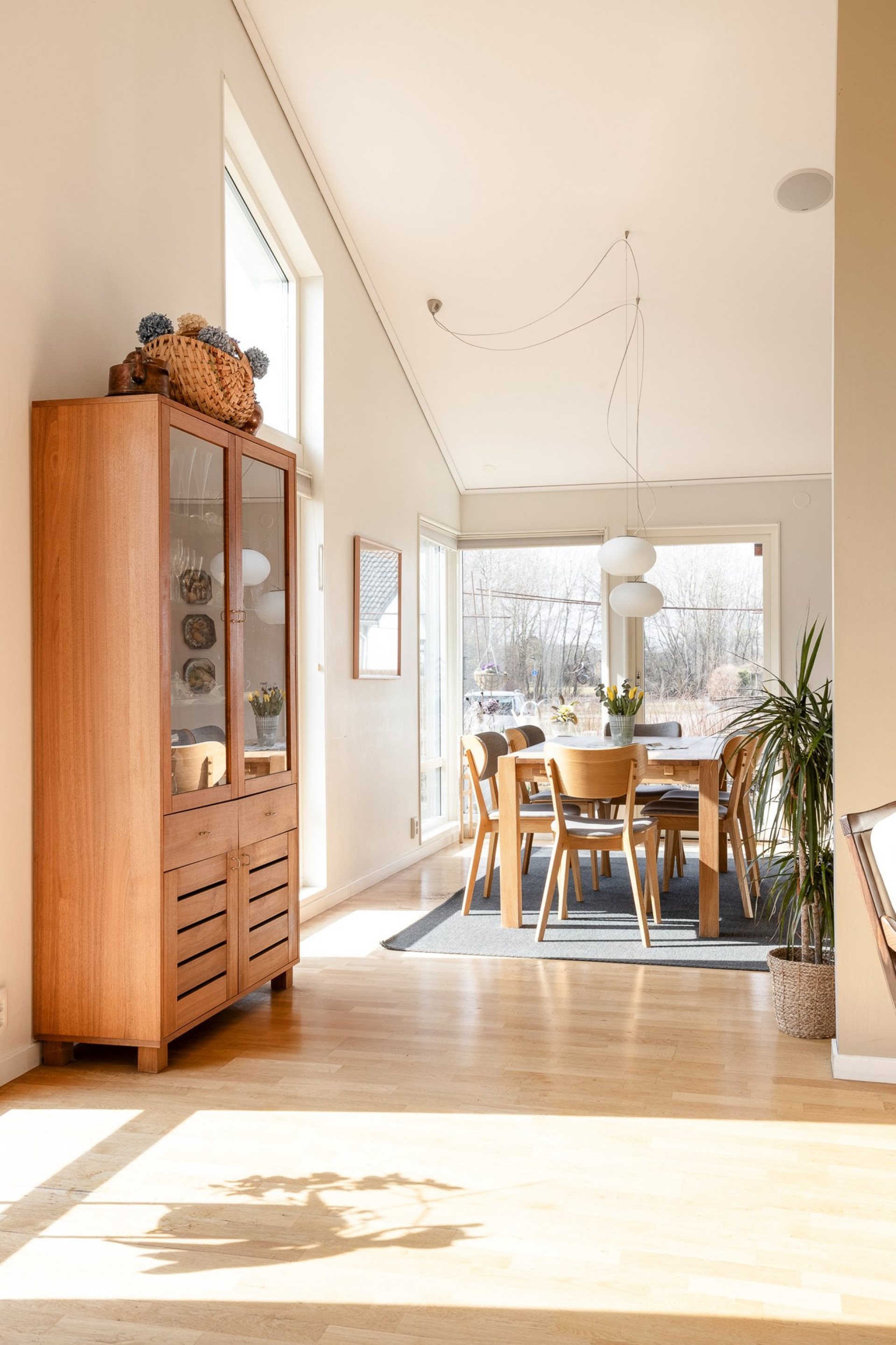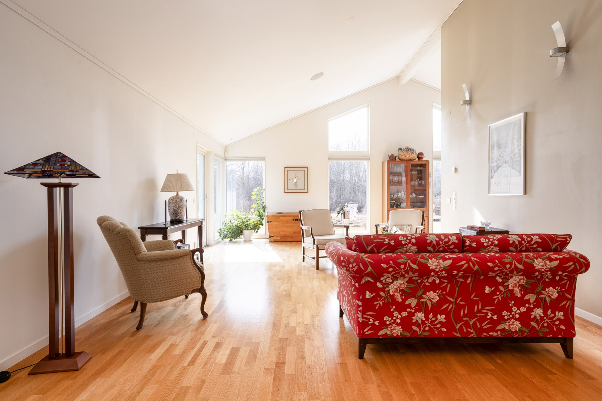 Stort och luftigt vardagsrum med generös takhöjd och stora fönsterpartier som släpper in rikligt med ljus. Här får ni plats med en soffgrupp och annat önskat möblemang. Vardagsrummet är semi-öppet mot köket och matplatsen, vilket skapar en härlig och social yta mellan rummen. I vardagsrummet är det även förberett för att sätta in en kamin som höjer mysfaktorn och blir en extra värmekälla under vintern. I vardagsrummet finns två utgångar till trädgården, varav en av dem tar er direkt till den stenlagda uteplatsen. Spotlights samt högtalare i taket. På golvet ligger ett fint parkett och väggarna är vita samt en beige fondvägg.