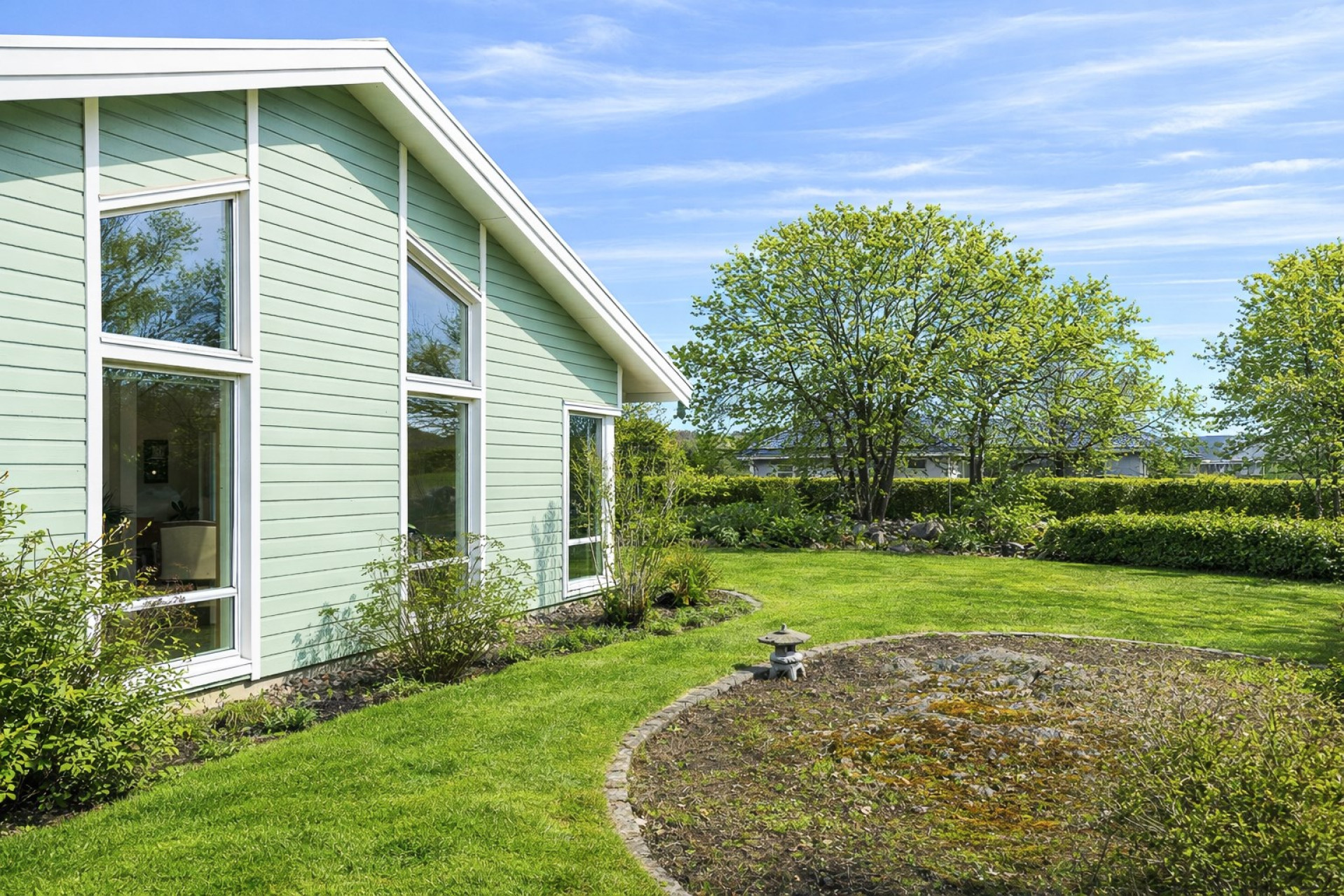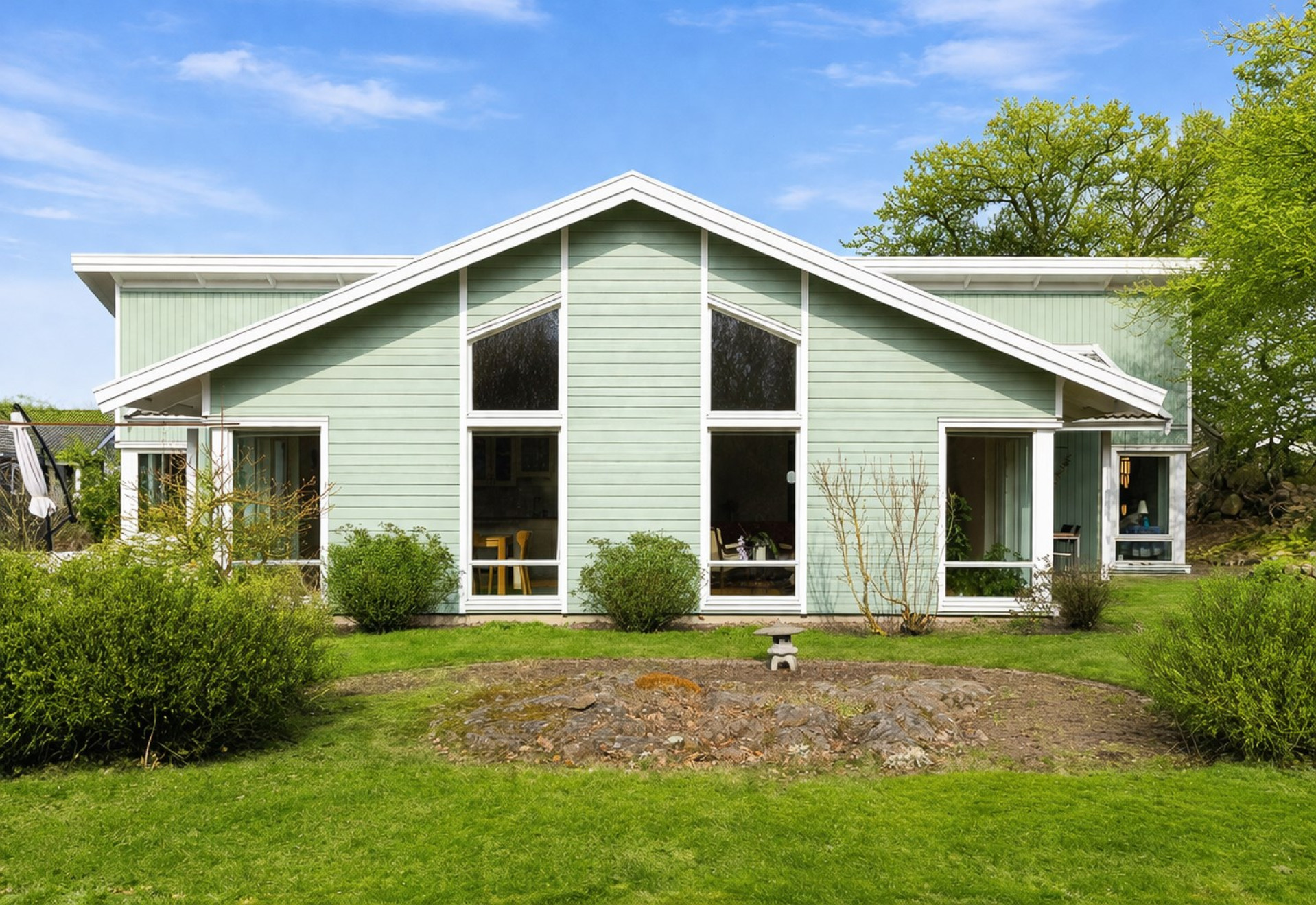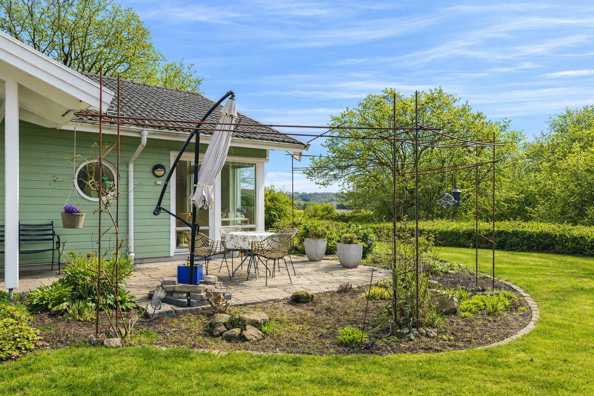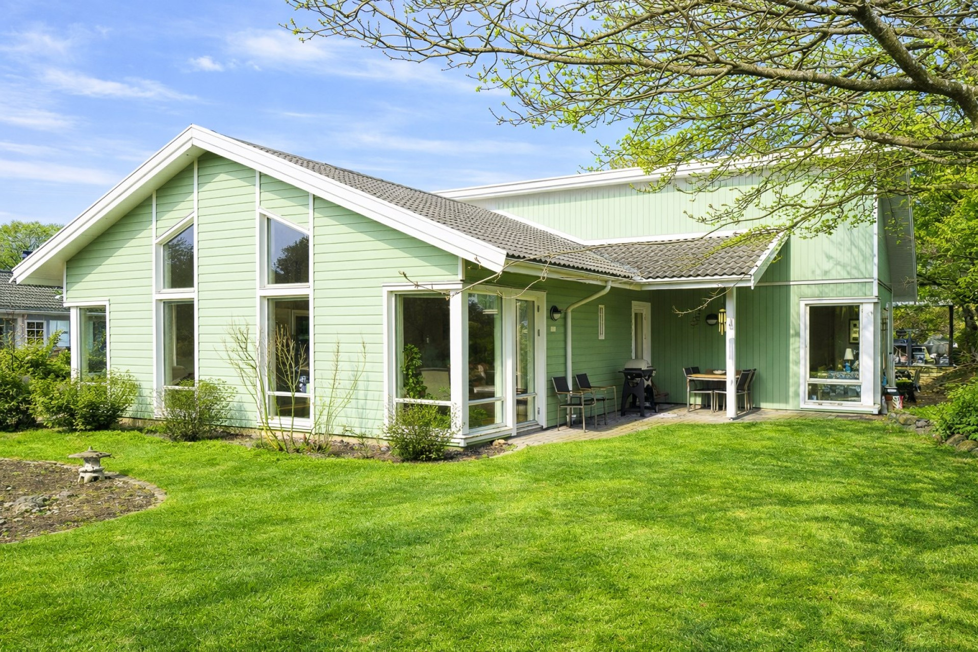 Stort och luftigt vardagsrum med generös takhöjd och stora fönsterpartier som släpper in rikligt med ljus. Här får ni plats med en soffgrupp och annat önskat möblemang. Vardagsrummet är semi-öppet mot köket och matplatsen, vilket skapar en härlig och social yta mellan rummen. I vardagsrummet är det även förberett för att sätta in en kamin som höjer mysfaktorn och blir en extra värmekälla under vintern. I vardagsrummet finns två utgångar till trädgården, varav en av dem tar er direkt till den stenlagda uteplatsen. Spotlights samt högtalare i taket. På golvet ligger ett fint parkett och väggarna är vita samt en beige fondvägg.