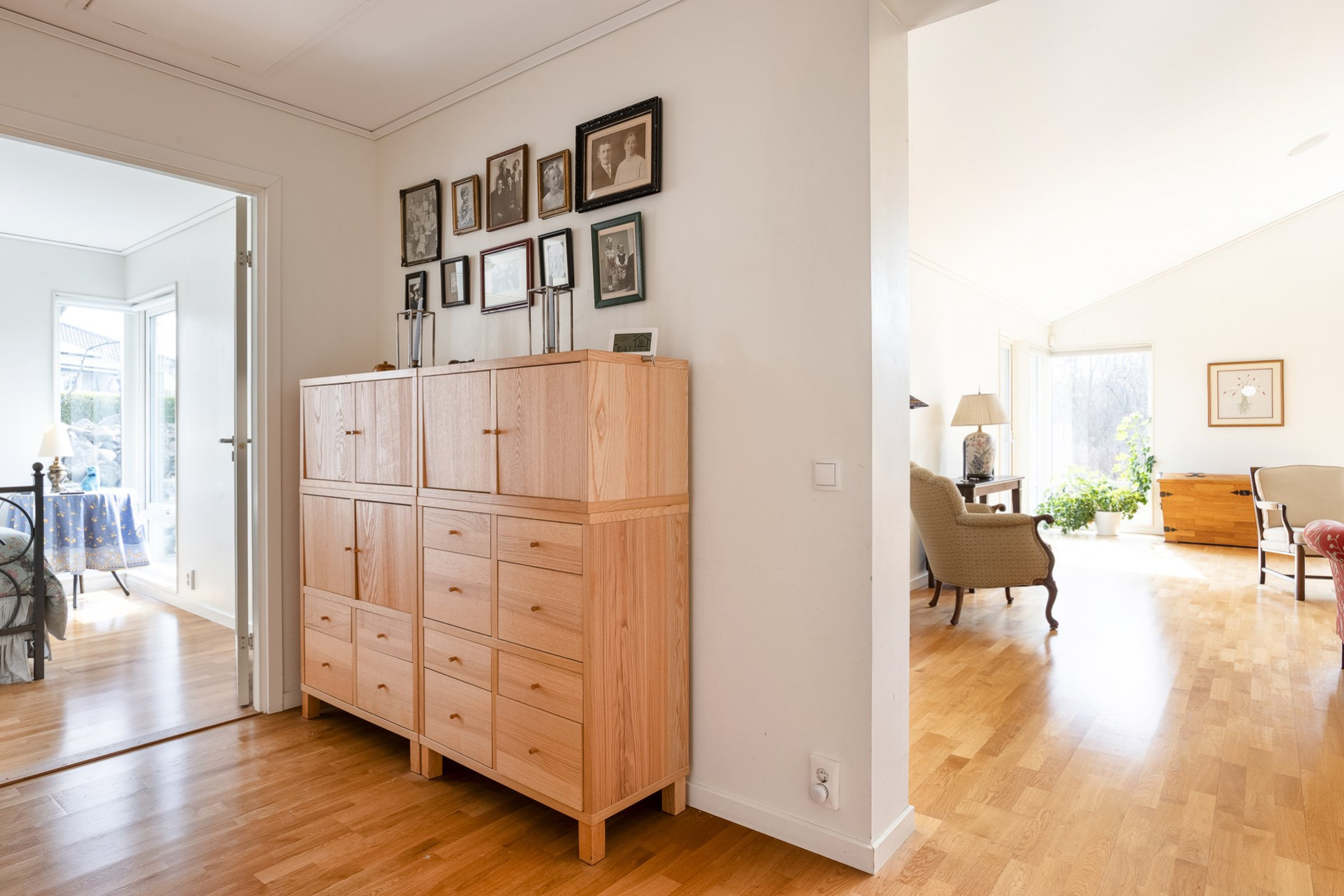 Ett generöst allrum där ni får plats med en soffa, tv och/eller annat önskat möblemang. Perfekt som ett extra vardagsrum/lekyta för barnen. Garderober med förvaringsmöjligheter. Parkettgolv och väggarna är vita.
