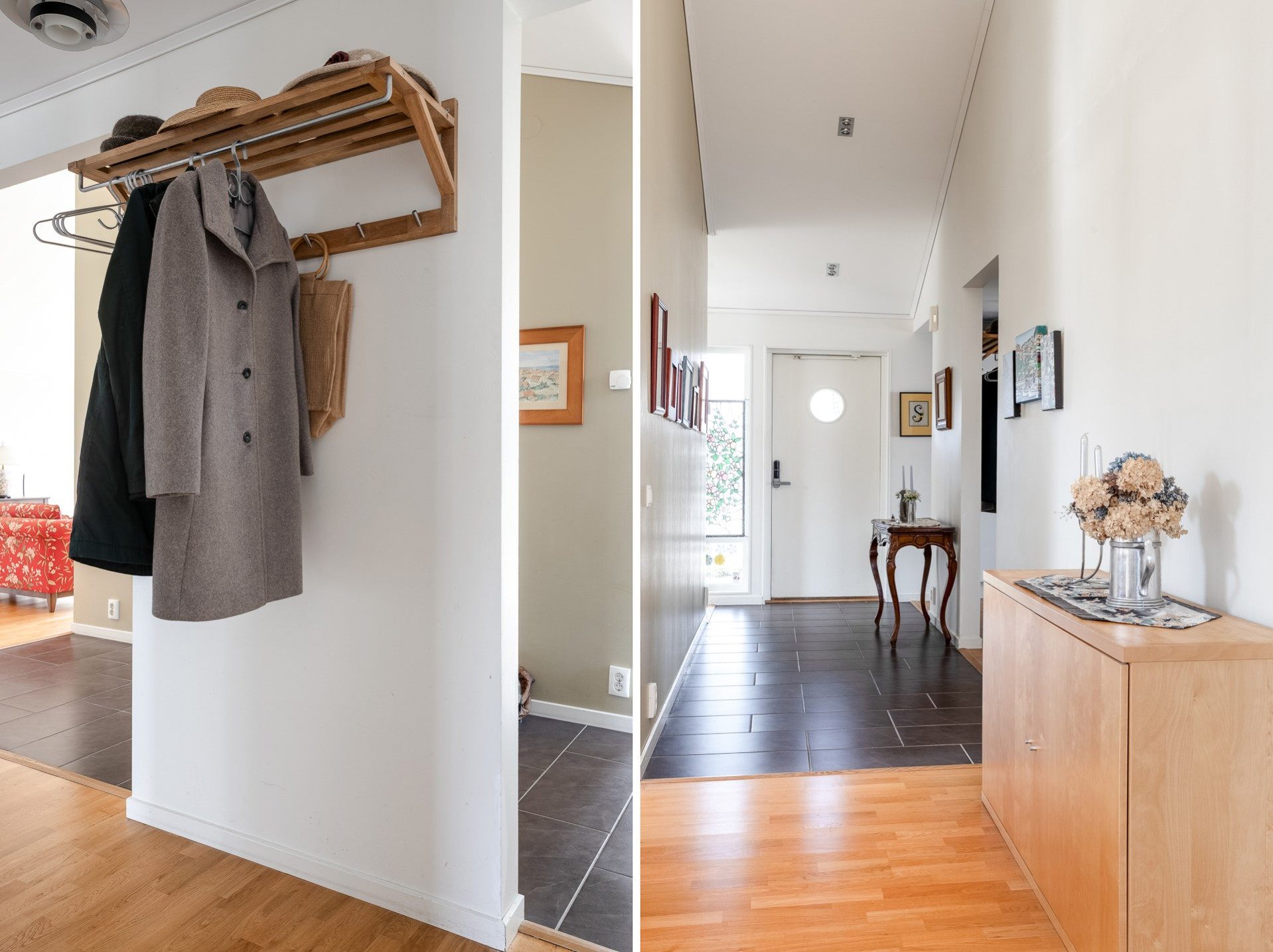 Välkomnande hall med plats för avhängning. På golvet ligger ett mörkt klinker med underliggande golvvärme (vattenburen) som därefter övergår till ekparkett och väggarna är vita. Från hallen nås vardagsrummet, köket och allrummet.