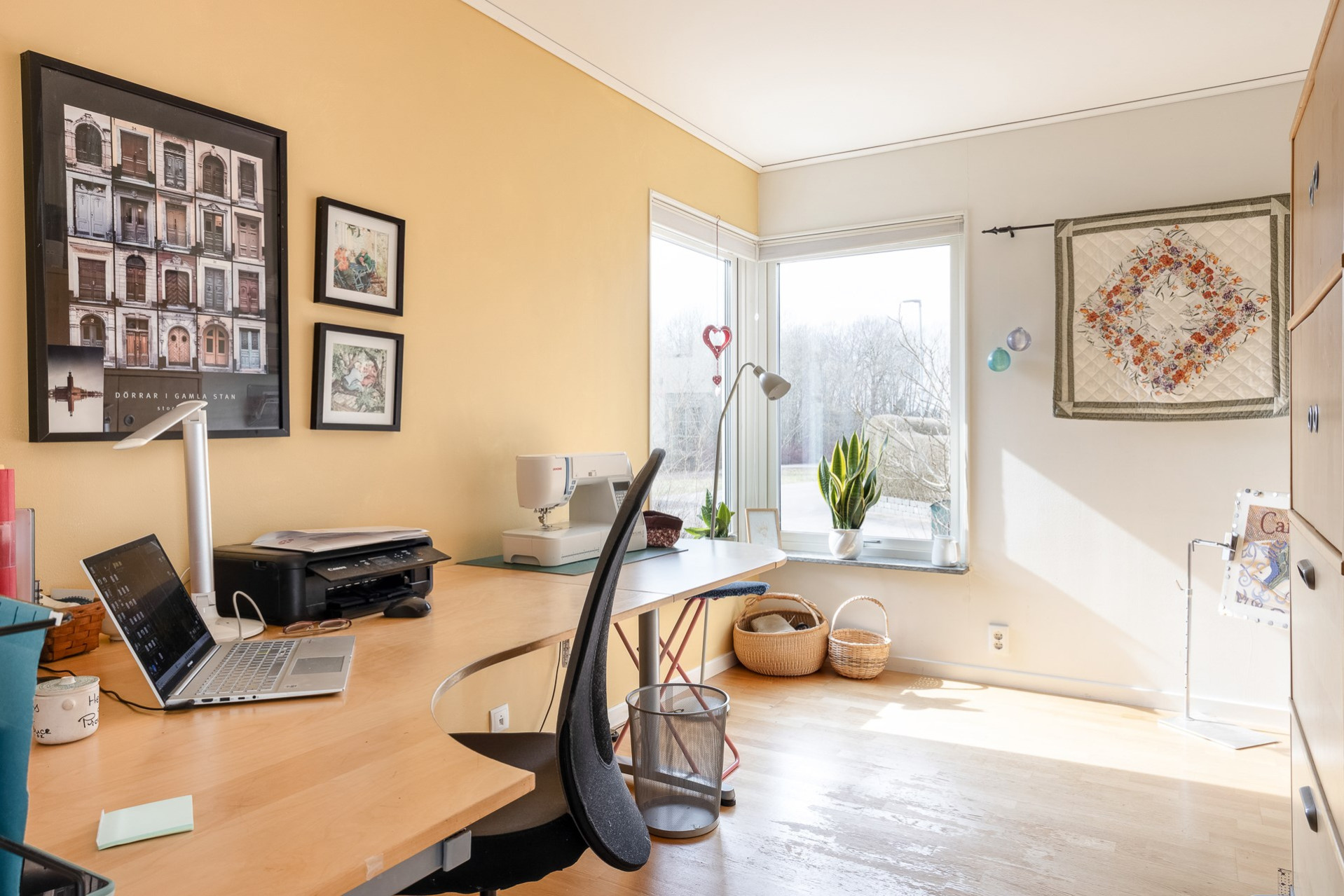 Sovrum som idag används som ett arbetsrum. Här får ni plats med en säng och annat önskat möblemang. Gula och vita väggar. Parkettgolv.