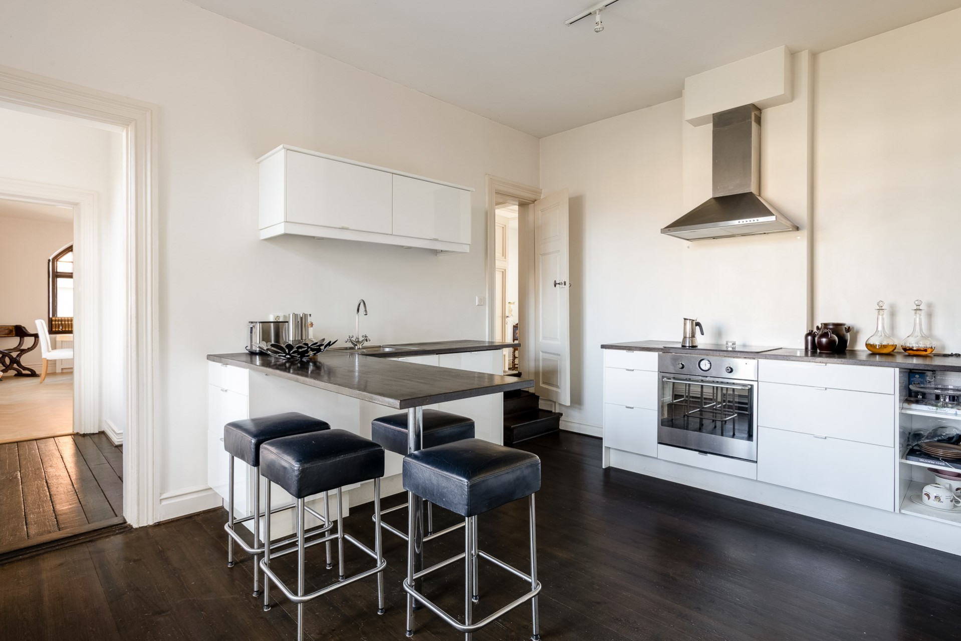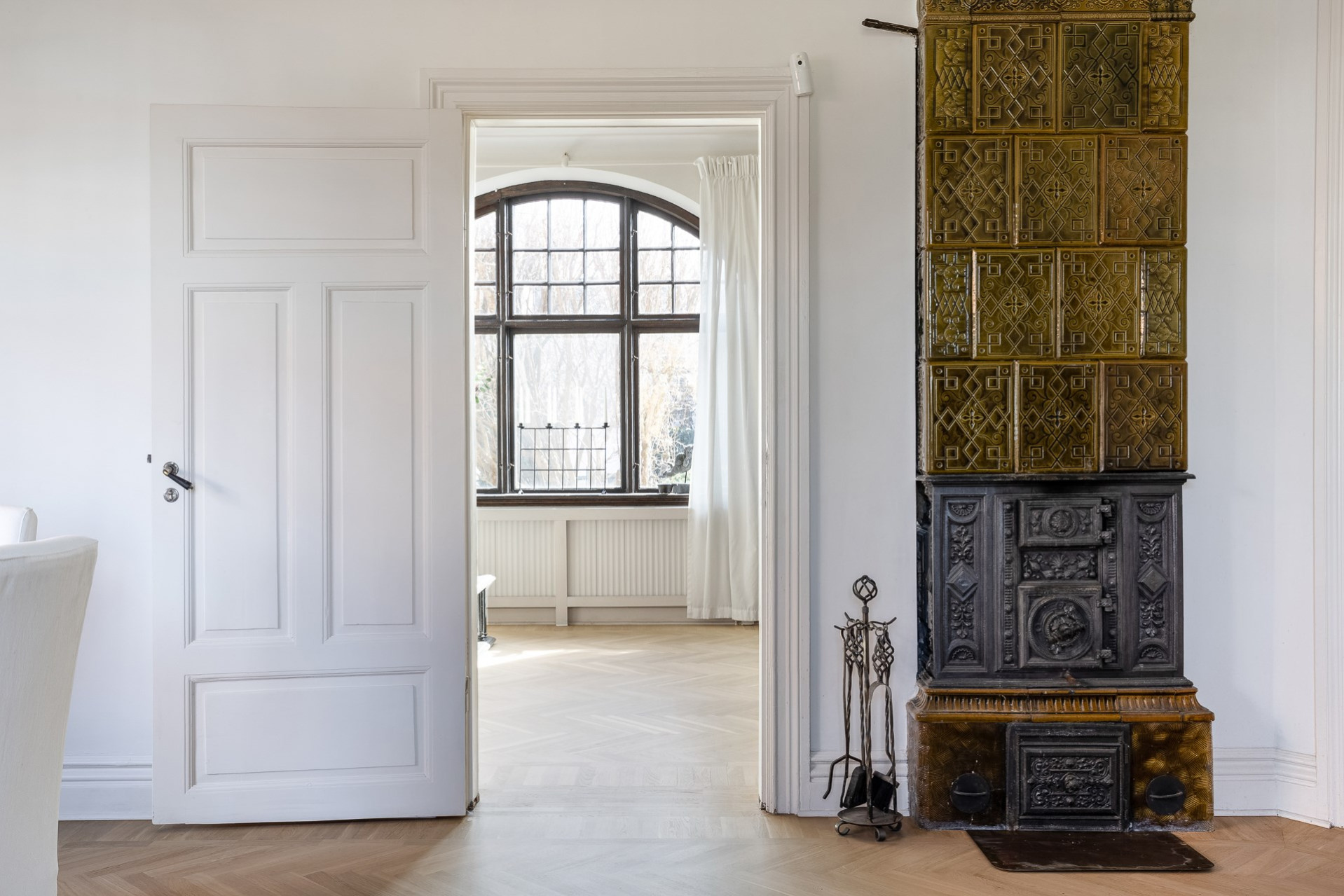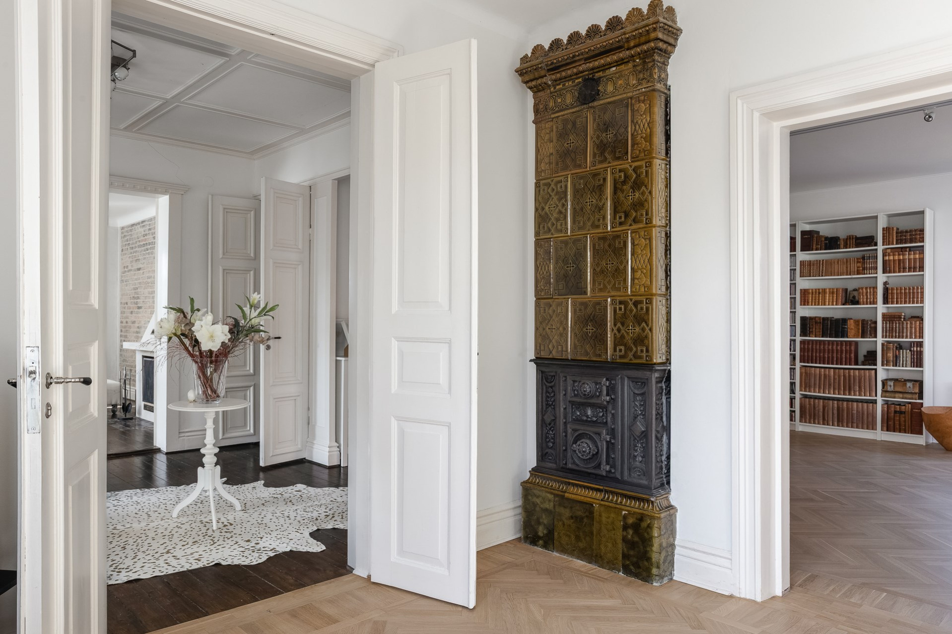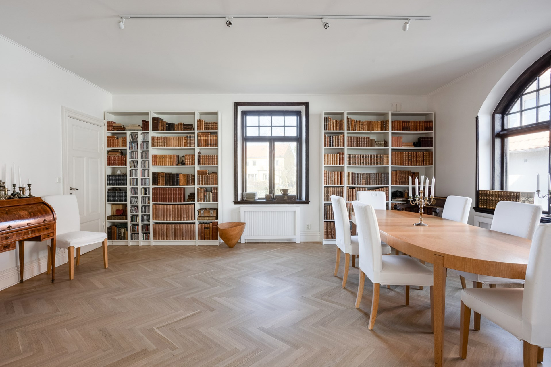 En rejäl matsal som verkligen är värd namnet. Här kommer de största borden i och de vackra materialen är verkligen på sin plats. Kakelugnen har sin plats och köket nås genom serveringsgång.