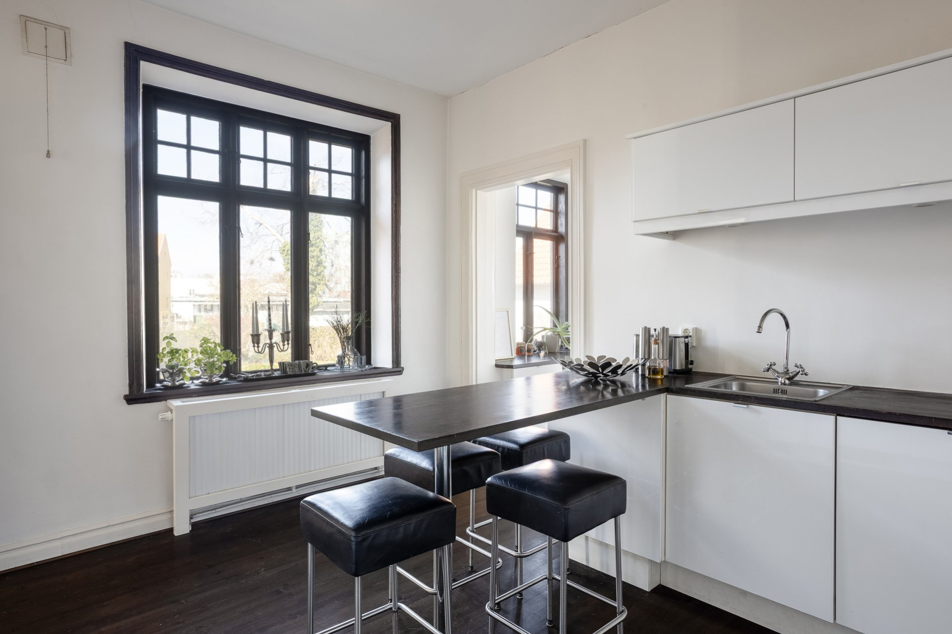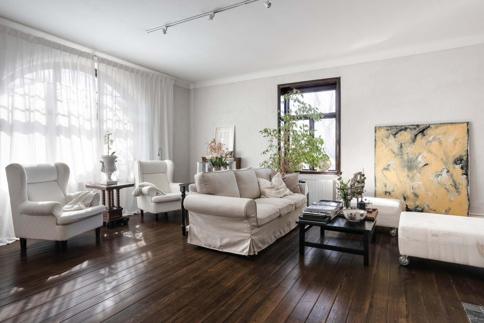 Elegans definieras av en fin tegelvägg med eldstad, stora rundade fönster, och behandlade original golv, fullt av bevarade snickerier. Denna avdelning är rejäl och inbjuder till stora möblemang.