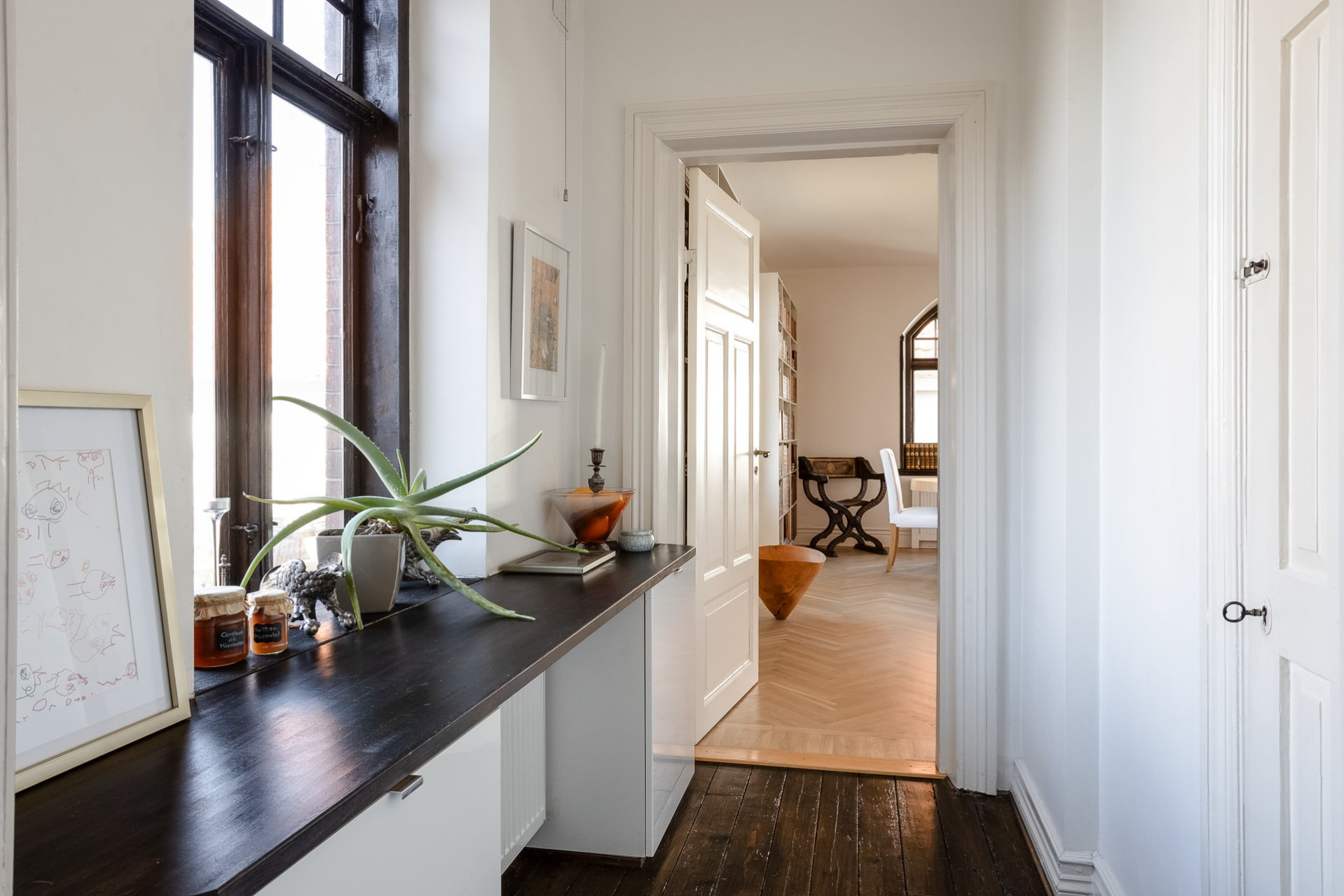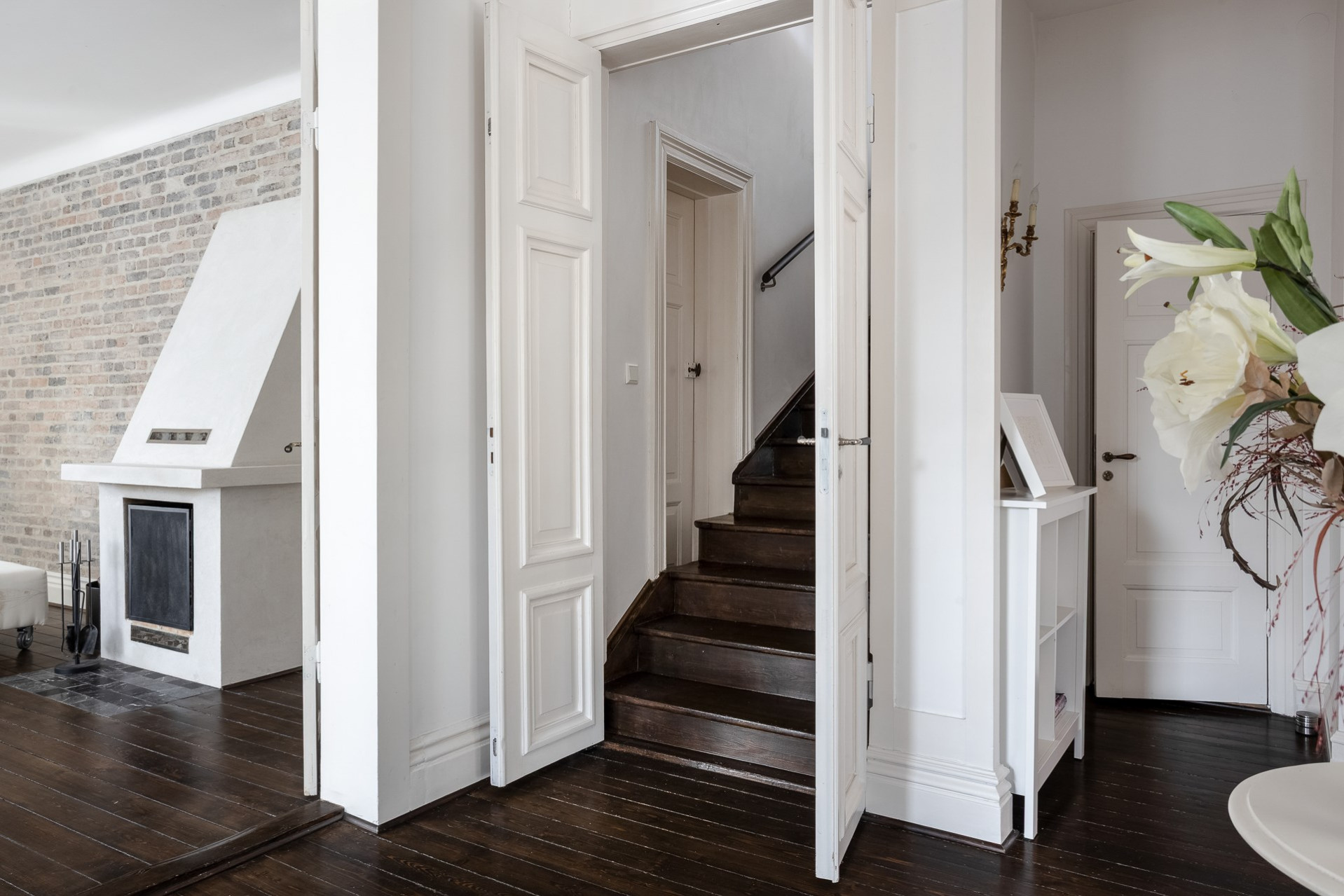 Ovanplans lobby som delar av alla sovrums avdelningarna på ett trevligt vis. Härifrån nås även balkong. Klassiska snickerier, vackra golv, bevarade snickerier och dörrar samt access till ovanplans badrum.