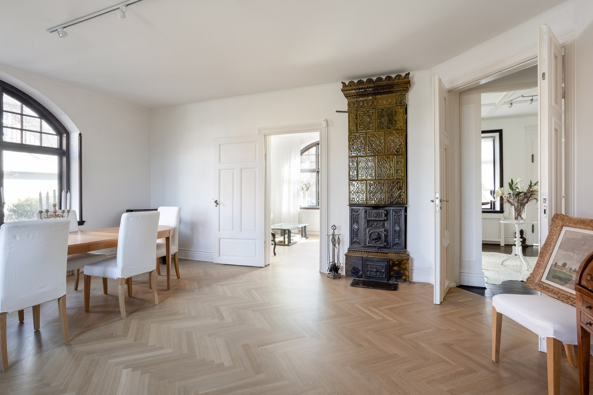 Samma vackra vackra fiskbensparkett som sedan vandrar över in i matsalen. Denna avdelning har en genomgående kakelugn som ger värme i dubbla rum, väldigt trevlig och vacker. Samma vackra rundade fönster ger mycket fint ljusinsläpp. Denna avdelning är perfekt som generös TV-avdelning.