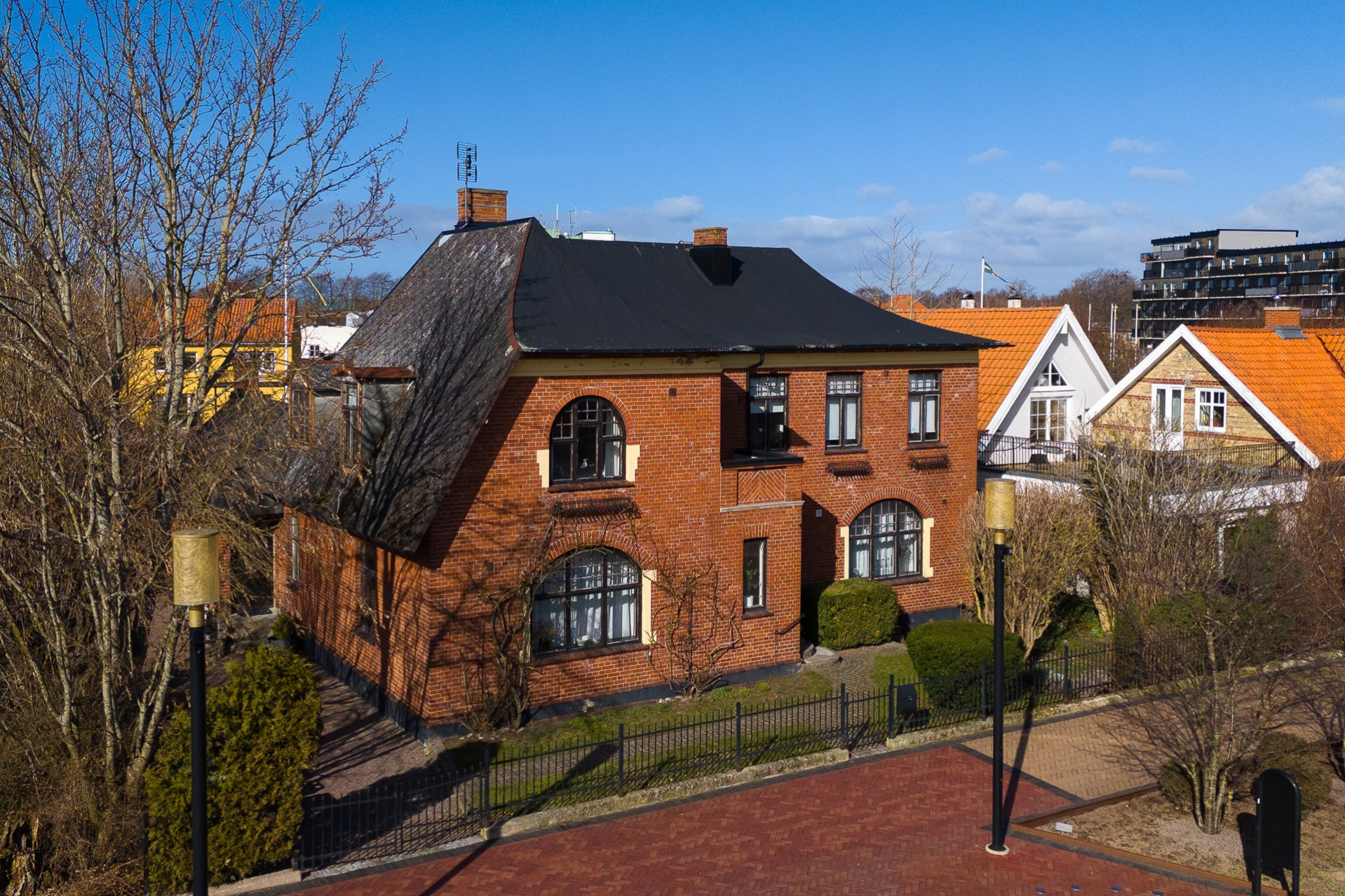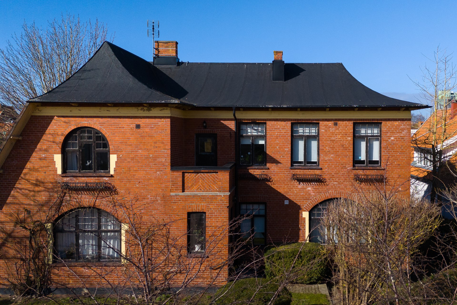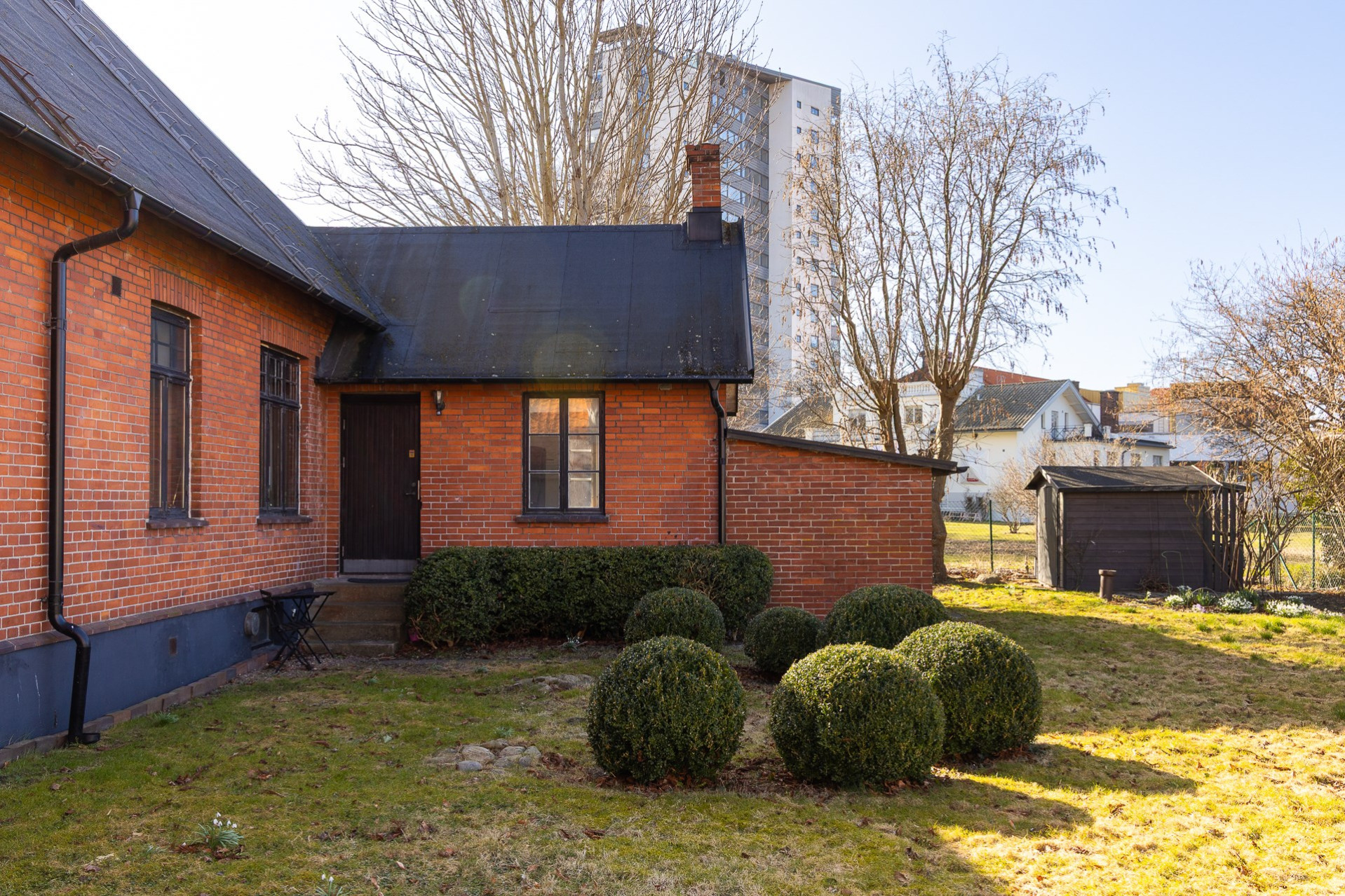 Vacker framsida med smides staket och planteringar. På västra sidan av huset har man en gruslagd uppfart där det tidigare även funnits bygglov för garage. Baksidan erbjuder en fin trädgård med möjligheter att skapa fler uteplatser och en inhängande oas. Här hr man egentligen endast en granne då resterande är gränser är trädgårdar eller parkytor. Mindre förråd för cyklar finne även här.