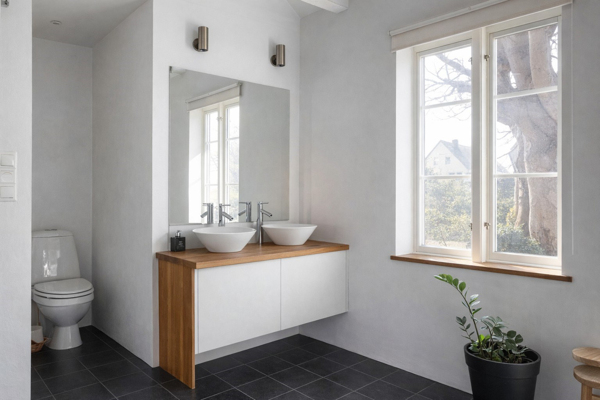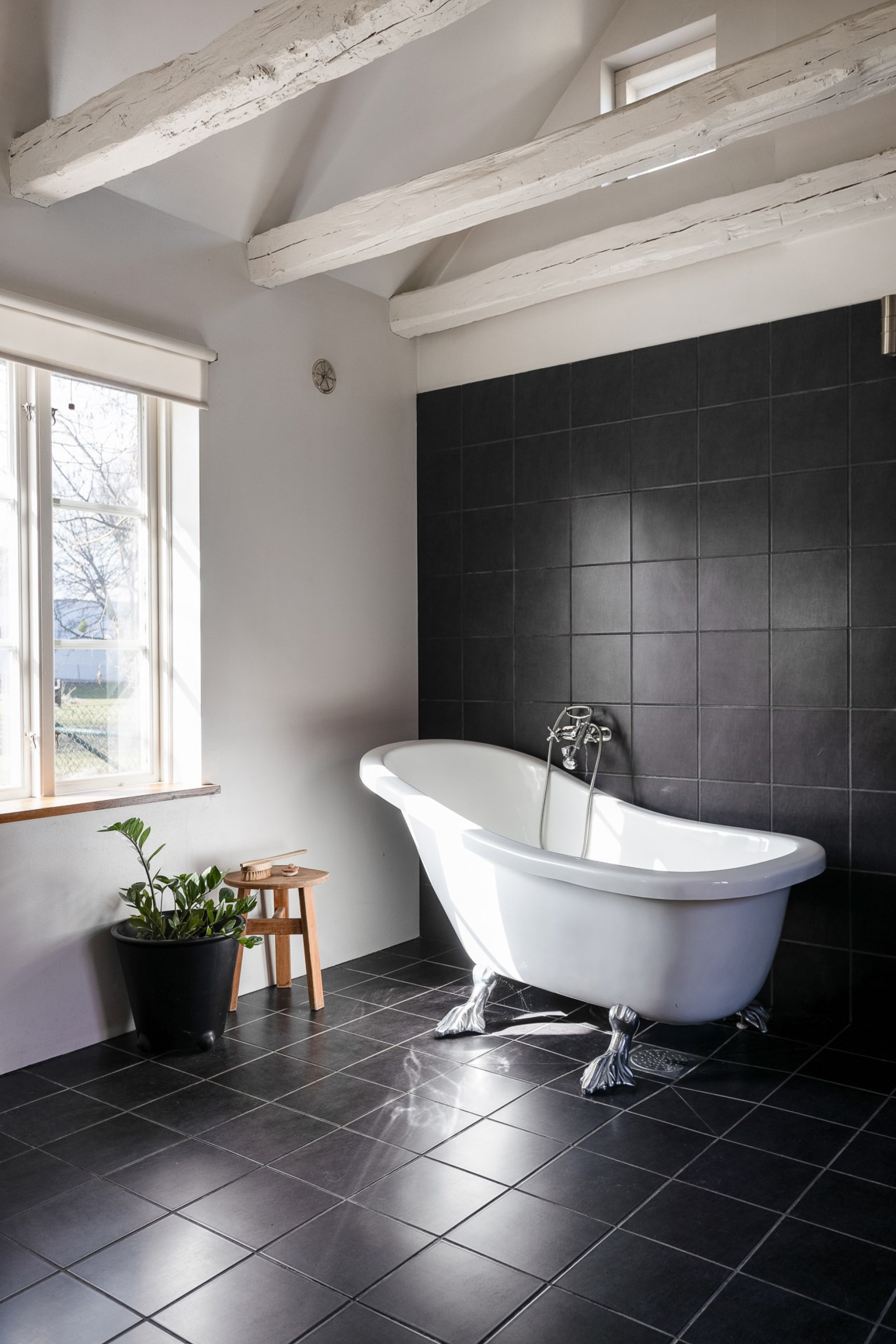 Stort och härligt badrum där man låtit öppna upp i nock. Kakel och klinker i mörkgrå kulörer samt inrett med både dusch och badkar. Dubbel kommod, toalett, trevlig belysning och självklar golvvärme.