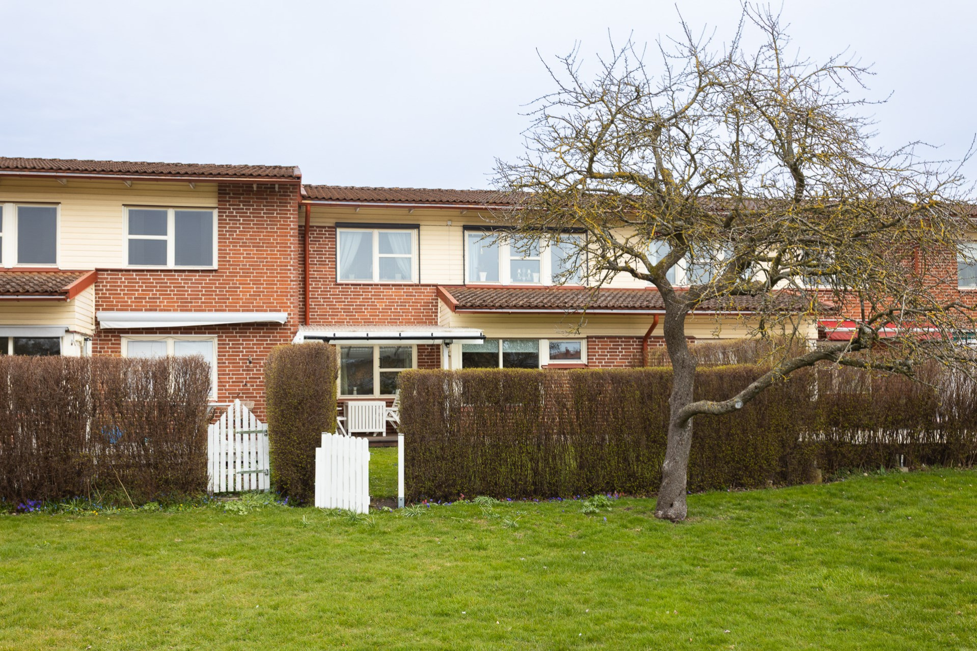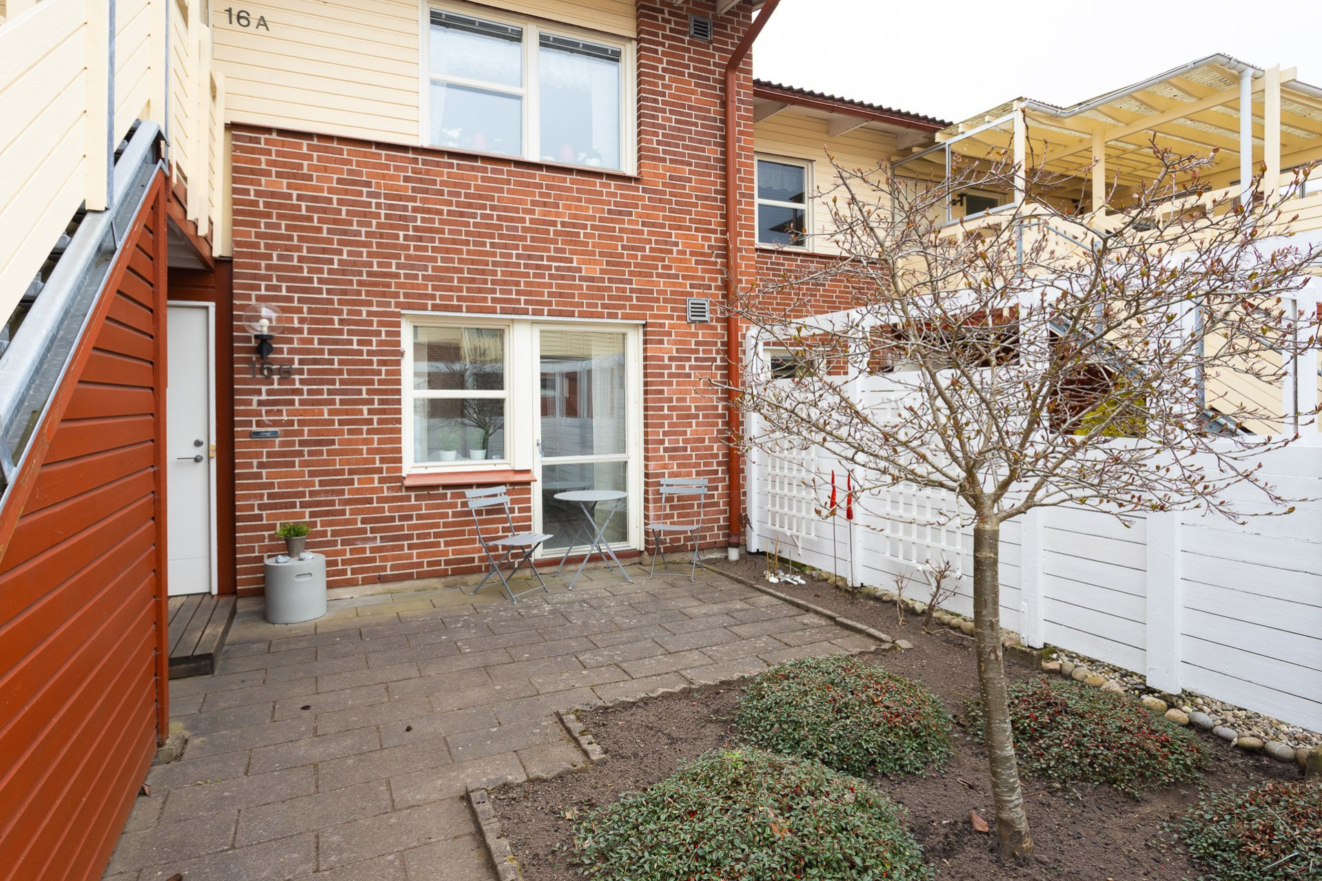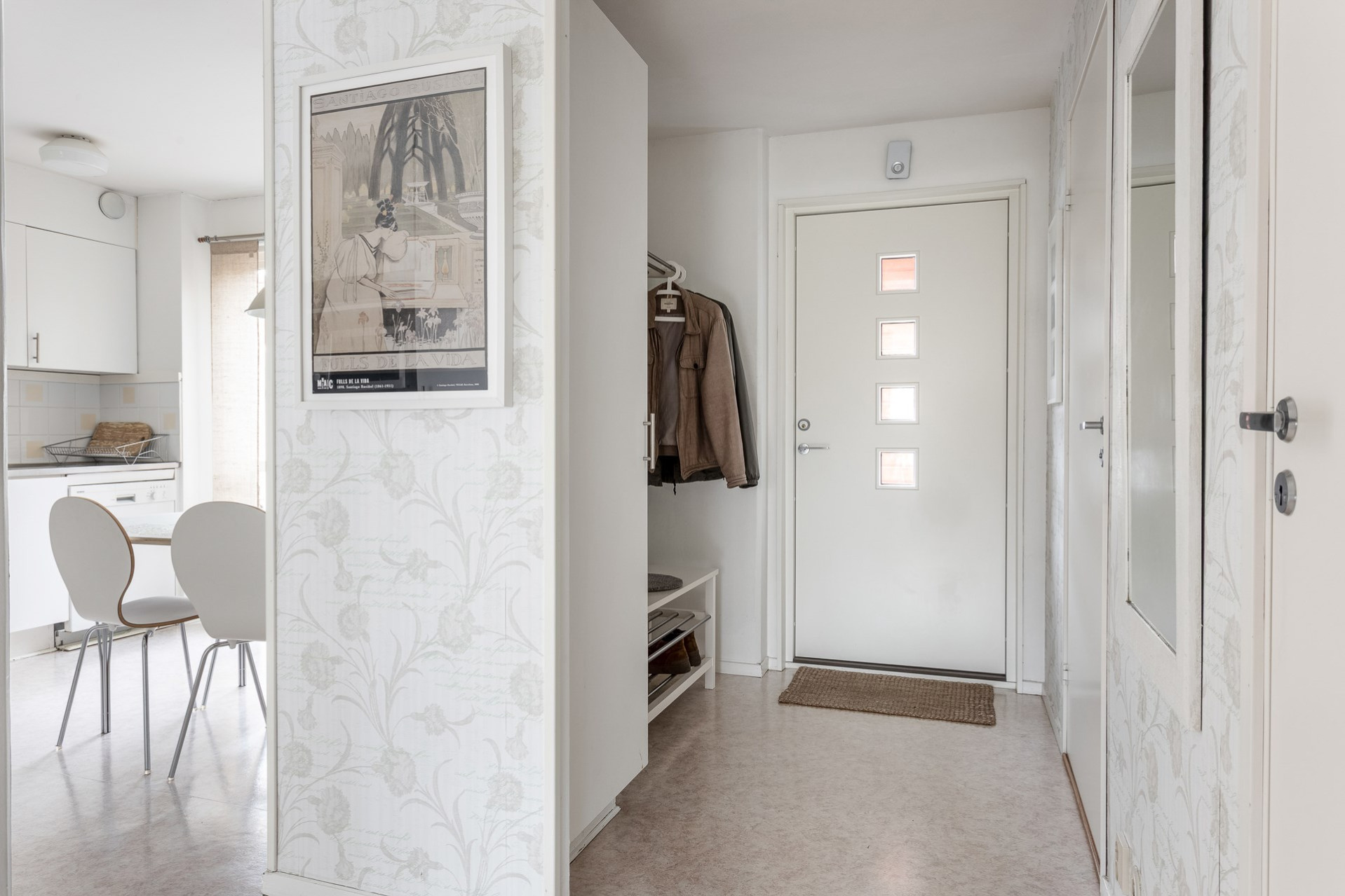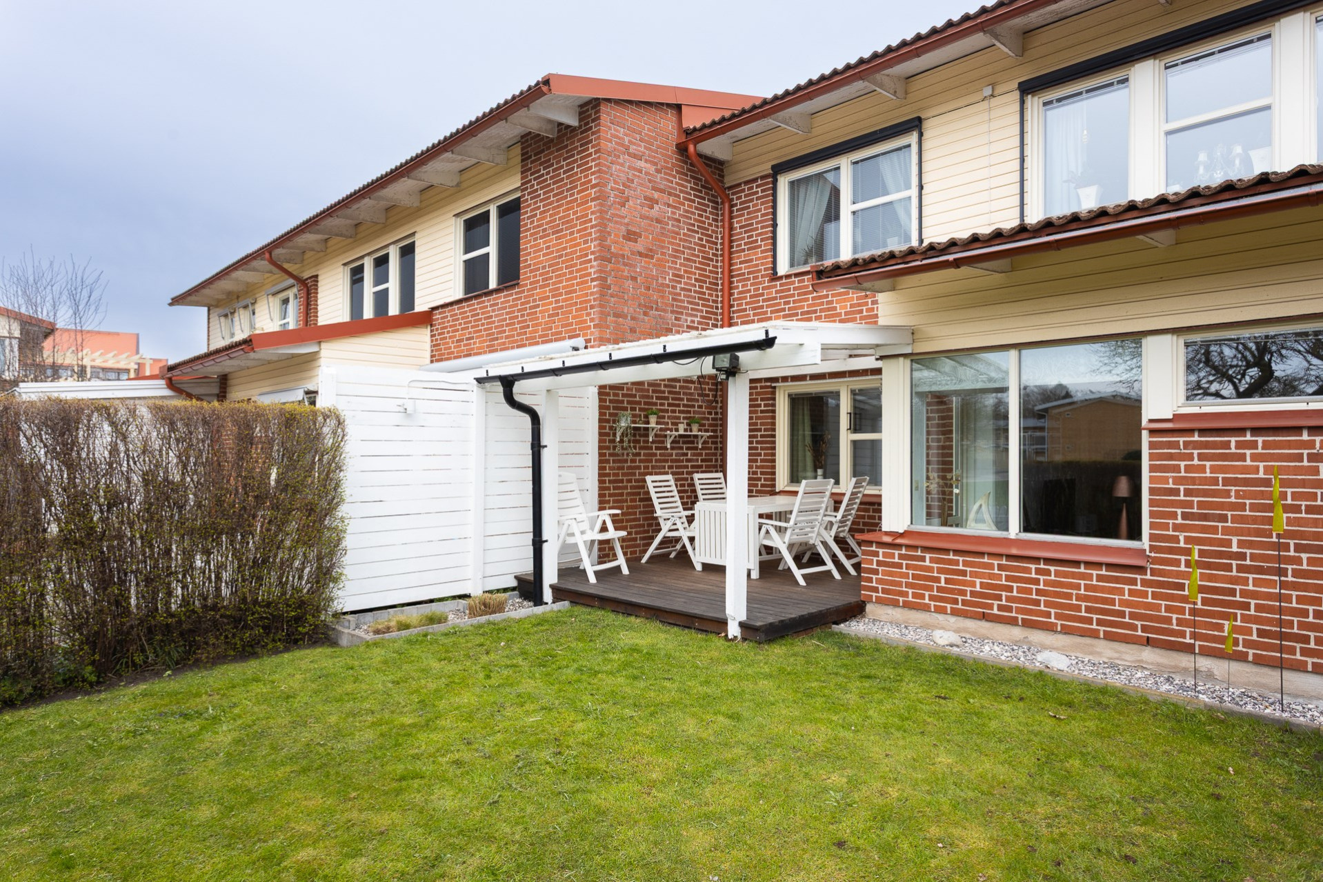 Innan vi stiger in i bostaden står vi på entrésidans stenlagda uteplats där även lite grönska ger ett mysigt första intryck. Här nås dessutom bostadens förråd. In genom ytterdörren så möts vi av en ljus och välkomnande hall där man har plats för avhängning samt förvaring via garderob samt en generös klädkämmare. Vid entrén nås även det stilfulla och helkaklade badrummet som renoverades 2019. Här finns även tvättmöjligheter med tvttmaskin och torktumlare som också förnyades 2019. Tillbaka in kommer vi till köket som är välplanerat och funktionellt med gott om skåpsförvaring och en bra matplats. Från köket kan man gå ut till entrésidans uteplats som är perfekt för morgonkaffet i solen. I angränsning till köket finns ett rymligt sovrum som har fönster mot trädgården. Här finns gott om plats för att exempelvis skapa mer förvaring om så önskas eller så har man som nuvarande ägare en arbetsplats. Bostadens vardagsrum är även det stort och här kan man ha både matsalsmöber och soffa. Fönster mot den inbjudande trädgården samt altandörr som leder ut till det äverbyggda trädäcket. Utöver det har man en gräsmatta som badar i sol och en grind leder vidare ut till grönområdet utanför. Det blir inte bättre än så här.