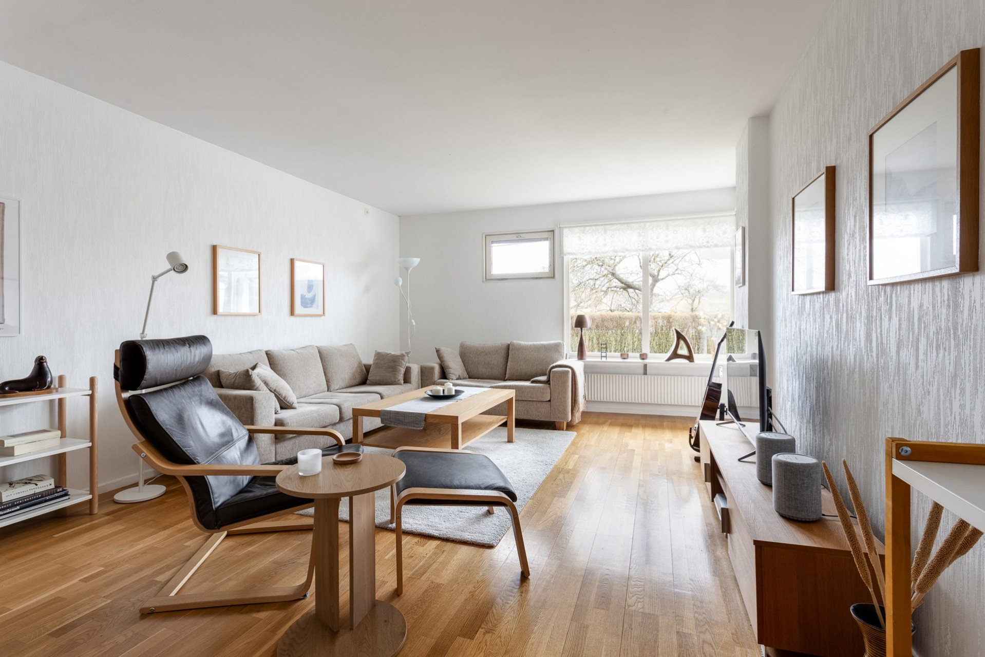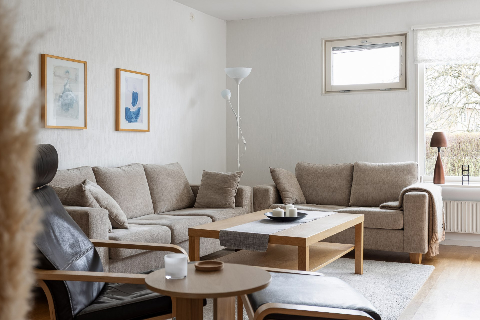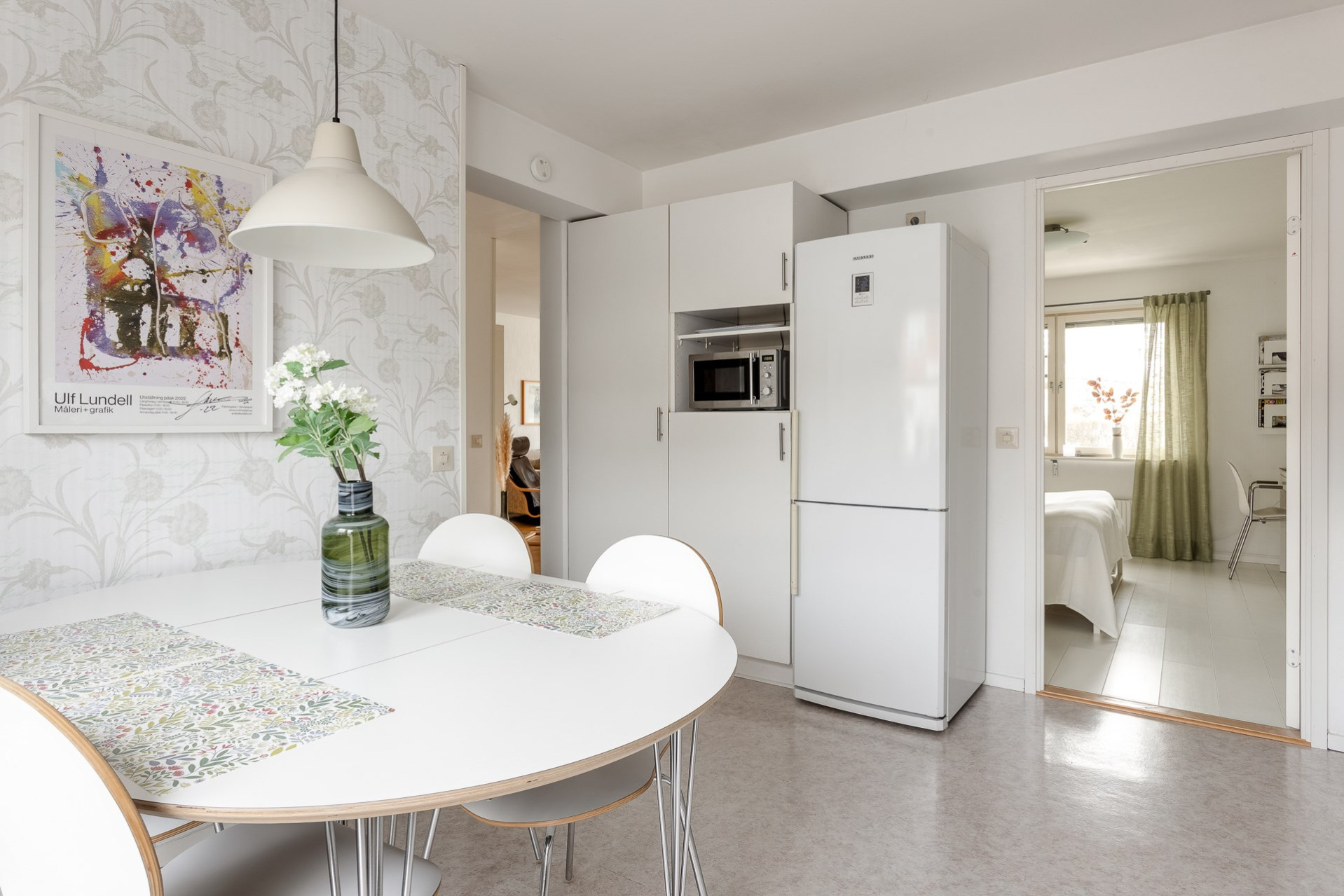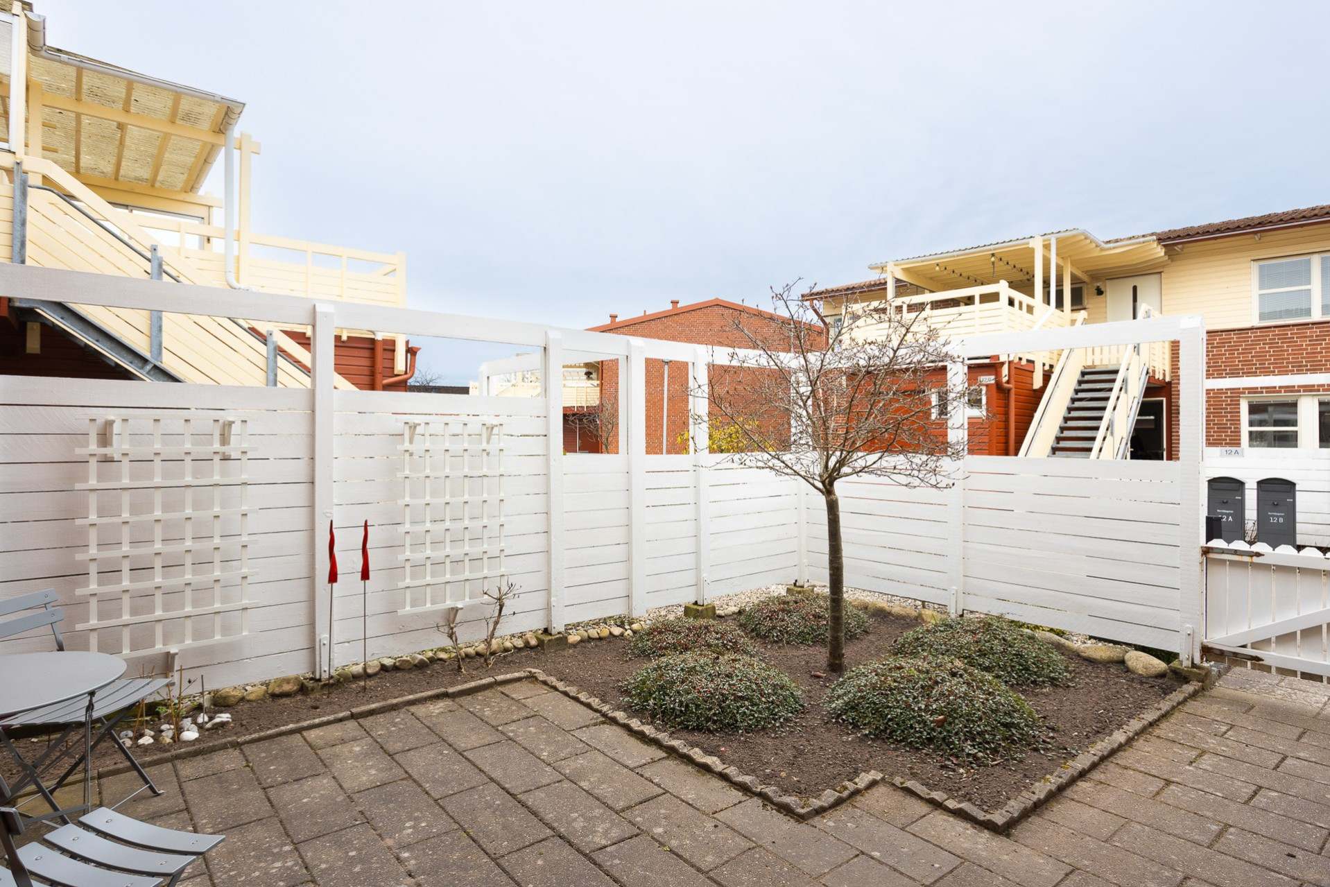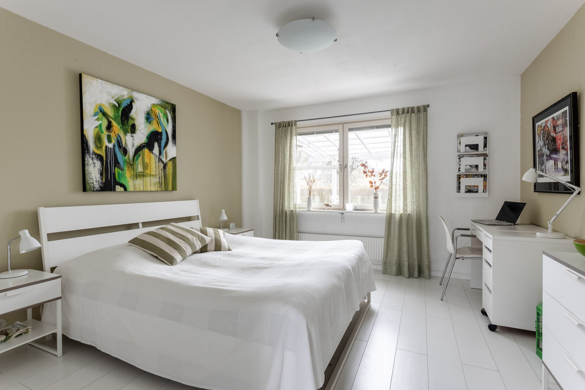 Innan vi stiger in i bostaden står vi på entrésidans stenlagda uteplats där även lite grönska ger ett mysigt första intryck. Här nås dessutom bostadens förråd. In genom ytterdörren så möts vi av en ljus och välkomnande hall där man har plats för avhängning samt förvaring via garderob samt en generös klädkämmare. Vid entrén nås även det stilfulla och helkaklade badrummet som renoverades 2019. Här finns även tvättmöjligheter med tvttmaskin och torktumlare som också förnyades 2019. Tillbaka in kommer vi till köket som är välplanerat och funktionellt med gott om skåpsförvaring och en bra matplats. Från köket kan man gå ut till entrésidans uteplats som är perfekt för morgonkaffet i solen. I angränsning till köket finns ett rymligt sovrum som har fönster mot trädgården. Här finns gott om plats för att exempelvis skapa mer förvaring om så önskas eller så har man som nuvarande ägare en arbetsplats. Bostadens vardagsrum är även det stort och här kan man ha både matsalsmöber och soffa. Fönster mot den inbjudande trädgården samt altandörr som leder ut till det äverbyggda trädäcket. Utöver det har man en gräsmatta som badar i sol och en grind leder vidare ut till grönområdet utanför. Det blir inte bättre än så här.
