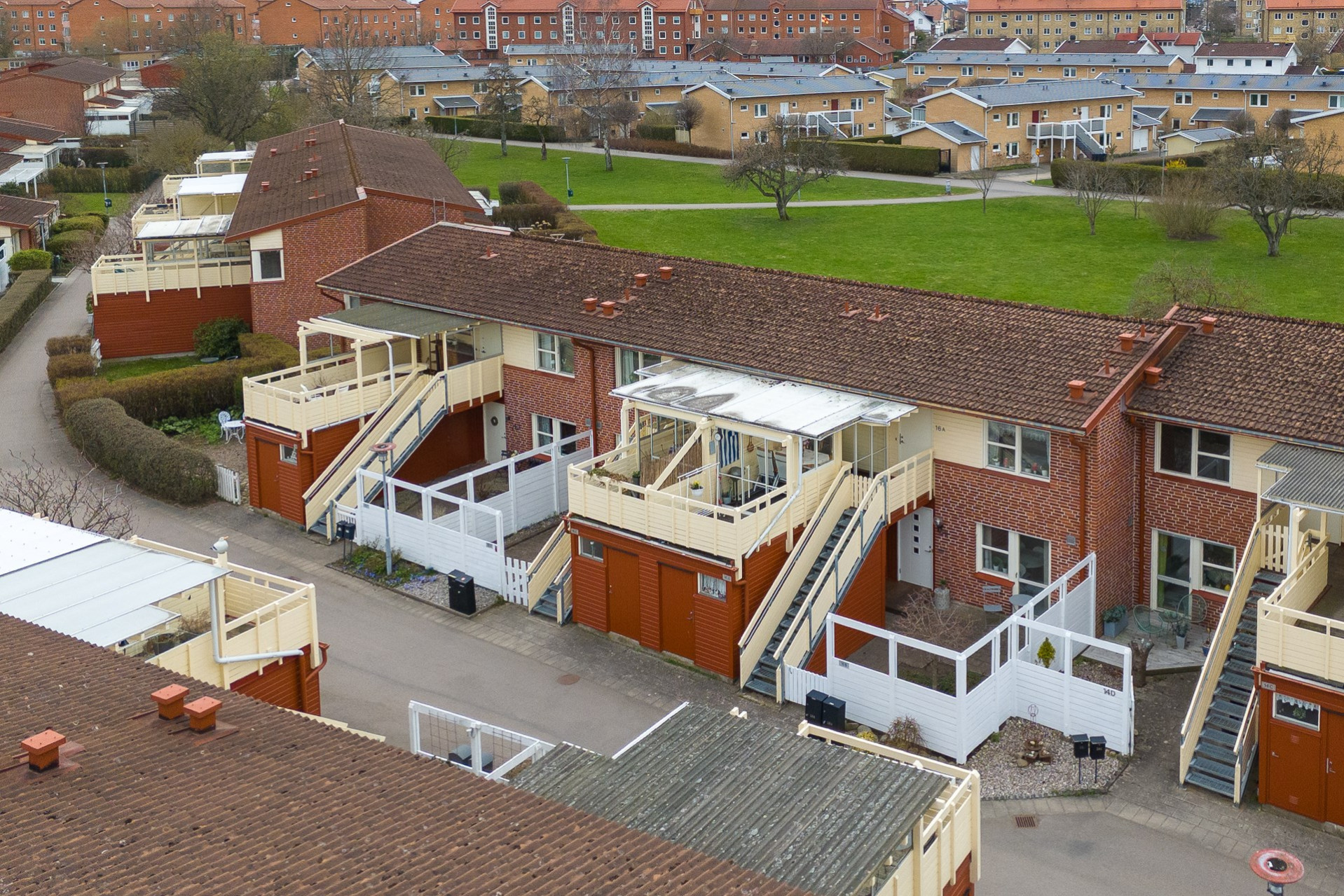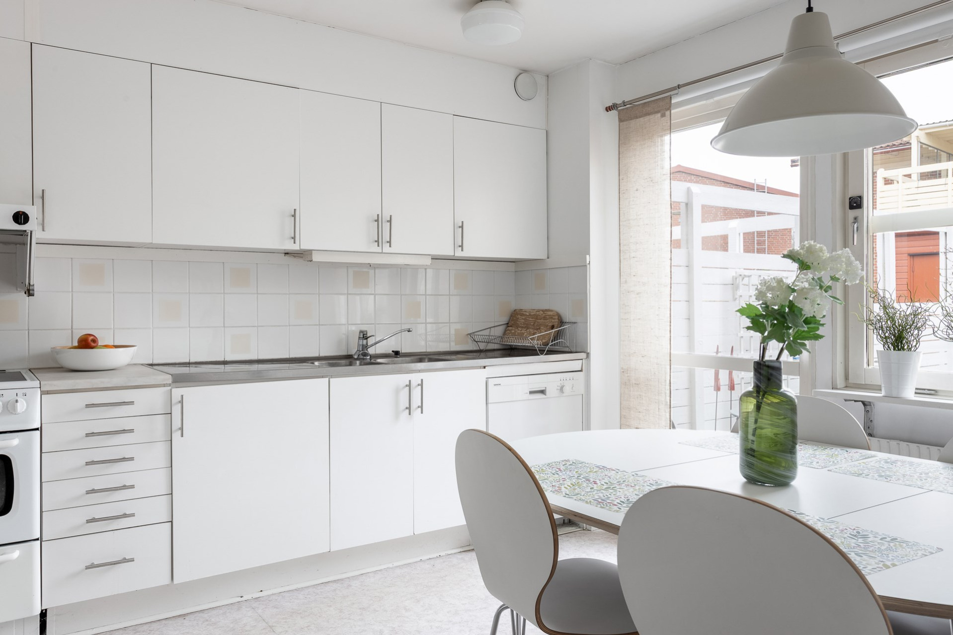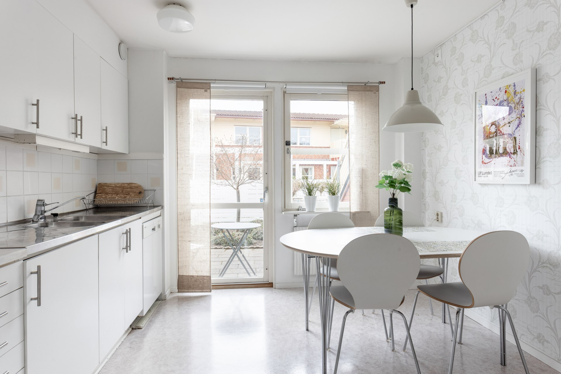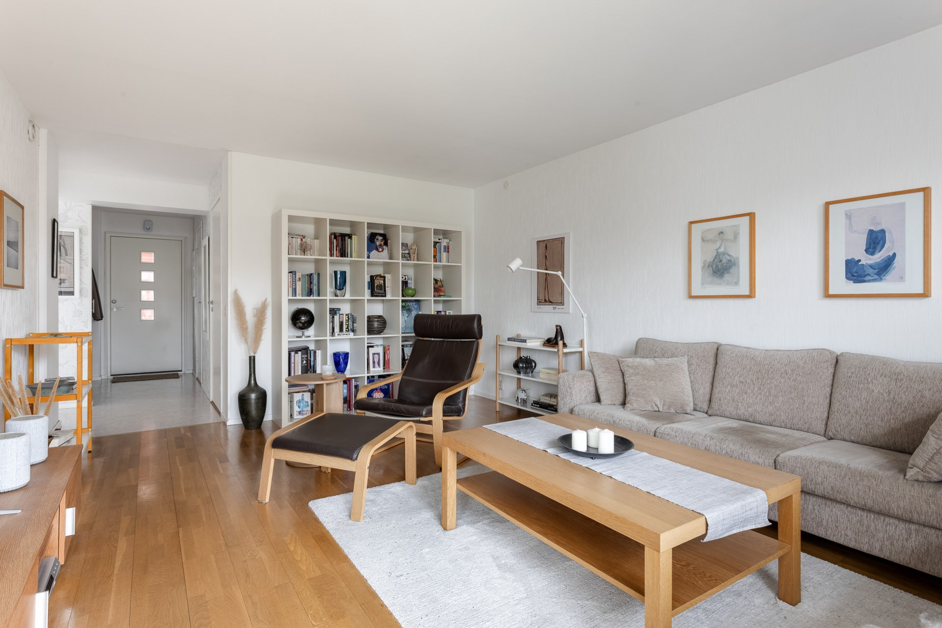 Innan vi stiger in i bostaden står vi på entrésidans stenlagda uteplats där även lite grönska ger ett mysigt första intryck. Här nås dessutom bostadens förråd. In genom ytterdörren så möts vi av en ljus och välkomnande hall där man har plats för avhängning samt förvaring via garderob samt en generös klädkämmare. Vid entrén nås även det stilfulla och helkaklade badrummet som renoverades 2019. Här finns även tvättmöjligheter med tvttmaskin och torktumlare som också förnyades 2019. Tillbaka in kommer vi till köket som är välplanerat och funktionellt med gott om skåpsförvaring och en bra matplats. Från köket kan man gå ut till entrésidans uteplats som är perfekt för morgonkaffet i solen. I angränsning till köket finns ett rymligt sovrum som har fönster mot trädgården. Här finns gott om plats för att exempelvis skapa mer förvaring om så önskas eller så har man som nuvarande ägare en arbetsplats. Bostadens vardagsrum är även det stort och här kan man ha både matsalsmöber och soffa. Fönster mot den inbjudande trädgården samt altandörr som leder ut till det äverbyggda trädäcket. Utöver det har man en gräsmatta som badar i sol och en grind leder vidare ut till grönområdet utanför. Det blir inte bättre än så här.